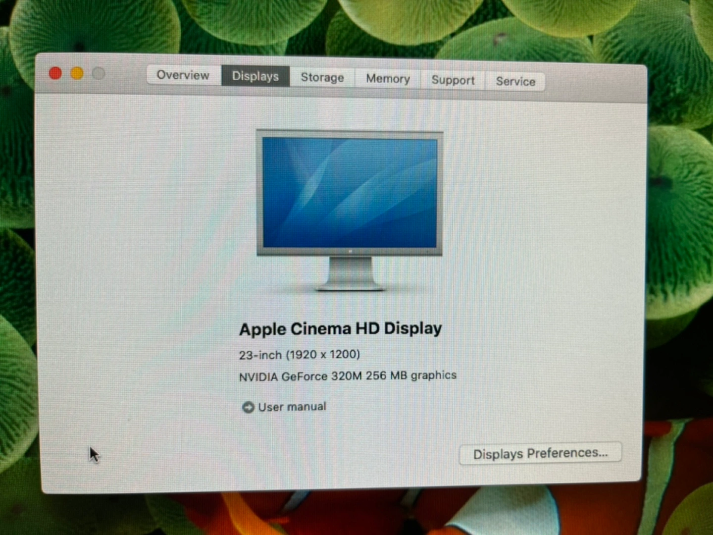 Excellent 23-inch LED-backlit Apple Cinema Display. 1920 x 1200 resolution. NVIDIA GeForce 320M graphics. Includes power cable.