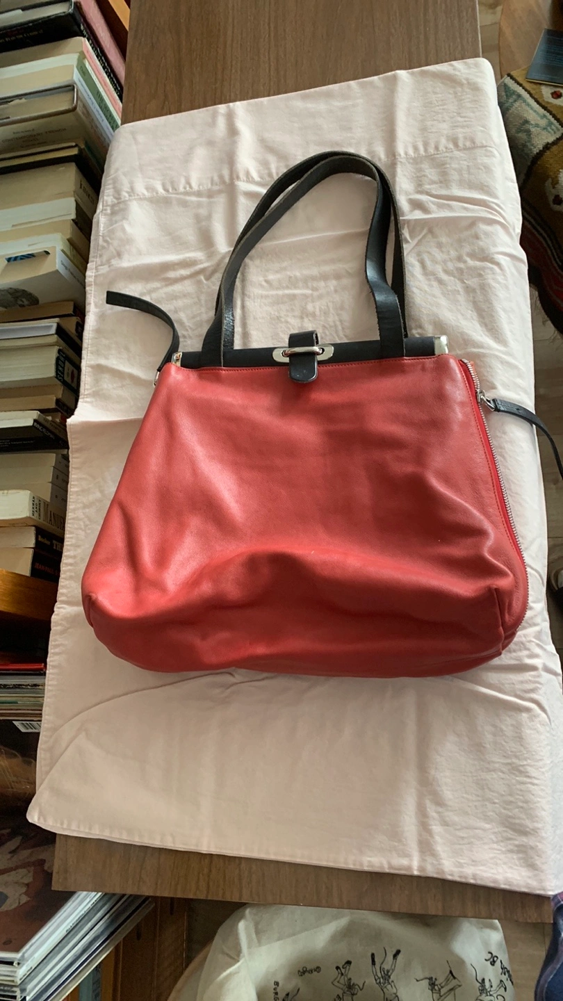 Large tote bag. Red leather exterior with black leather accents. Top handles. Zip closure. Interior pocket. Silver-toned hardware.