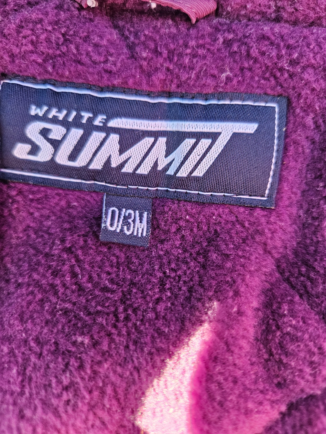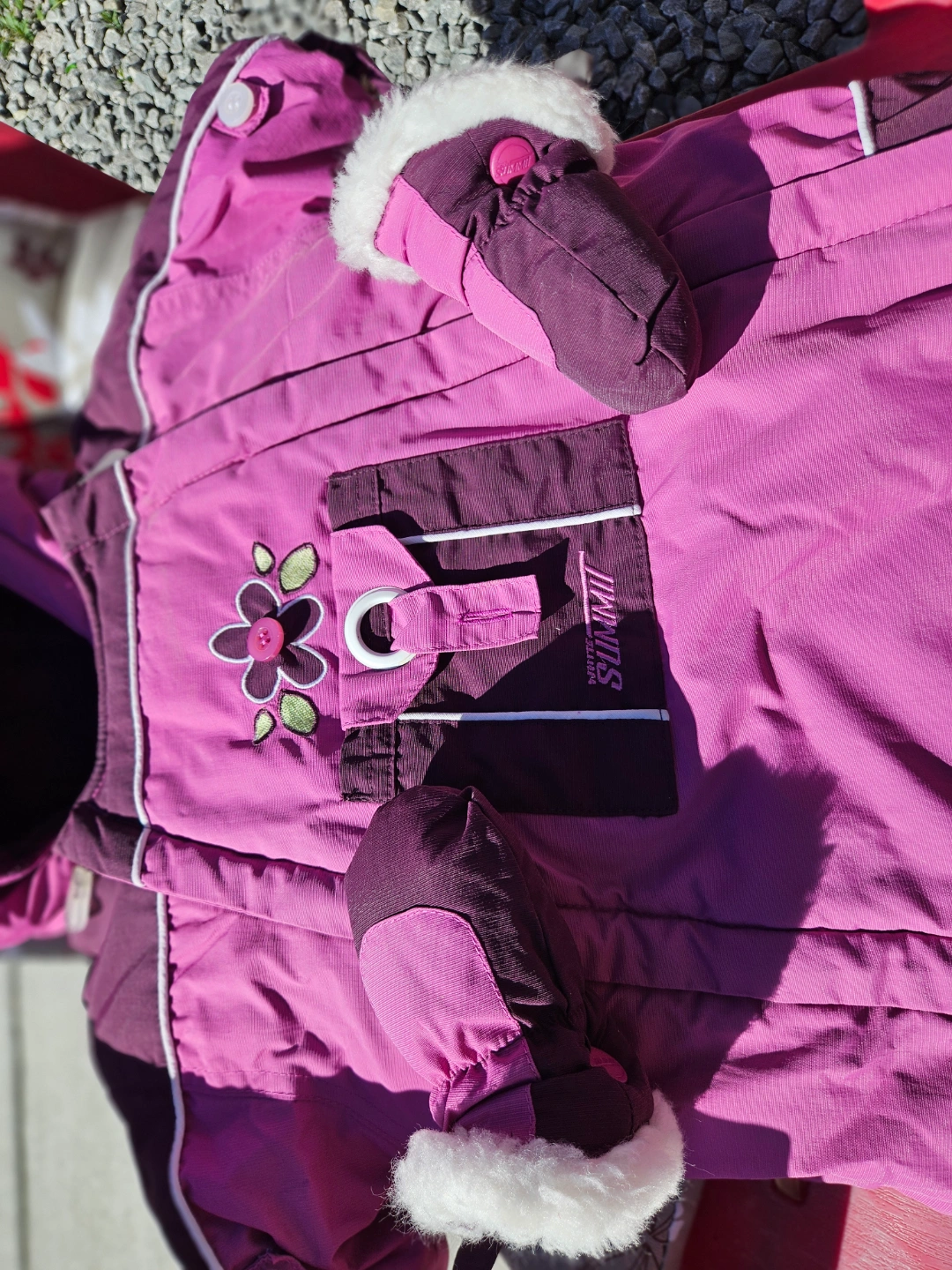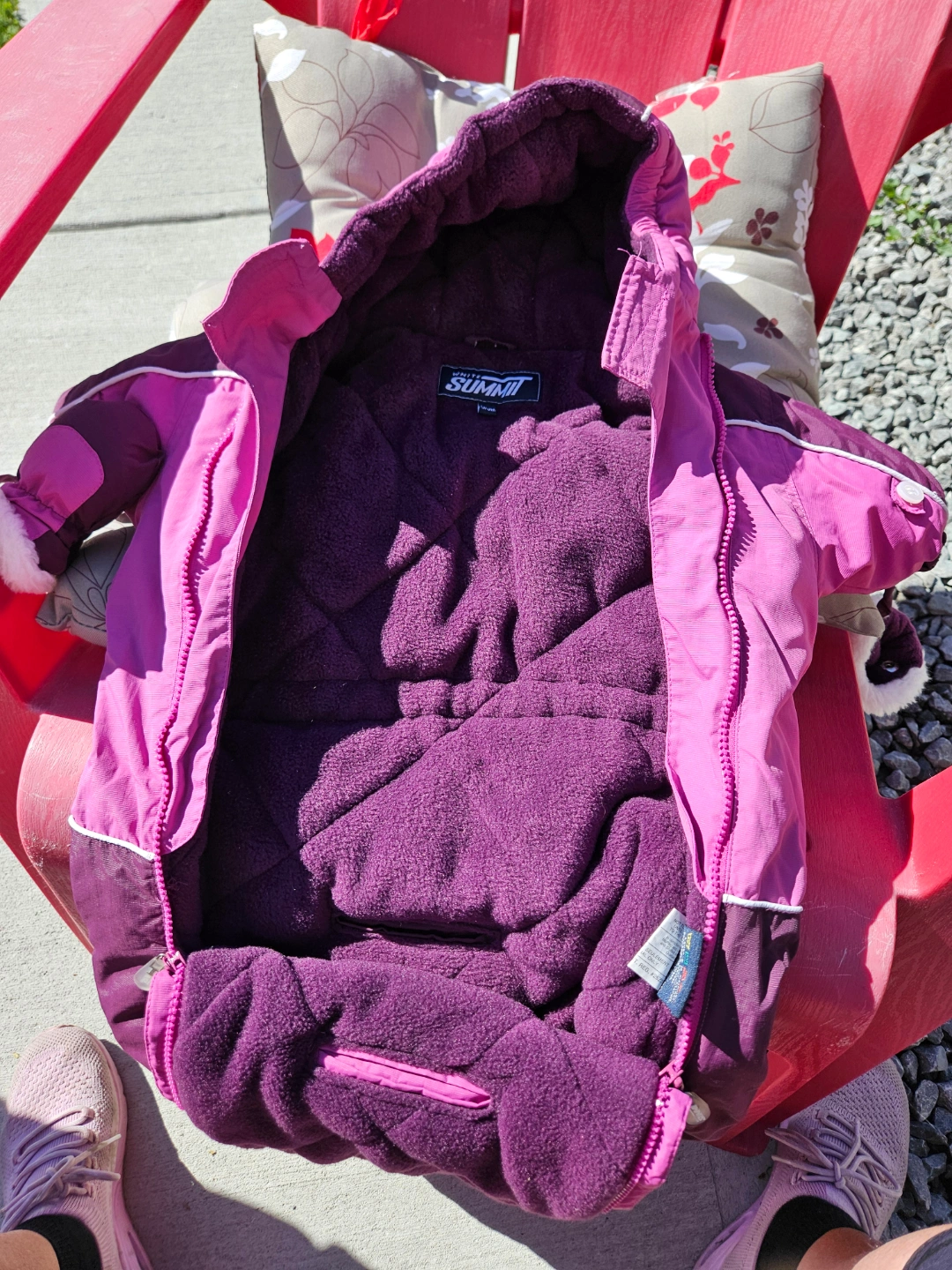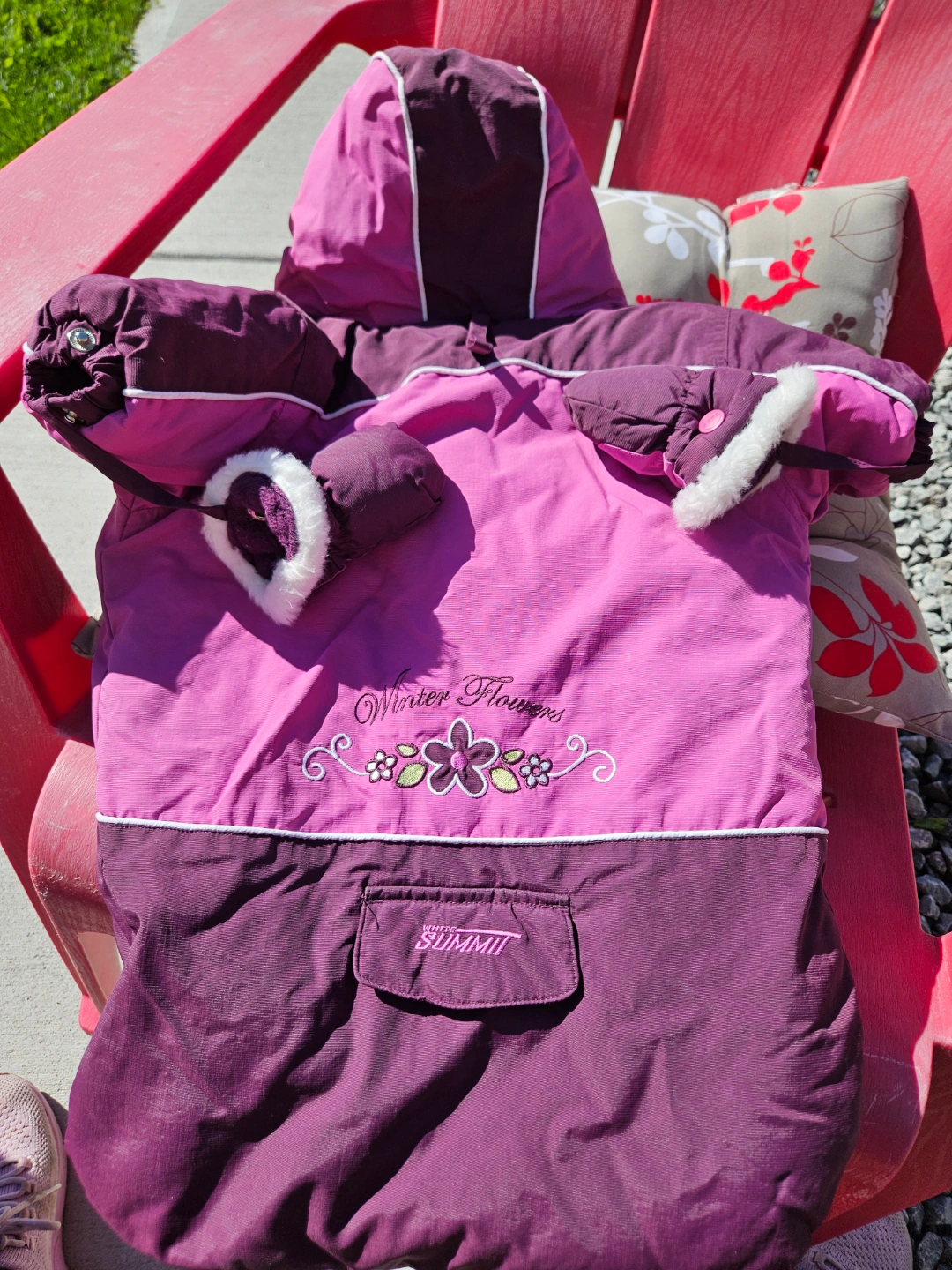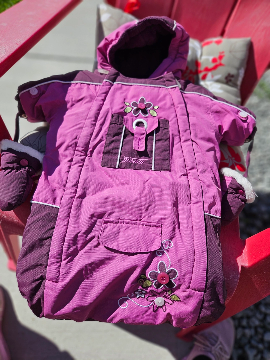 940Adorable purple and pink baby snowsuit. Size 0-3 months. Features attached mittens and a hood. Embroidered flowers on the front. Zipper closure. Sfpf Oshawa Harmony Road South at 401