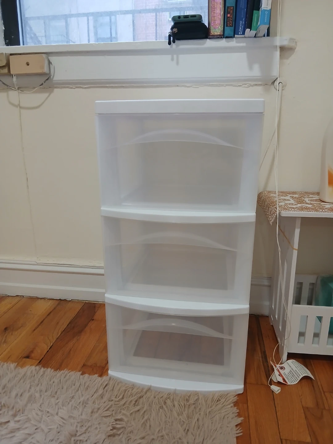 I'm selling a white storage tower with three drawers! It's perfect for organizing clothes, toys, or anything else you need to store. It's in great condition and ready for a new home