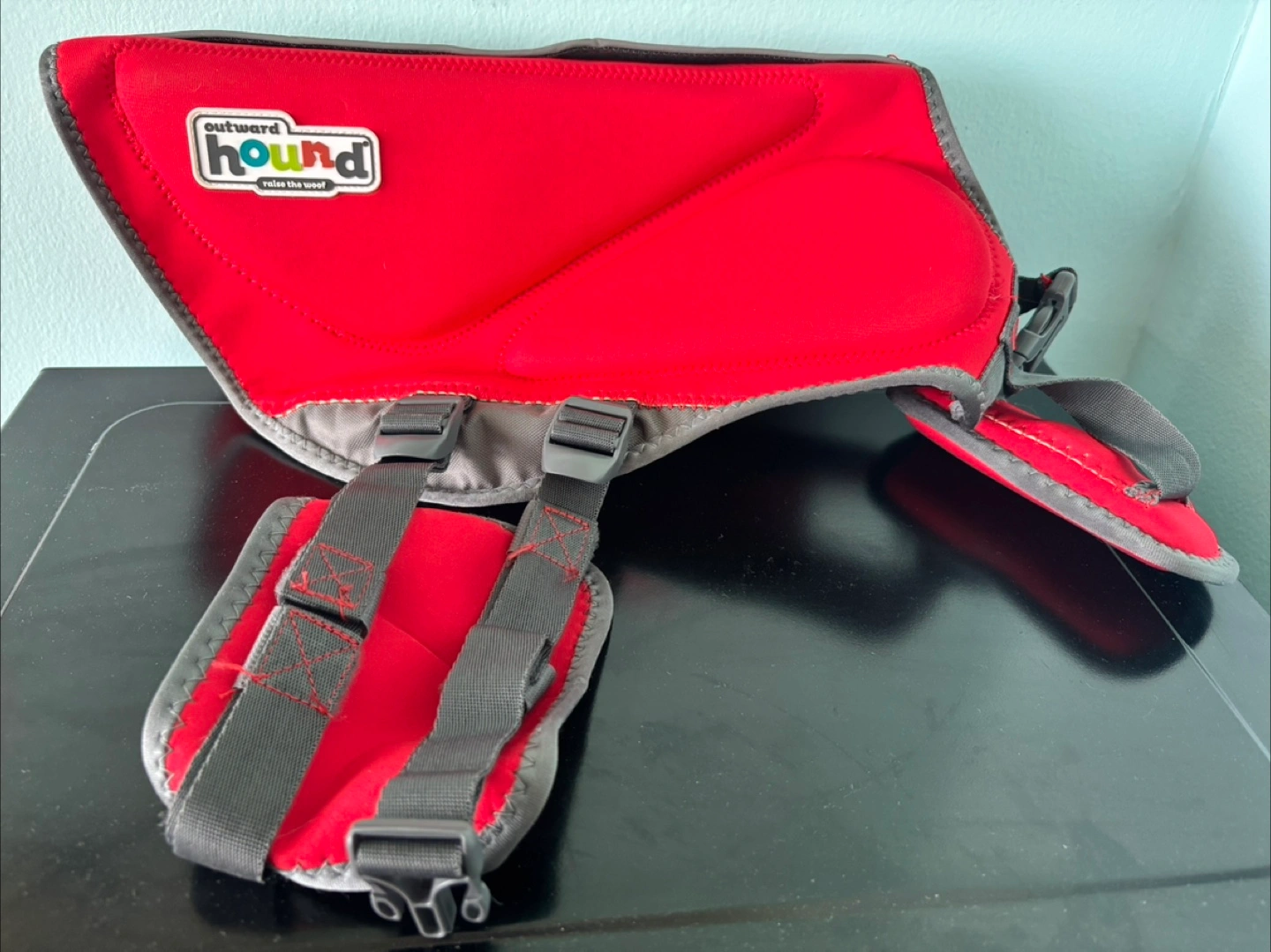 Red dog life jacket. Size large. Features rescue handles, ripstop material, reflective elements, and maximum buoyancy. Insulating neoprene material. Sleek, sporty fit. Front float for head and neck support. Supportive belly band. Bought from chewy.com for $55. Never used. Out of box but excellent condition.