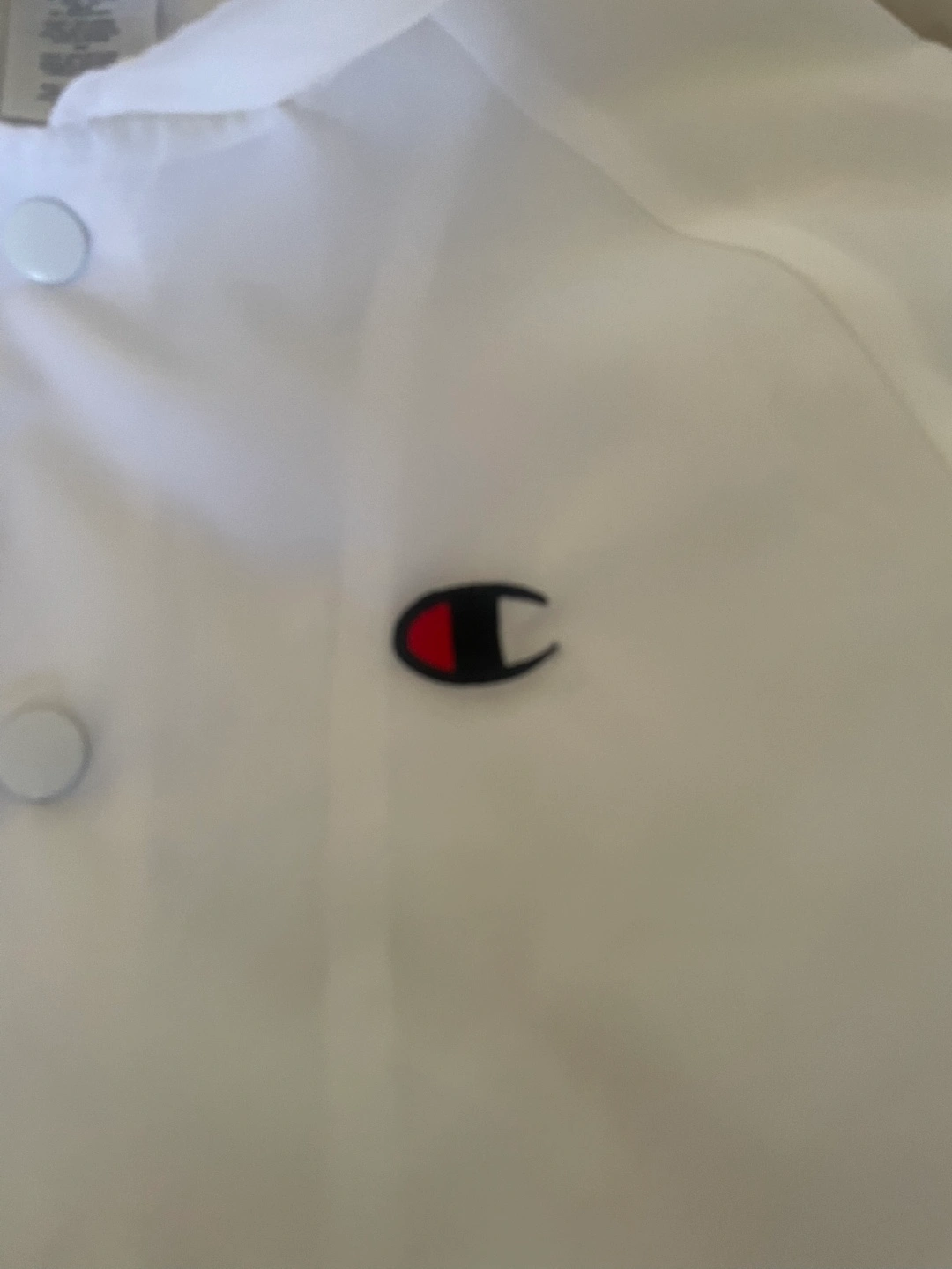 White Champion coaches jacket. X-Small size. Snap button closure. Long sleeves. Polyester body, cotton lining. Made in Vietnam.