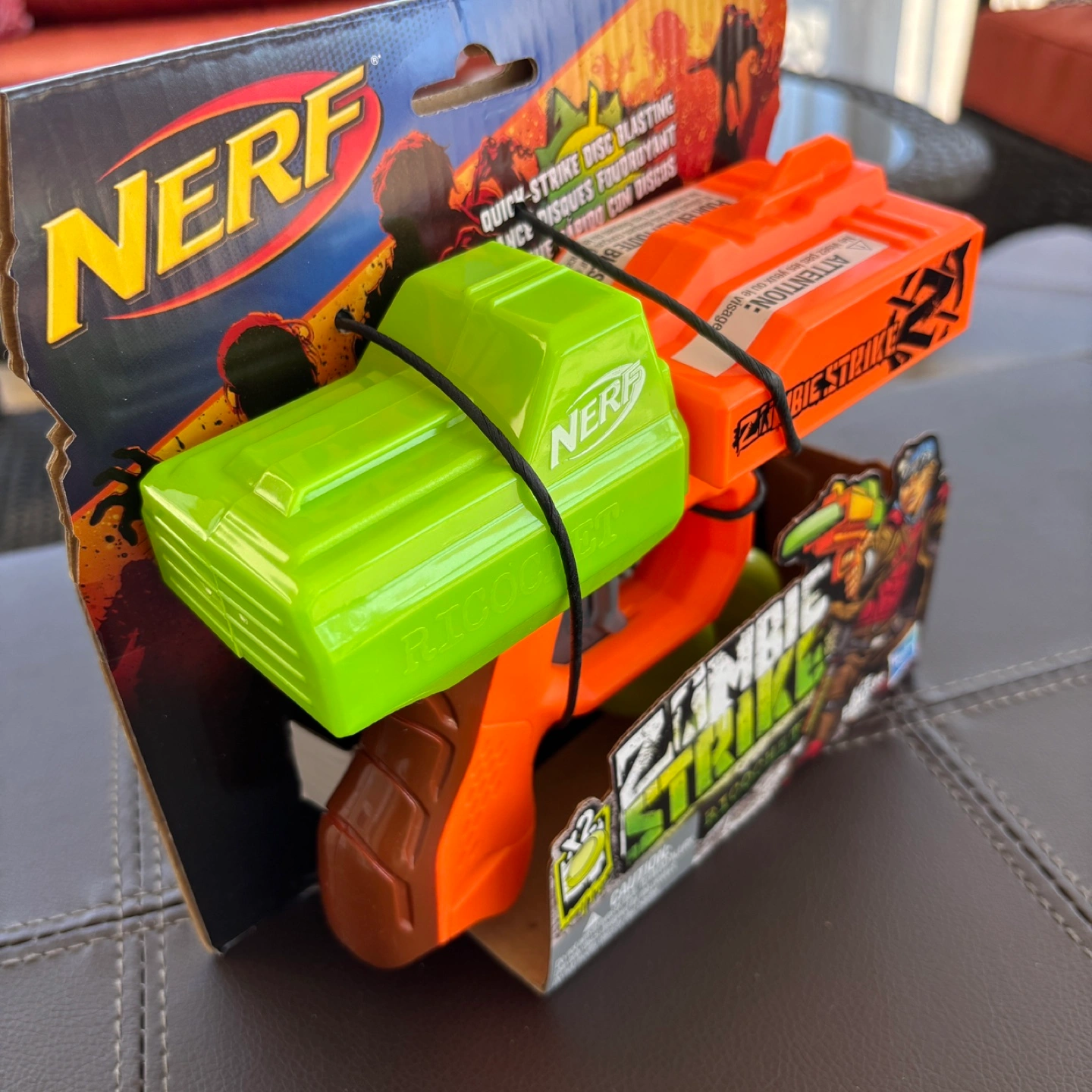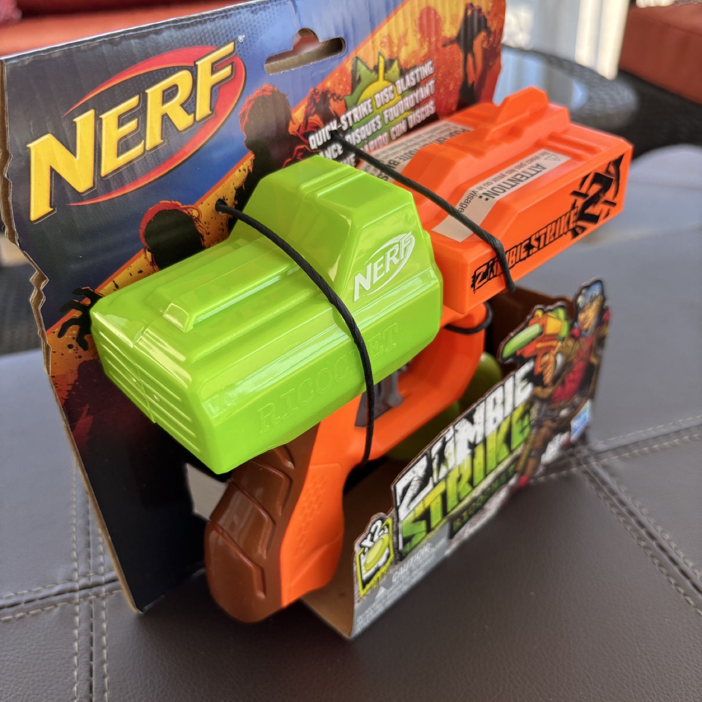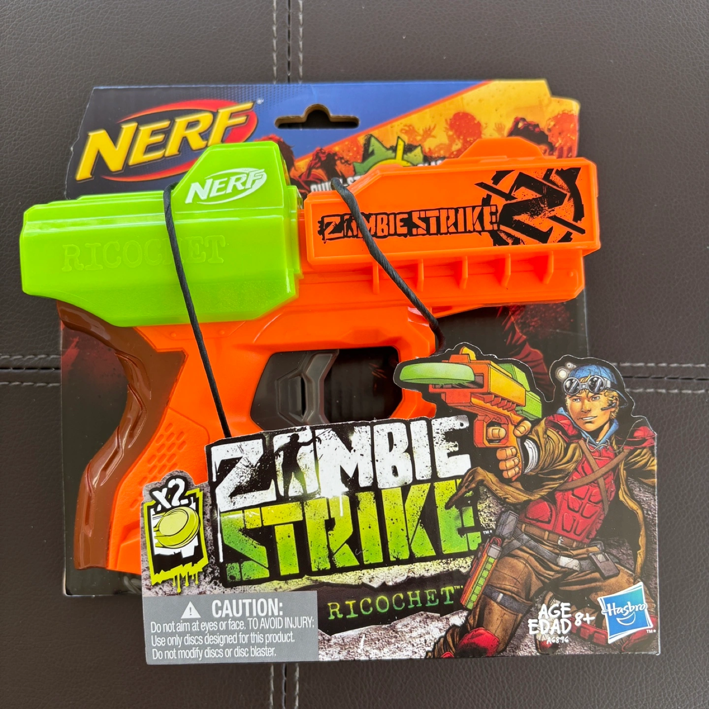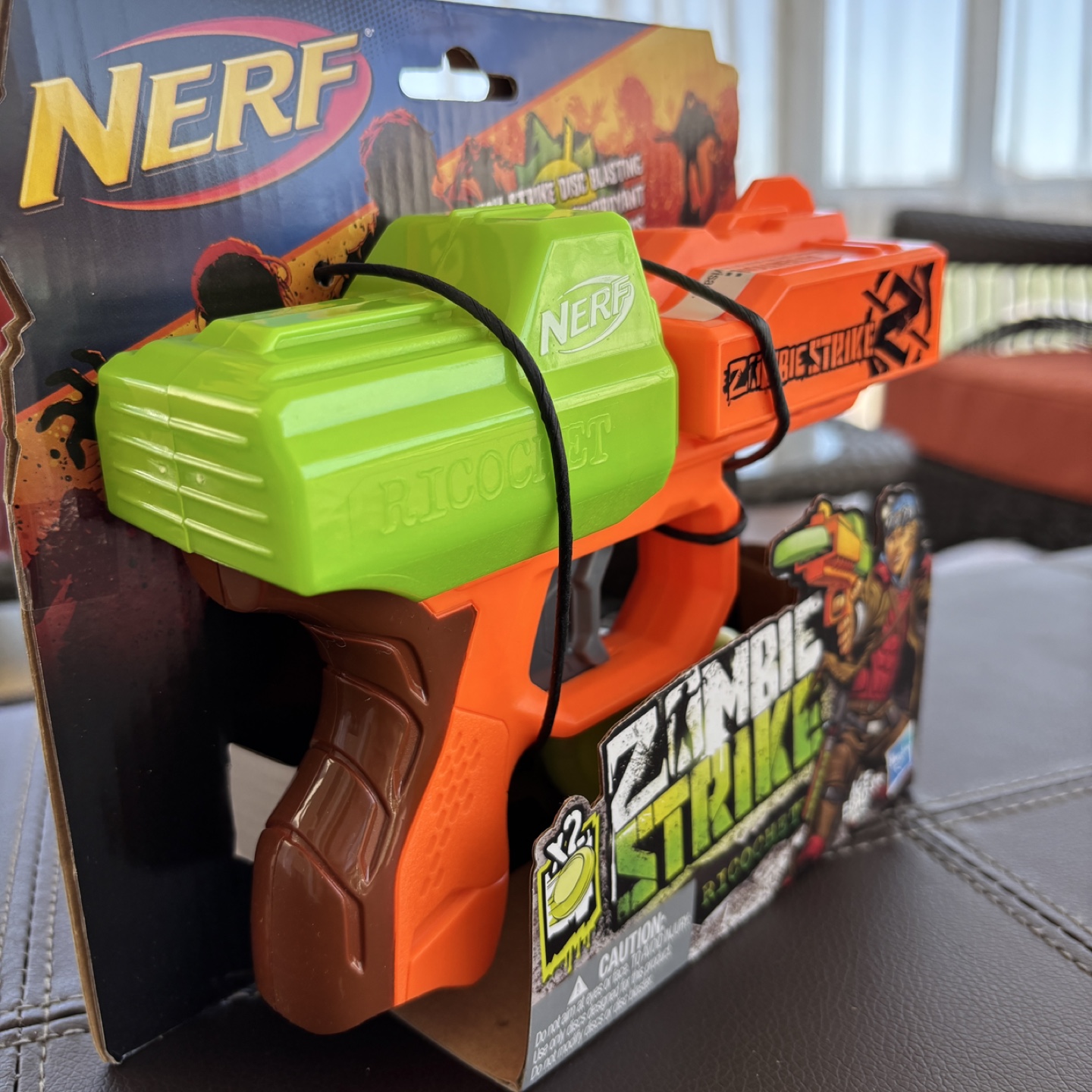 Brand new NERF Zombie Strike Ricochet blaster. Includes two discs. Great for kids. Ages 8+. Still in original packaging.