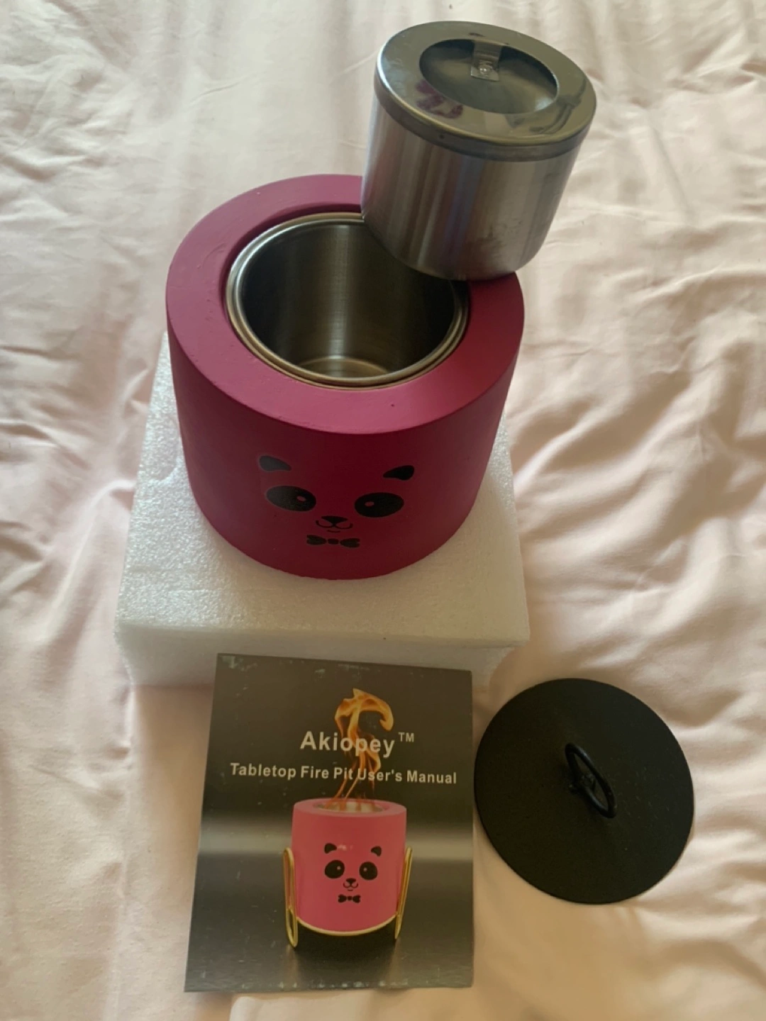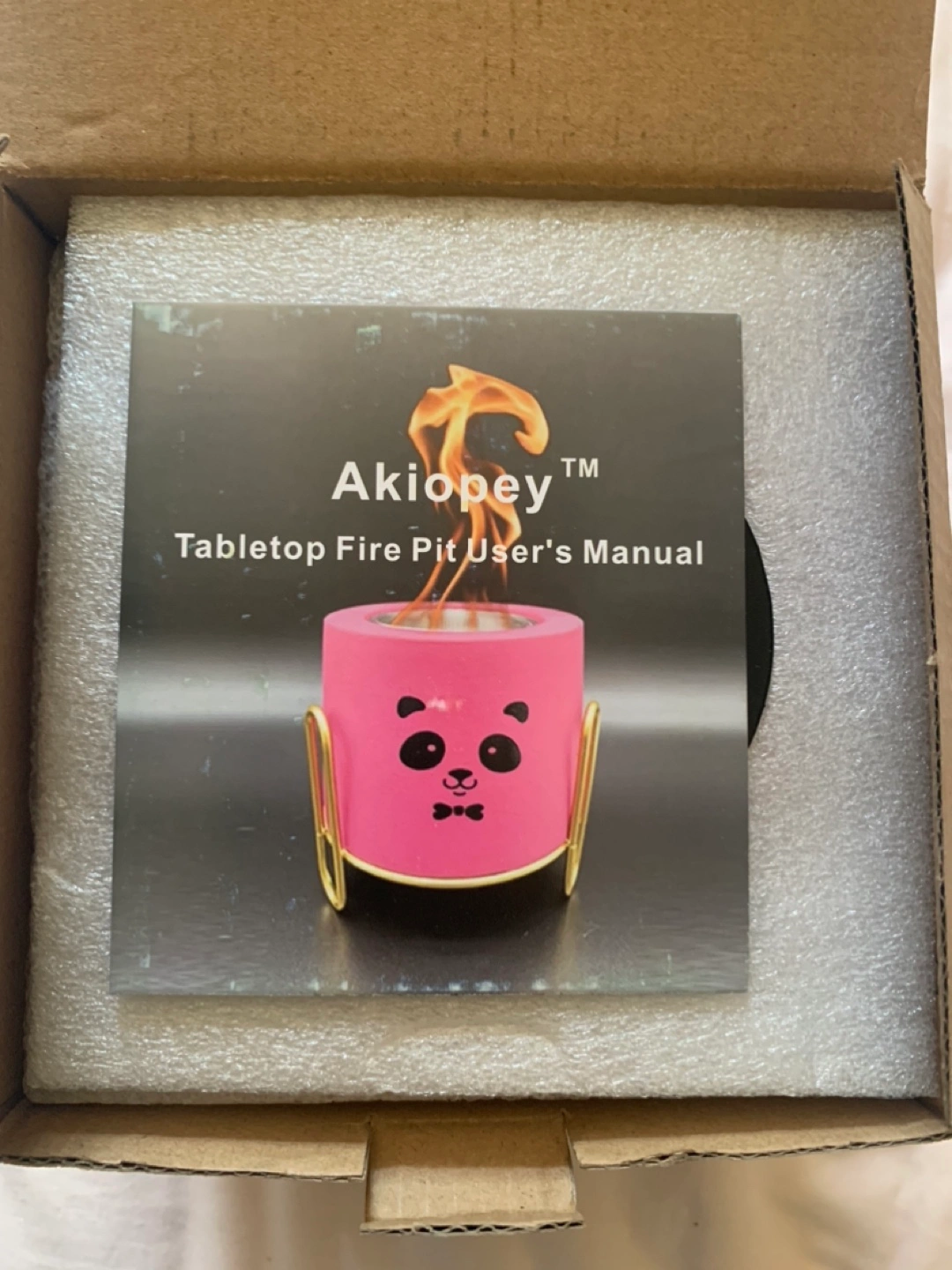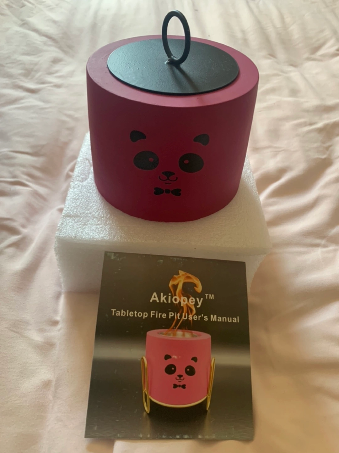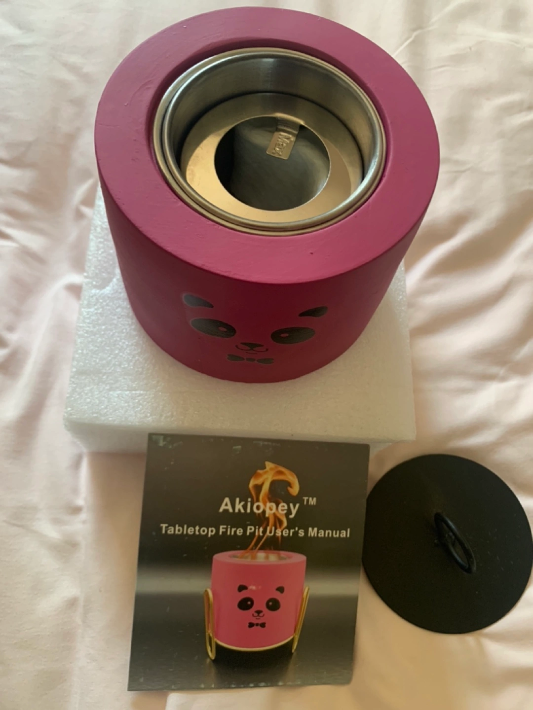 Adorable panda-themed tabletop fire pit. Includes a user manual and all components. Perfect for small spaces. Easy to use with no mess, or clean-up. The tabletop fire place fueled by clean, smokeless and odorless Isopropyl Alcohol. The only off-gassing of isopropyl rubbing alcohol when burned is water vapor and carbon dioxide! So it is totally safe and tastes so great! Just like over a campfire! Each burn lasts 1.5 hours