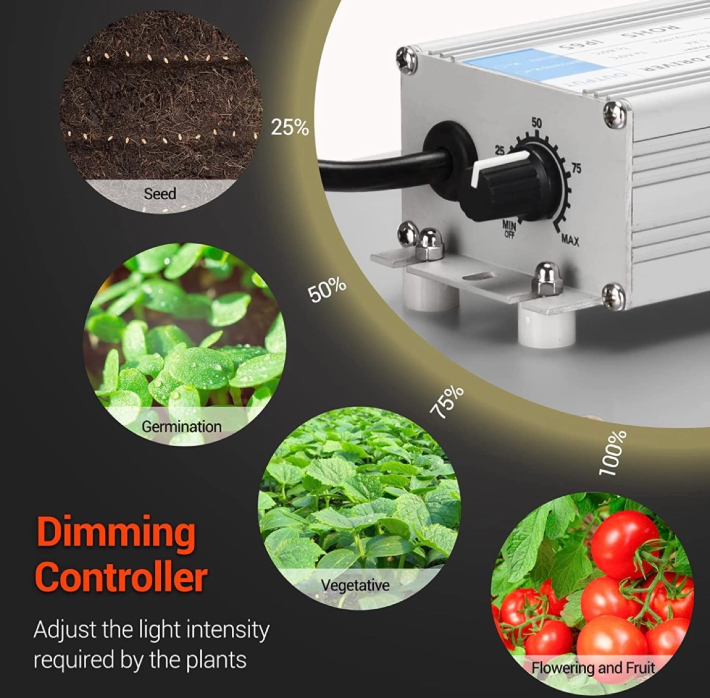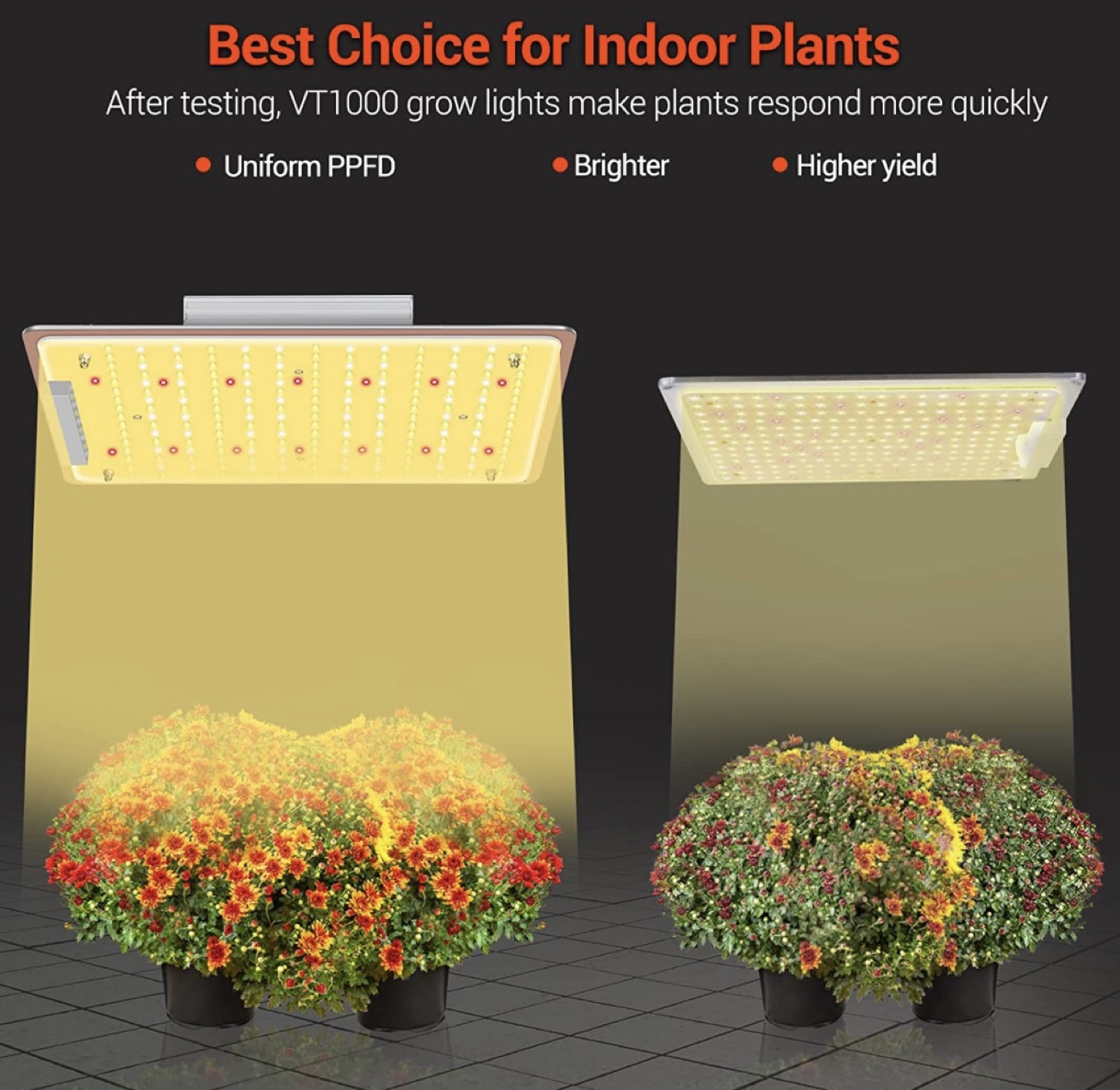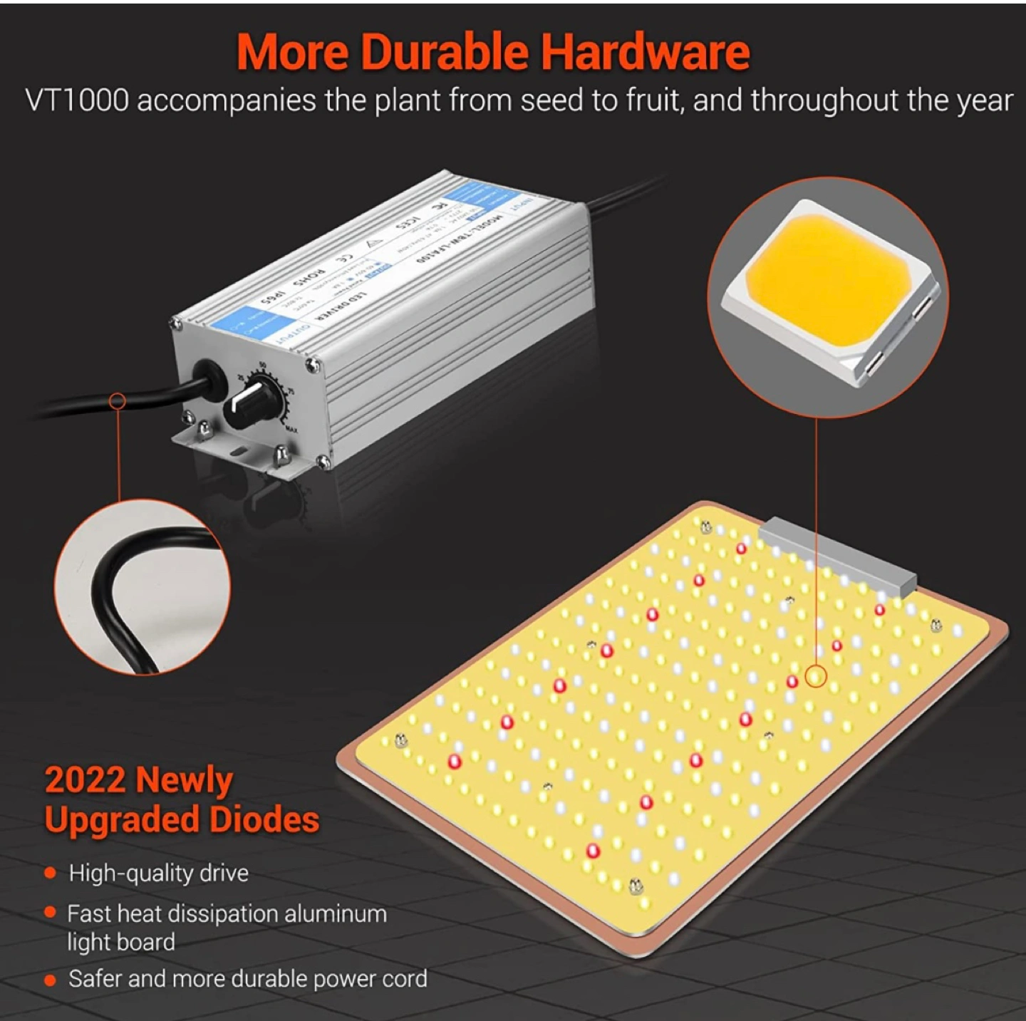 23Will deliver within Richmond upon payment - HIGHER-QUALITY YIELDS & LOWER COST: VT1000 LED Grow Light utilizes the latest in high yielding LED technology diodes, high Energy Efficiency with 2.8 umol/J and high PAR output, create the better canopy light penetration. VT1000 grow light is more energy saving and will have lower electricity bills than SMD LEDs)or OLD blurple led lights, but get 50% more harvest. LED plant lights have higher light utilization and lower power consumption than HPS. - UPGRADED DIMMABLE BALLAST: Upgraded VT1000 grow light has a dimming knob and light switch, so it can be adjusted the light intensity at liberty, ideal for all growth stages. Reasonably match the spectrum of different plant needs. More effective coverage area than any reflector series lights. This is really beneficial for large area of indoor growing and commercial planting. - SUNLIKE FULL SPECTRUM: Excellent full spectrum white, blue, red and IR (3000K, 5000K, 660nm and IR 740nm). 3000K diodes providing more reddish light and the 5000K providing more blueish. The 660nm red and IR light is especially useful during bloom, where it speeds up flowering time and boost yields. Sunlike light runs fairly natural, so it's good for accurately monitoring plant health. Veg footprint is 3 x 3 ft, Flowering footprint is 2.5 x 2.5 ft. - SILENT & STABLE: No Fan No Noise. High safety performance Driver and Waterproof feature. VT1000 grow light adopt aluminum board, which is more sturdy and thiner, it doesn't put out a tremendous amount of heat. No need to worry about damaging your plants. With more quality components help you setup your grow lights in your garden or plant tent.