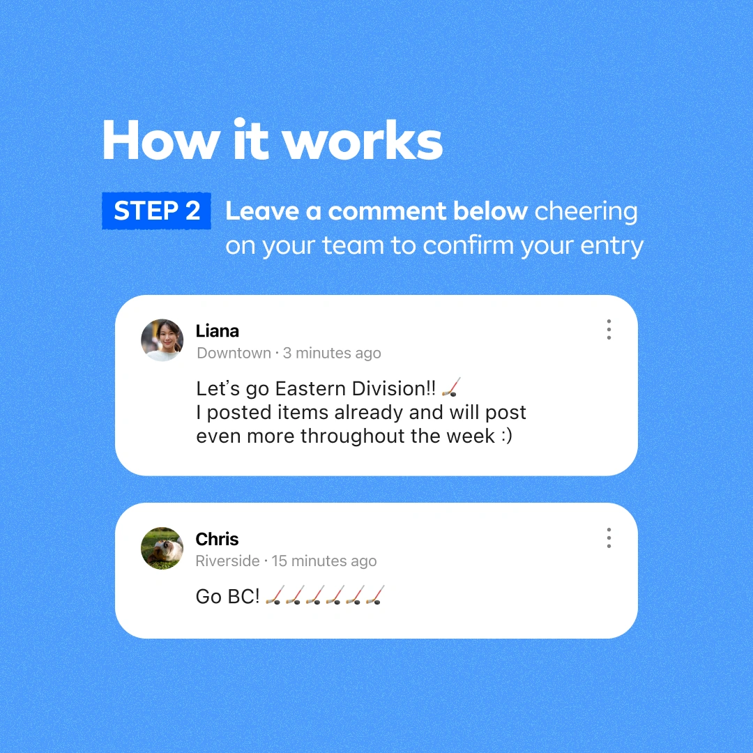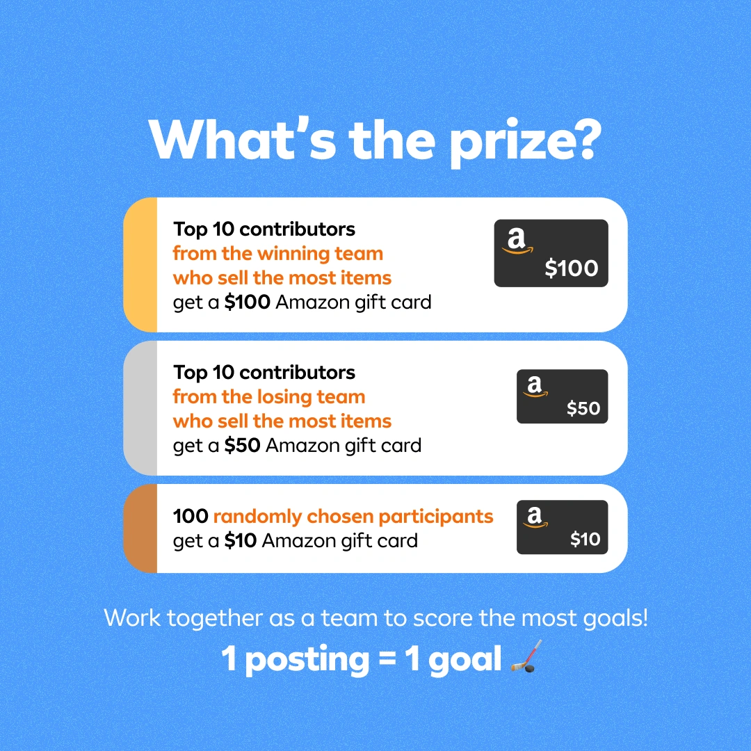 1000+Hey Karroters, CURRENT SCOREBOARD (Updated 05/17) Eastern Conference: 1752 Western Conference: 816 Drop the Puck—It’s Playoff Time! 🏒 The NHL Playoffs are here, and it’s time for a face-off of our own. We’re splitting Canada into two powerhouse teams, and it’s up to YOU to light the lamp and skate your way to victory. Bring the energy, show your team colours, and let’s see who wins! 🏆 🥅 EASTERN CONFERENCE: Ontario, PEI, Newfoundland & Labrador, Nova Scotia, New Brunswick 🥅 WESTERN CONFERENCE: British Columbia, Alberta, Saskatchewan, Manitoba Let’s keep the competition fierce and fun! Who’s ready to be the MVP? 🚨🔥 THE PRIZE: Beat the other team by scoring the most goals from May 12-18! 1 Posting = 1 Goal 🏒 , 10 Postings = 10 Goals 🏒 , etc. 🥇 Top 10 contributors from the winning team who SELL the most items get a $100 Amazon gift card 🥈 Top 10 contributors from the losing team who SELL the most items get a $50 Amazon gift card 🎁 100 randomly chosen participants get a $10 Amazon gift card HOW TO PLAY: 1. Post items with the “🏒” emoji in the title (New listings only—boosts don’t count) 2. Comment below cheering for your team to confirm your entry 3. Check the leaderboard throughout the week to track which team is leading! Winners will be announced in-app on May 19 along with our MVPs and prize winners. Lace up—the KARROT PLAYOFFS starts NOW! 🧊🥅 Terms & Conditions - Users who upload items between May 12 0:00 - May 18 23:59, 2025 will be counted as valid participants. Total number of qualified postings made by all regions in each team within the given time period will be added up. - This promotion is only open to signed up & verified users in Canada. - Listings must include pictures of actual items and an accurate description. - Listings must follow Karrot's guidelines and policies. Items listed in Karrot's Prohibited Items will be excluded. - If top contributors sell the same amount of items, the contributors who sell the most items first will be declared the winner(s). Only listings posted with the required emoji will be counted. - Engagement may be monitored to verify the validity of the completed transaction. Listings found to be fake or in-genuine will be disqualified. - Karrot reserves the right to modify, cancel and limit any promotion at any time and without prior notice.