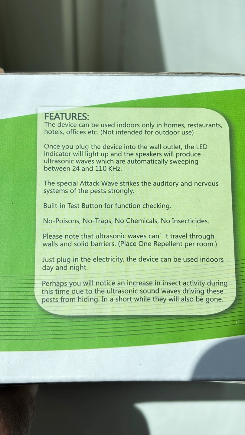 Eco-friendly pest repellers. Uses ultrasonic waves. No chemicals, traps, or poisons. Indoor use only. LED night lights. 4 Easy plug-in.