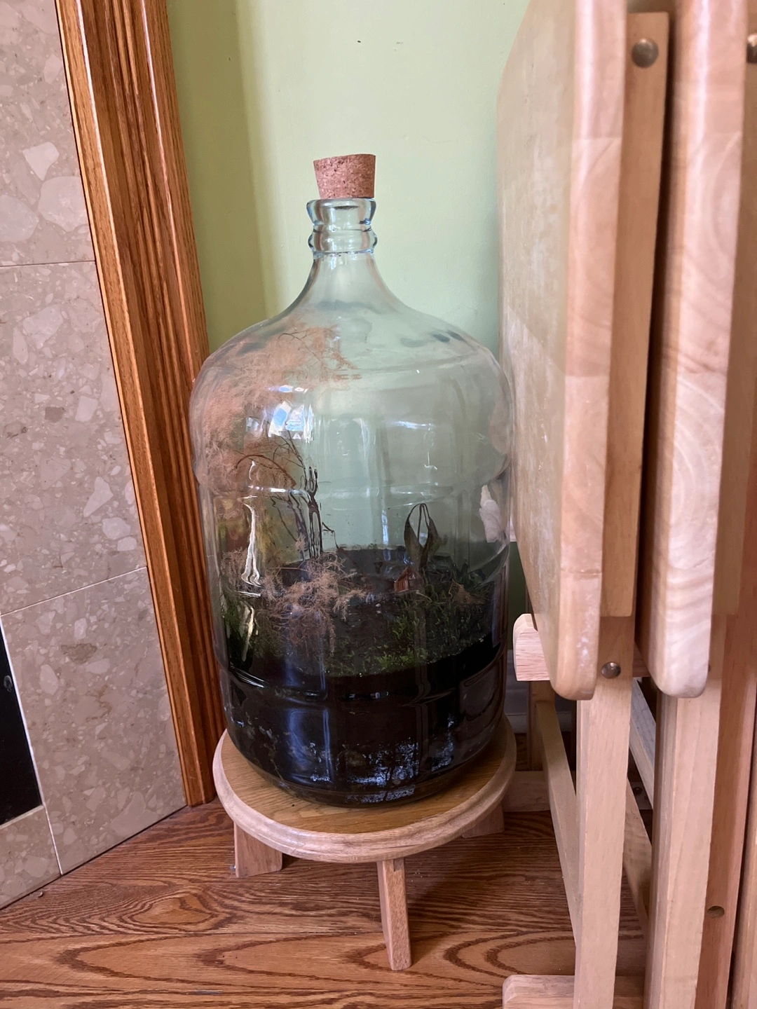 Unique terrarium housed in a large glass bottle. Features plants and soil. Cork stopper top. Sits on a small wooden stand.