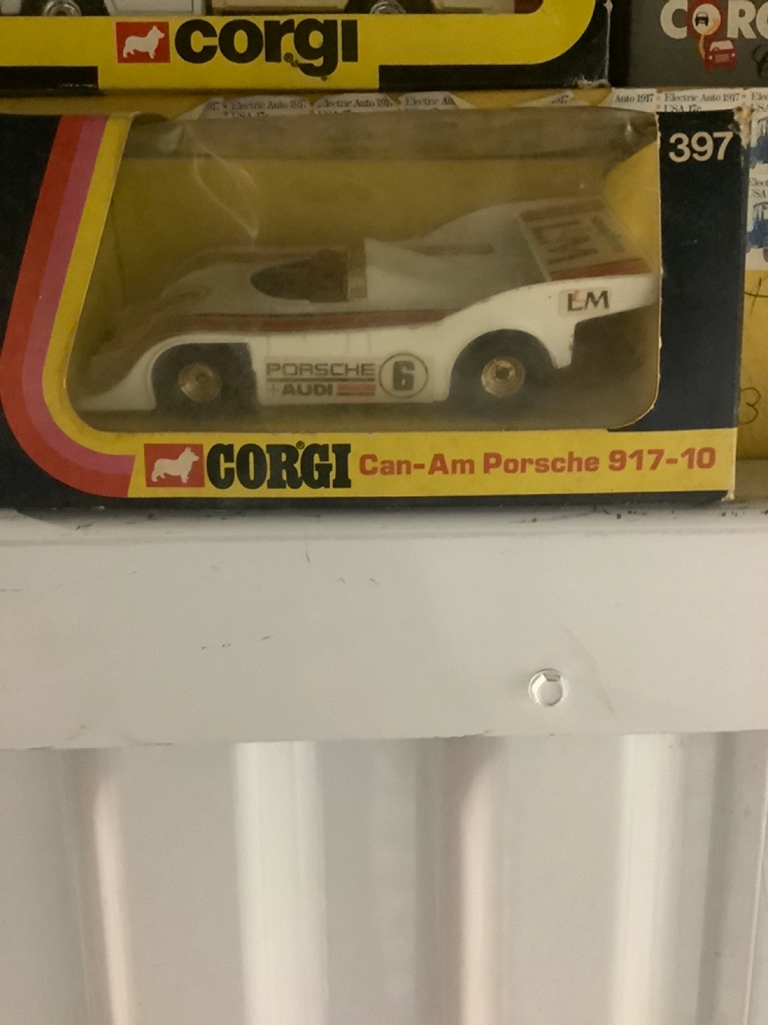 Vintage Corgi diecast model car. Number 397. Porsche Audi 6. White with red and gold accents. LM on the back.