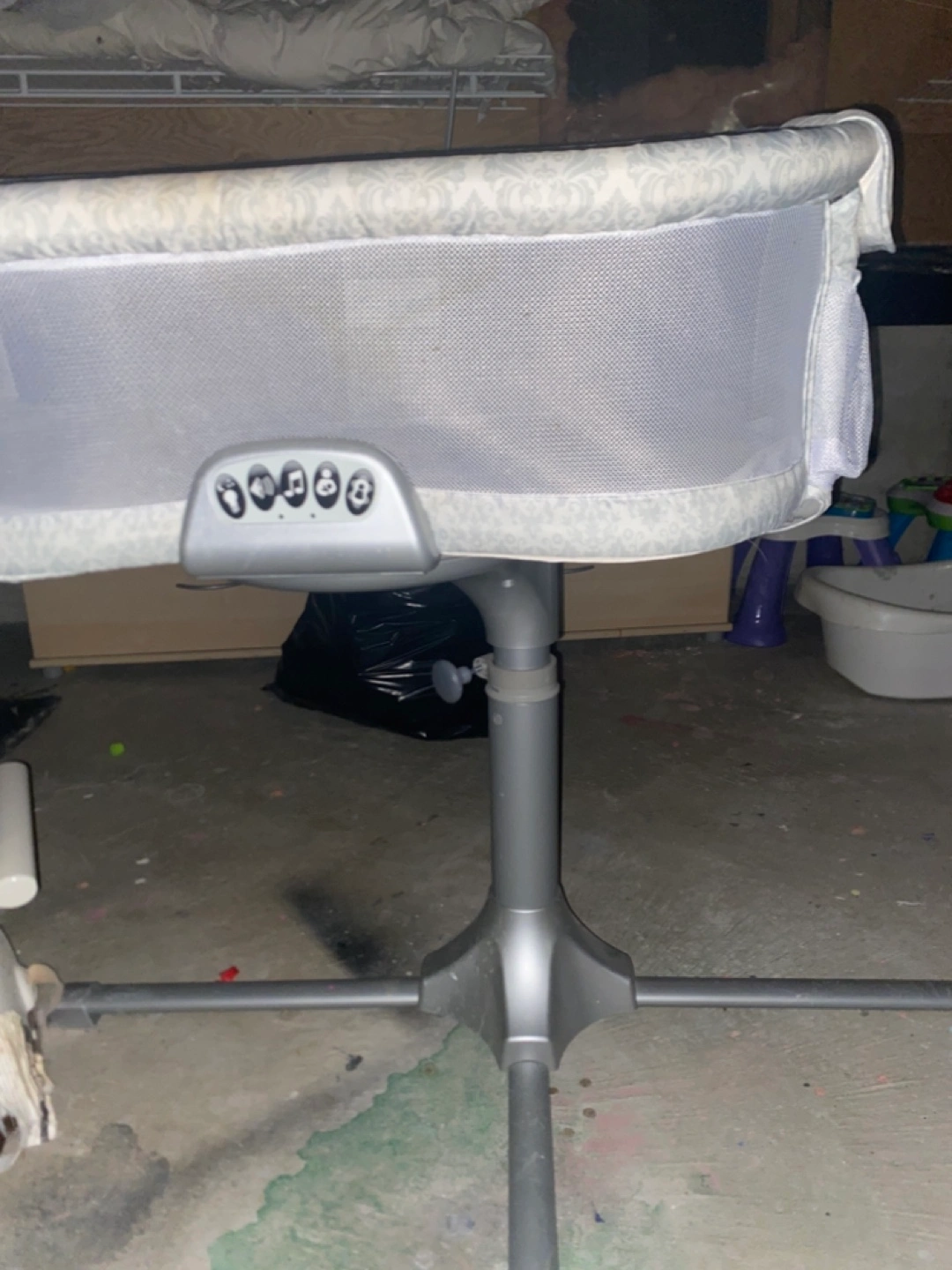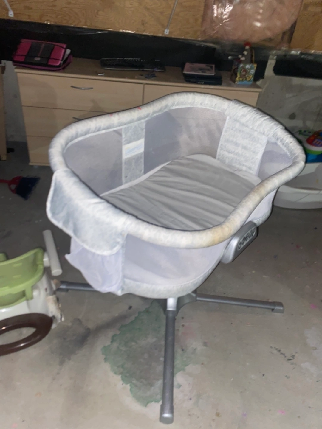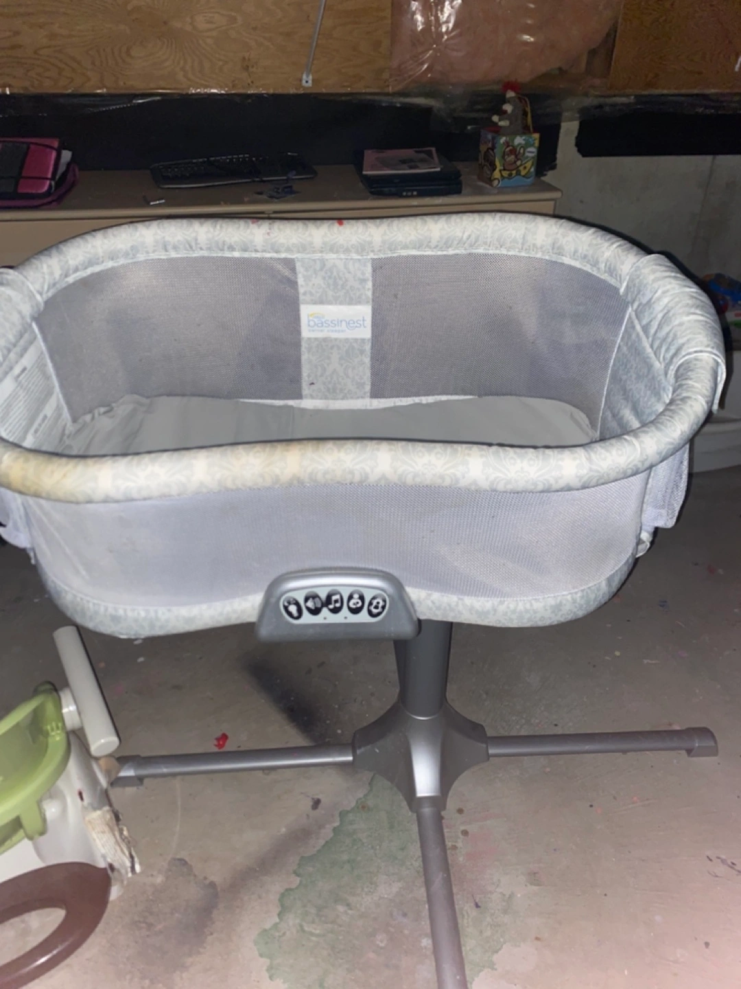 66Grey and white patterned bassinet. Features a stand with adjustable height. Mesh sides for breathability. Some minor stains.