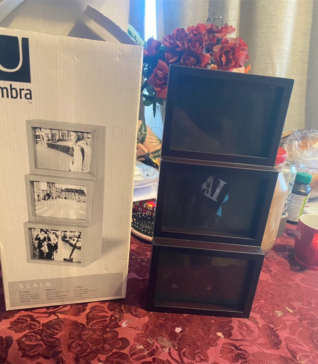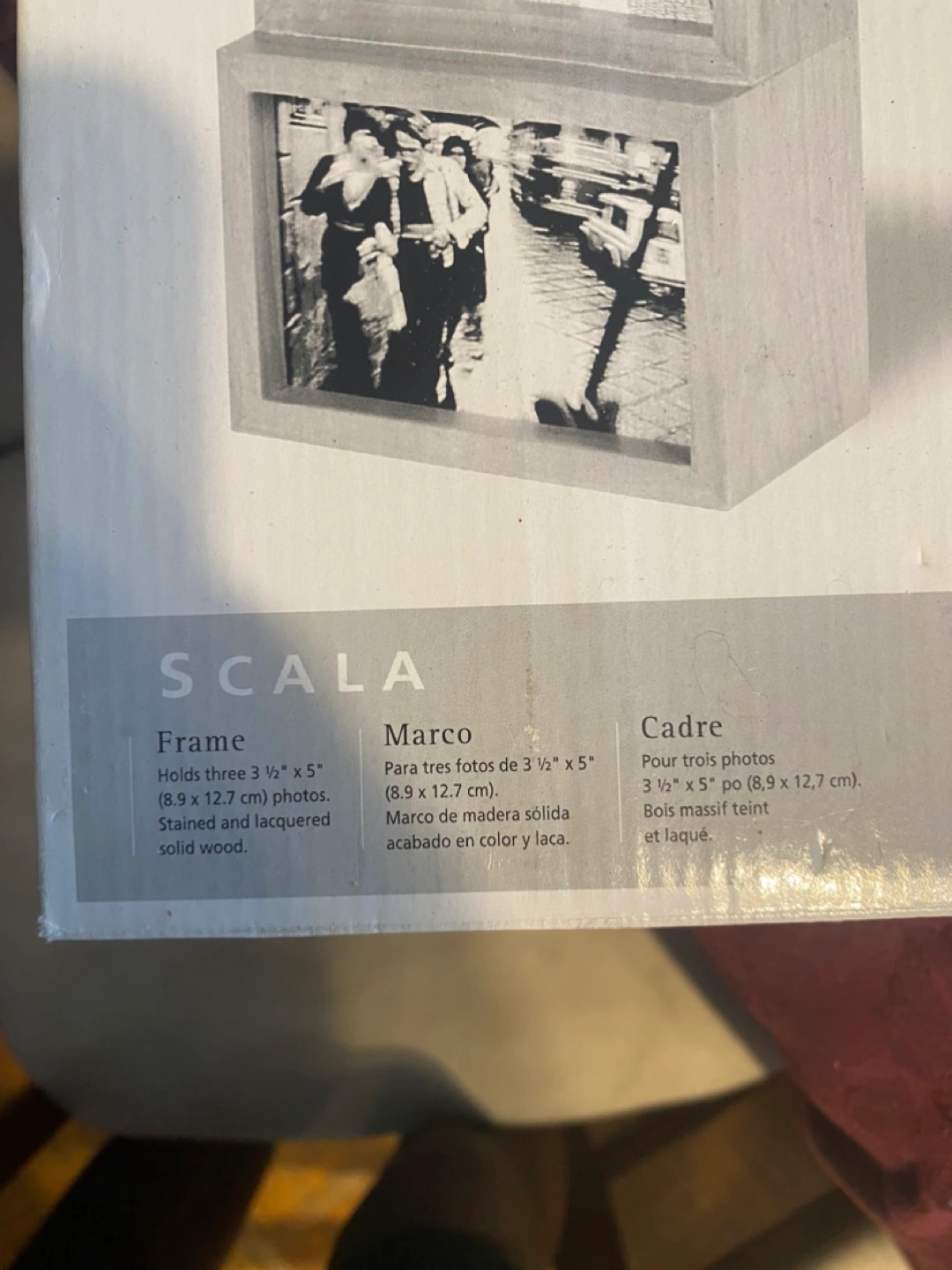 New in box. Three-photo frame. Stained and lacquered solid wood. Holds three 3 1/2" x 5" photos. Great for displaying favourite memories.