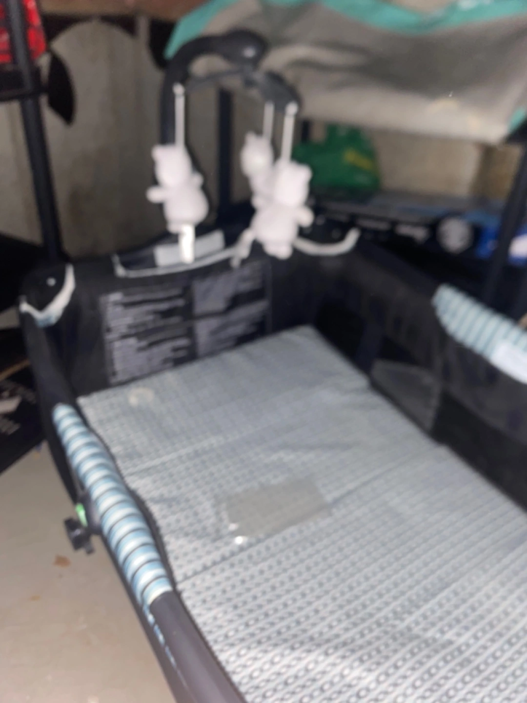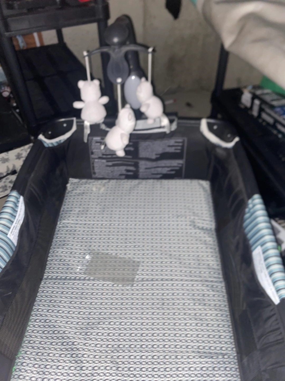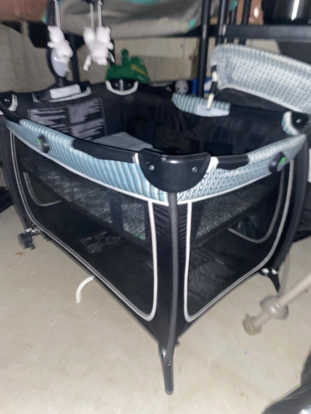 Portable playard, easy to fold and store. Includes a bassinet and mobile. Great for travel or home use. Suitable for newborns.