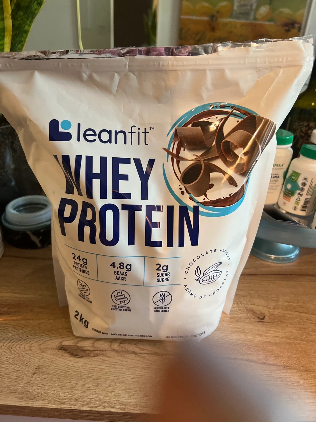 2kg bag of Leanfit whey protein powder. Chocolate flavour. 24g protein, 4.8g BCAAs, 2g sugar per serving. Fast digesting and gluten-free.