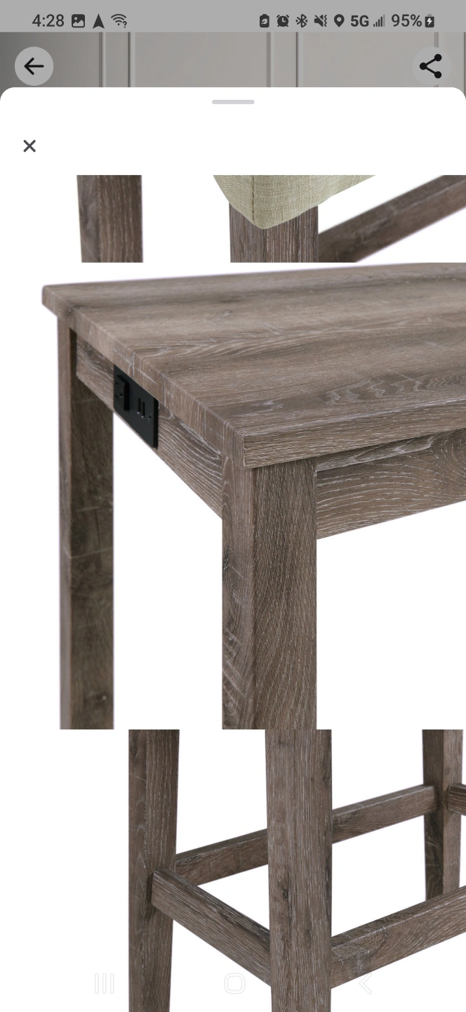 Grey wood console table and four matching stools. Built-in power outlet. Perfect for a kitchen or bar area. Modern farmhouse style.