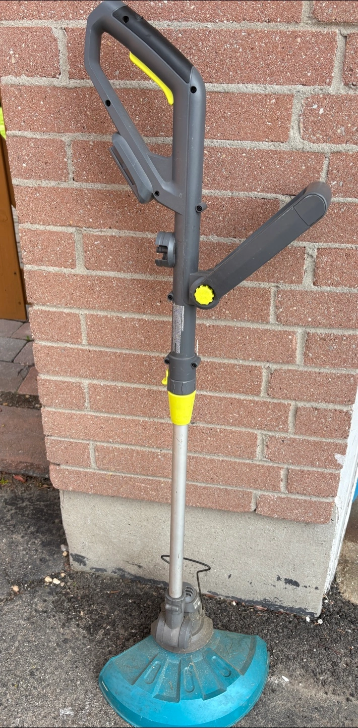 Lightweight cordless string trimmer. Teal cutting head. Includes charger and battery. Great for small yards.
