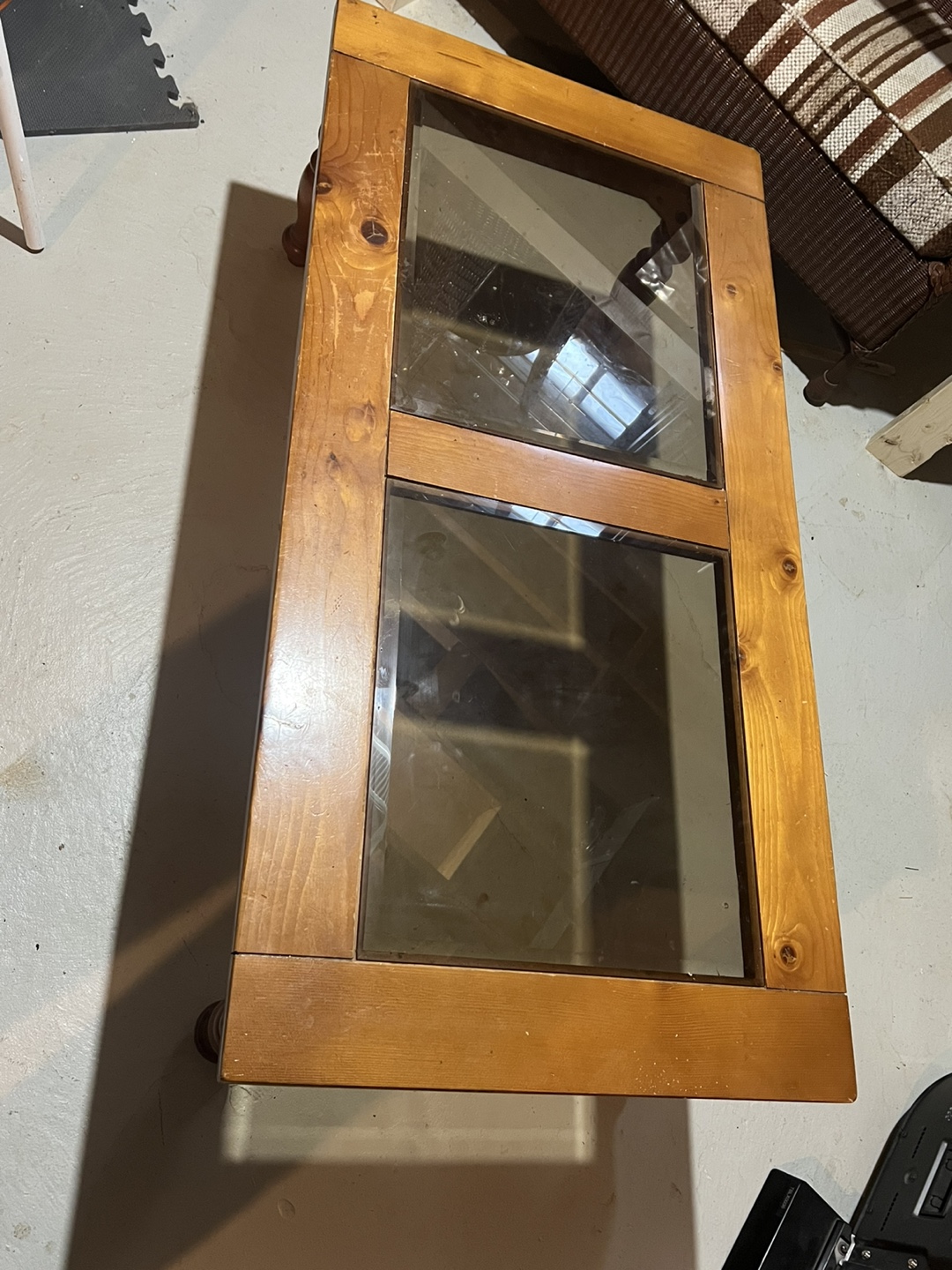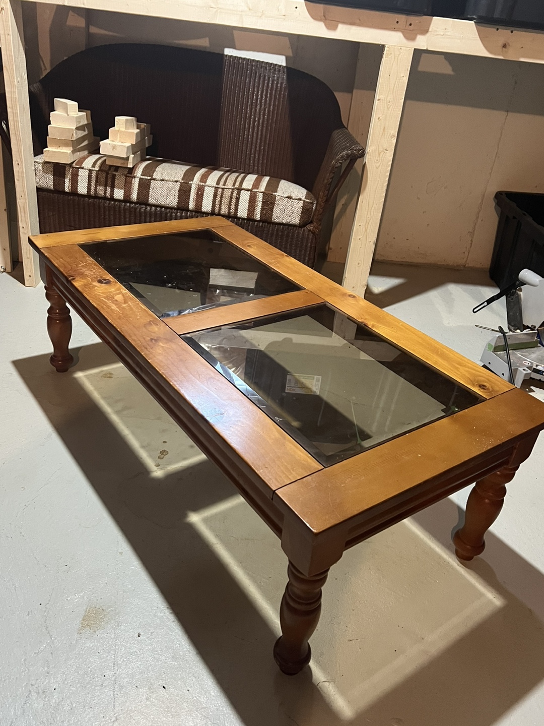 Rectangular coffee table. Solid wood frame. Two glass panels inset into the top. Turned legs. Great for living room or family room.