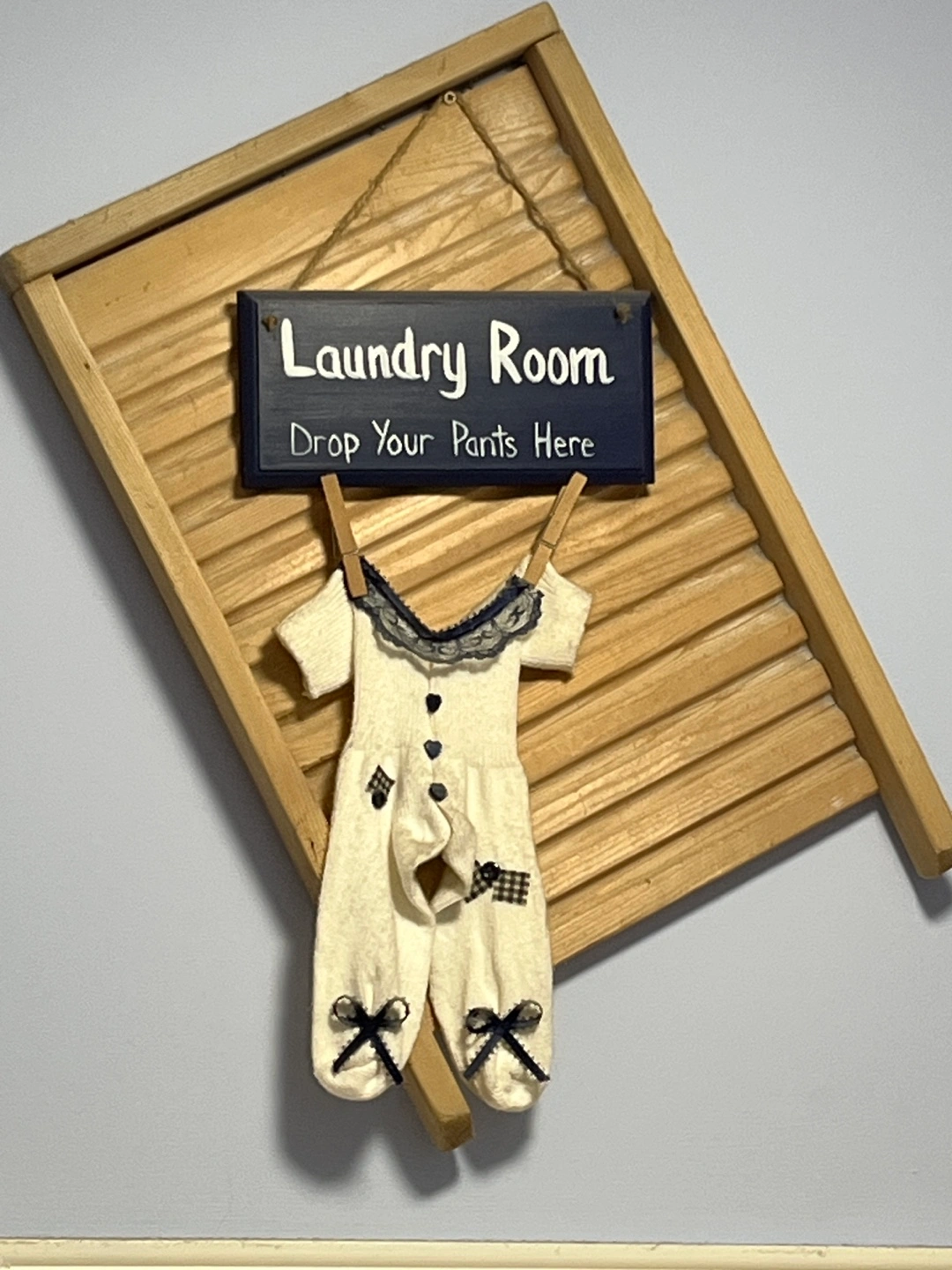 Adorable laundry room decor. Features a vintage-style washboard and a cute baby onesie. Perfect for adding a touch of charm to your laundry space.