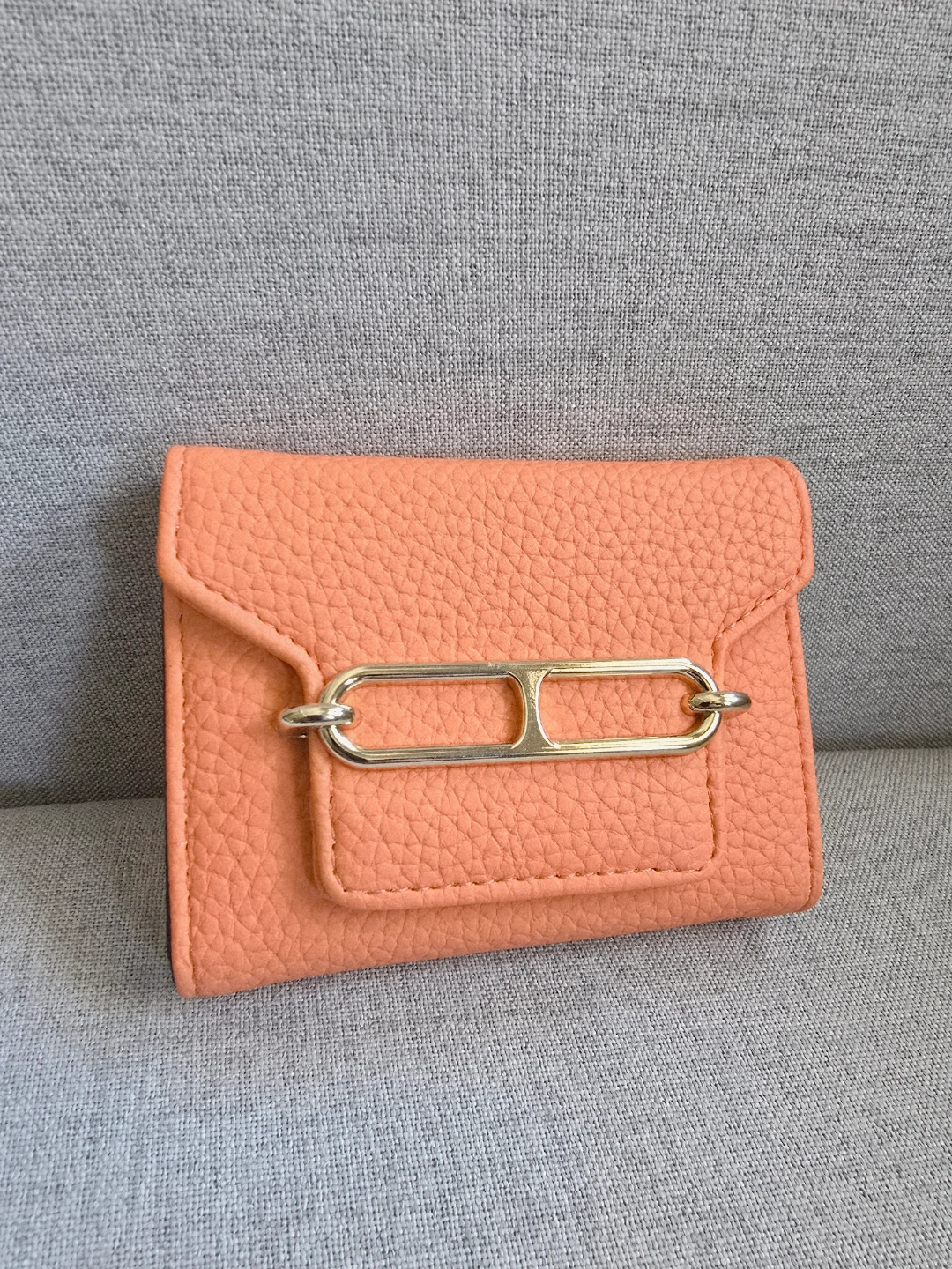 69Not authentic. Compact and stylish card holder wallet. Multiple card slots. Features a unique gold clasp. Pebbled texture.