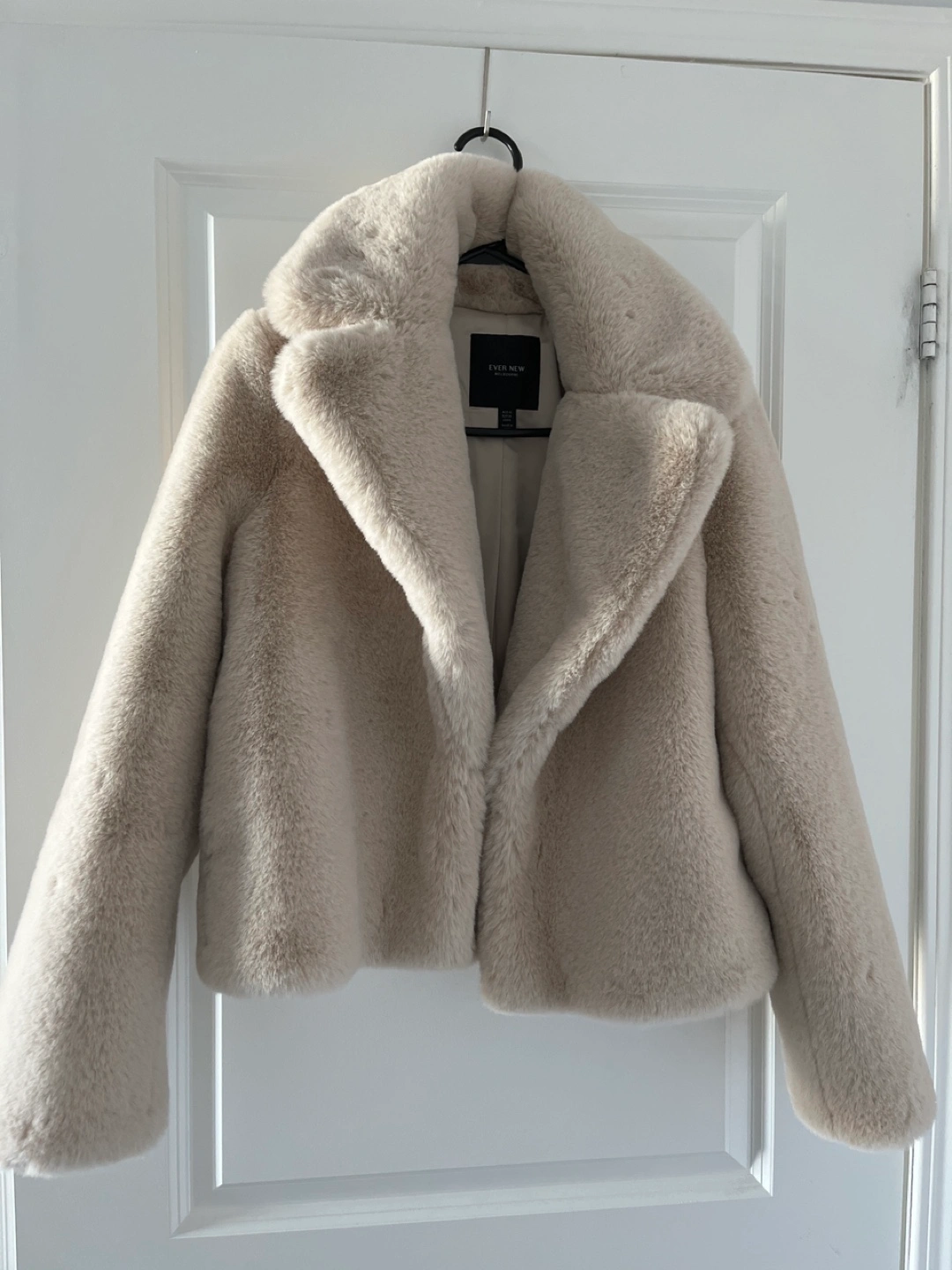 Cream coloured faux fur jacket. Cropped fit. Features a collar and long sleeves.