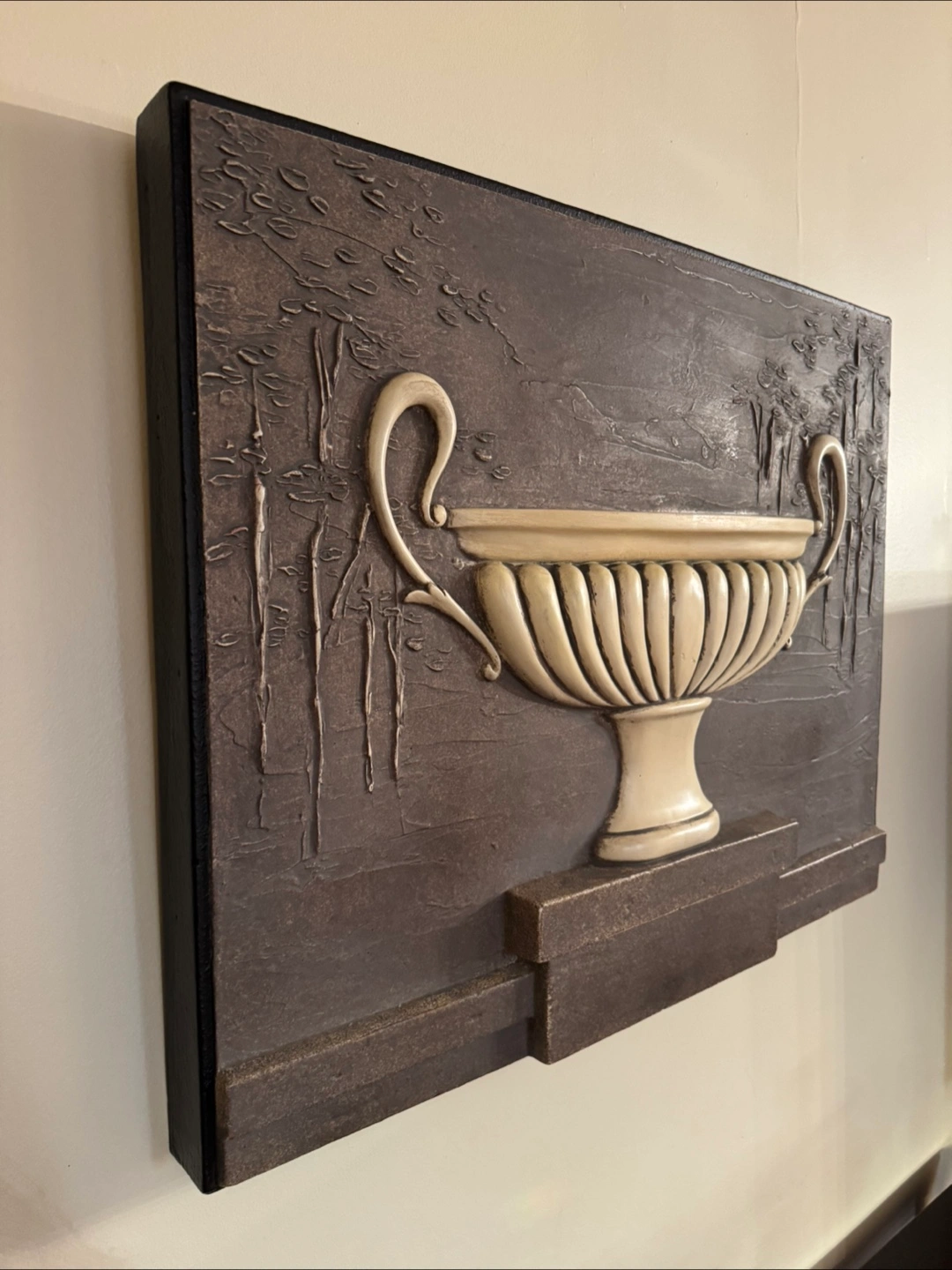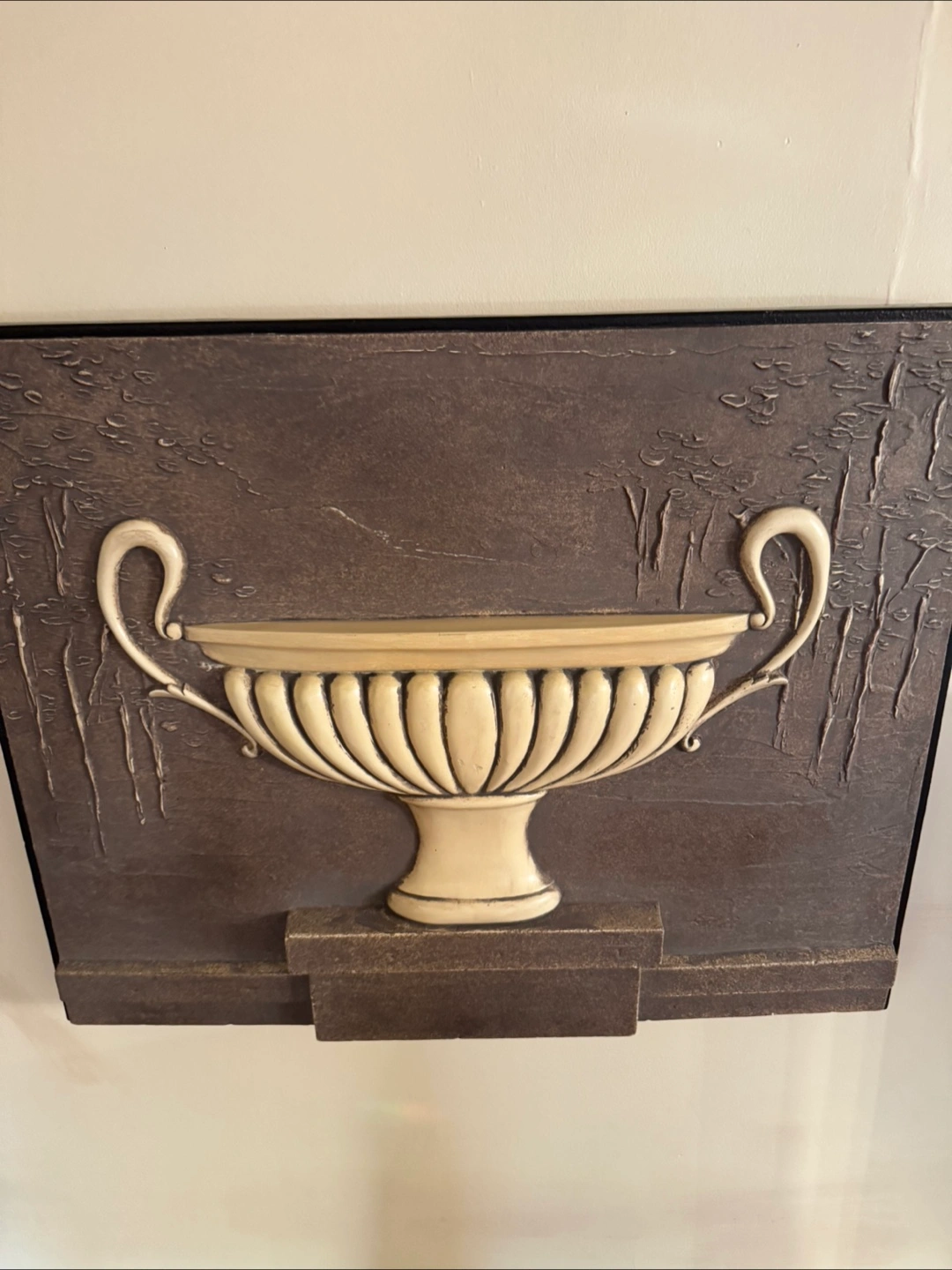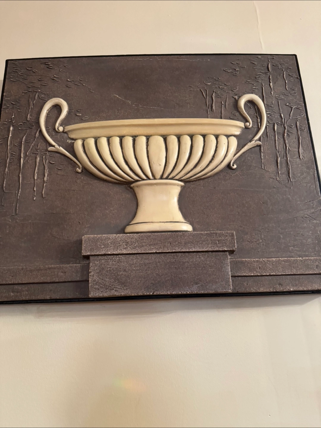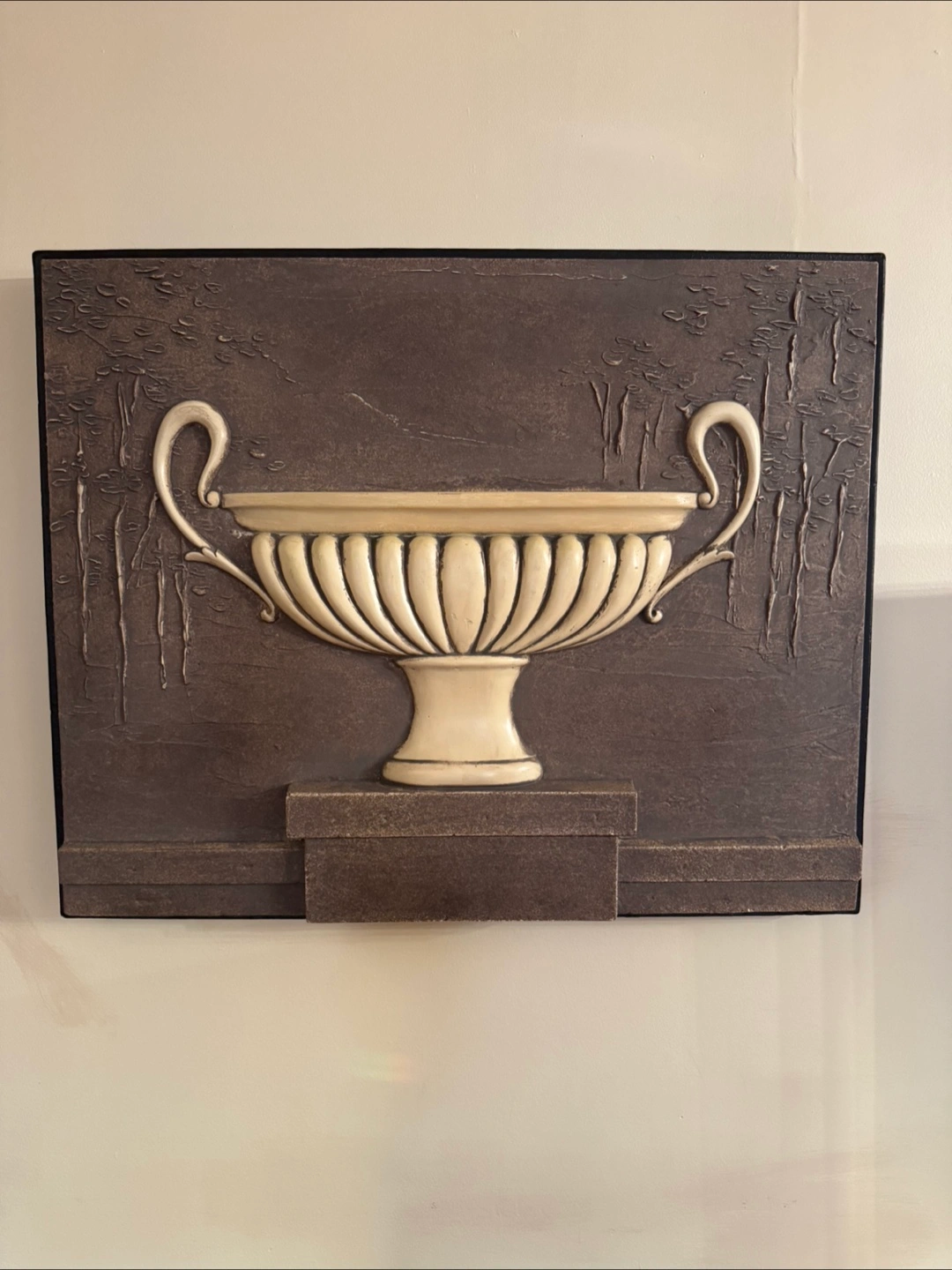 60Beautiful wall hanging. Features an ornate urn design. Dark brown and beige colour scheme. Adds a touch of classic elegance to any room.High 25,Wide 30