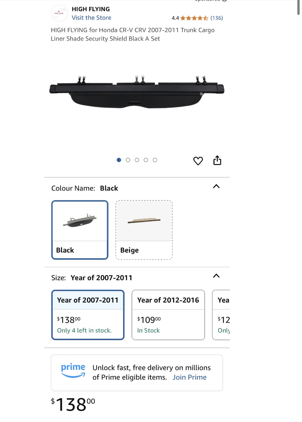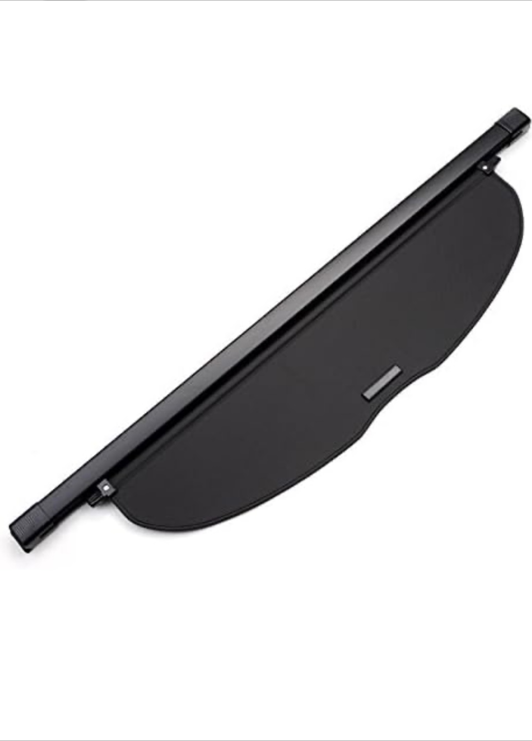 Black cargo cover. Fits Honda CR-V 2007-2011. Retractable design. Keeps items out of sight.