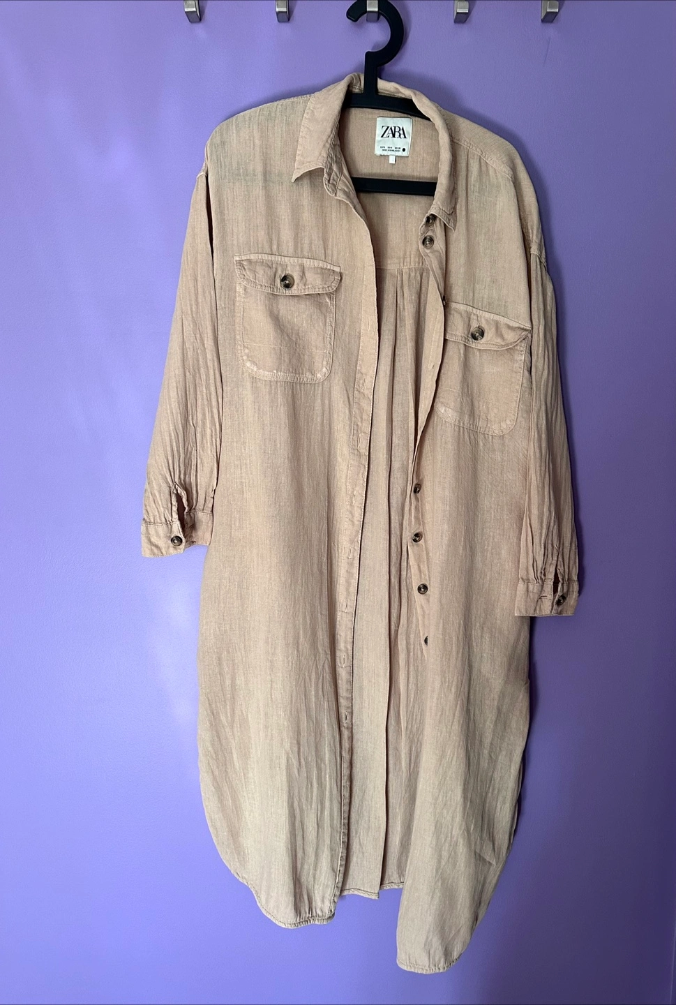 Longline beige shirt jacket. Linen blend fabric. Features button closure, chest pockets, and three-quarter sleeves. Relaxed fit.
