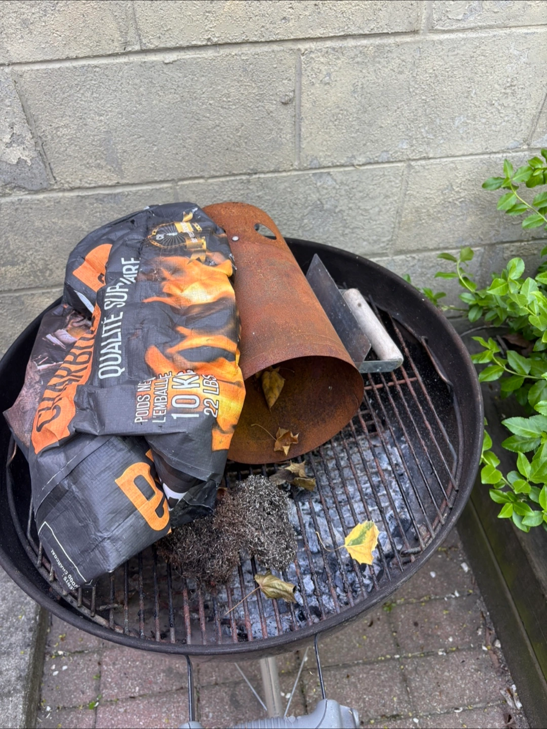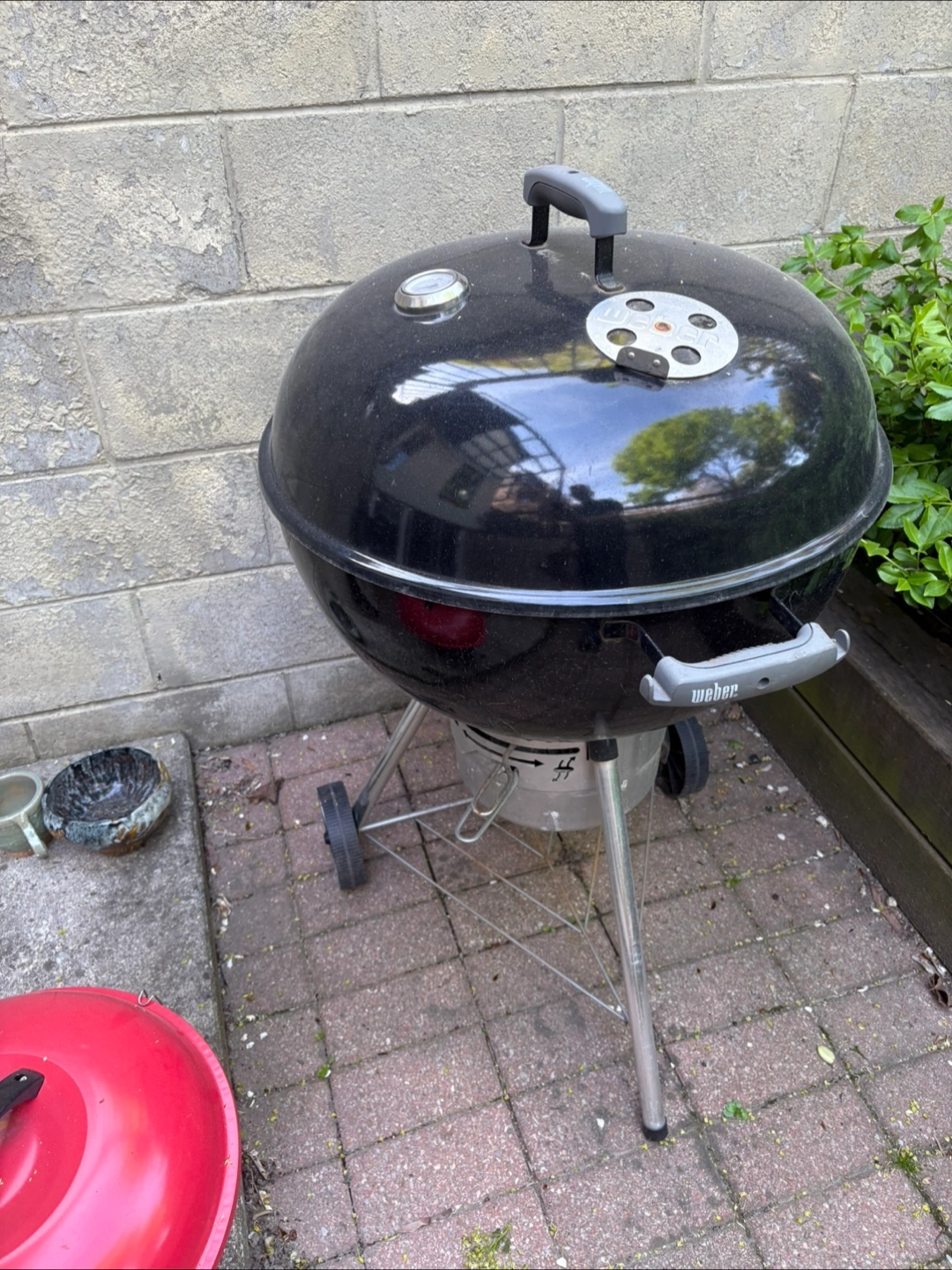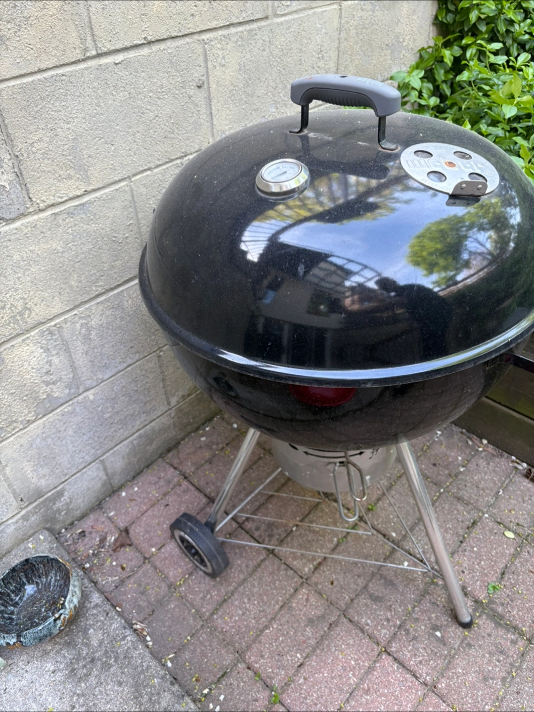 Used Weber kettle charcoal barbecue. Black enamelled bowl and stainless steel legs. Includes built-in thermometer. Some wear and tear expected from use.