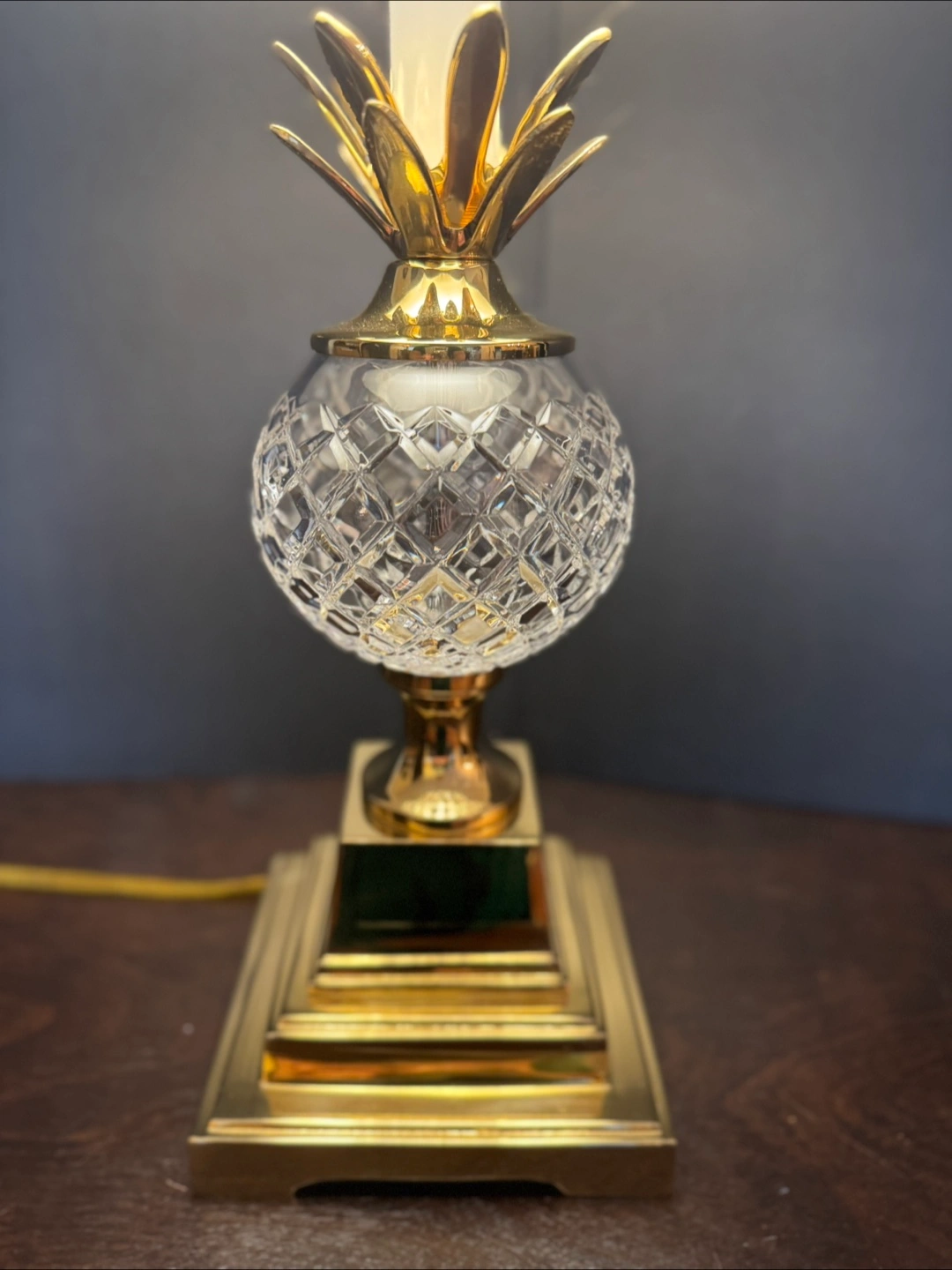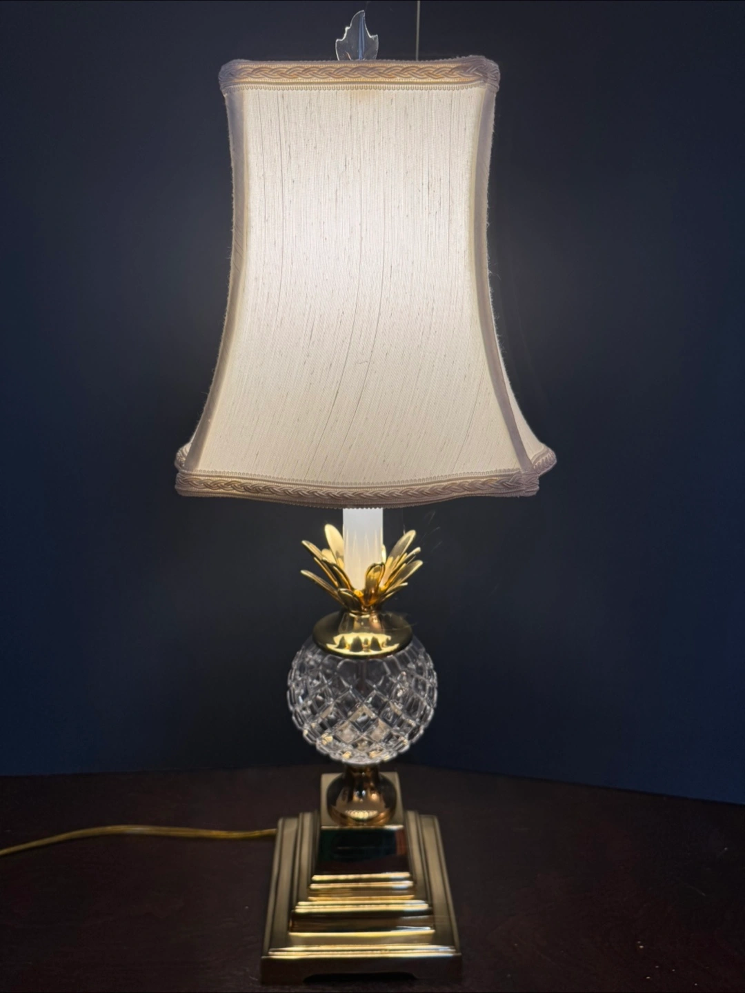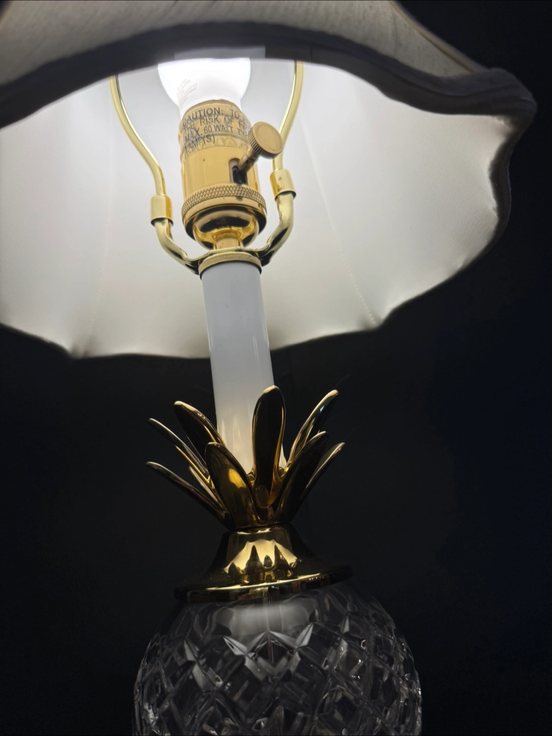Beautiful vintage table lamp. Features a crystal pineapple design, brass base and accents, and off-white lampshade. Excellent addition to any home decor.