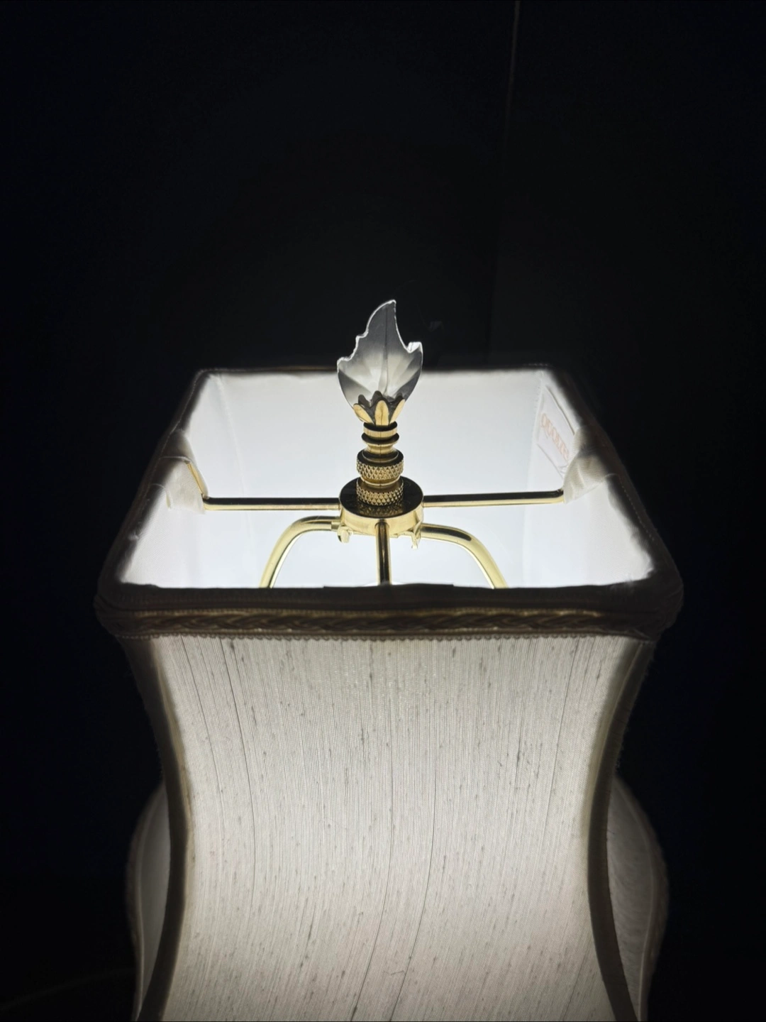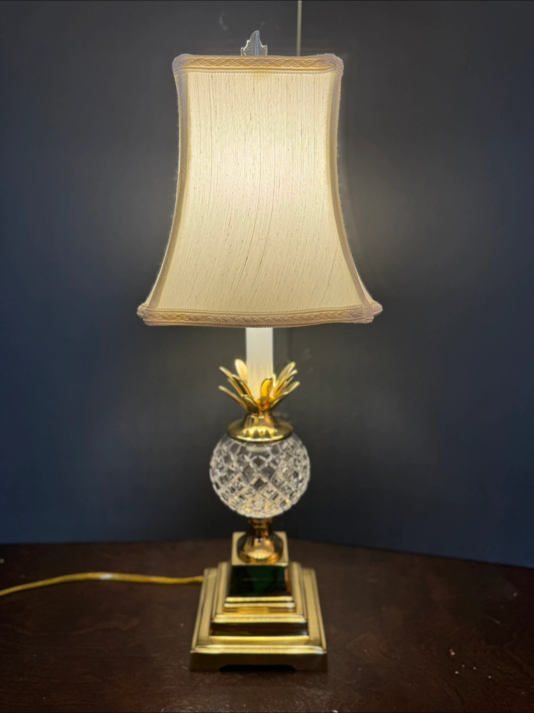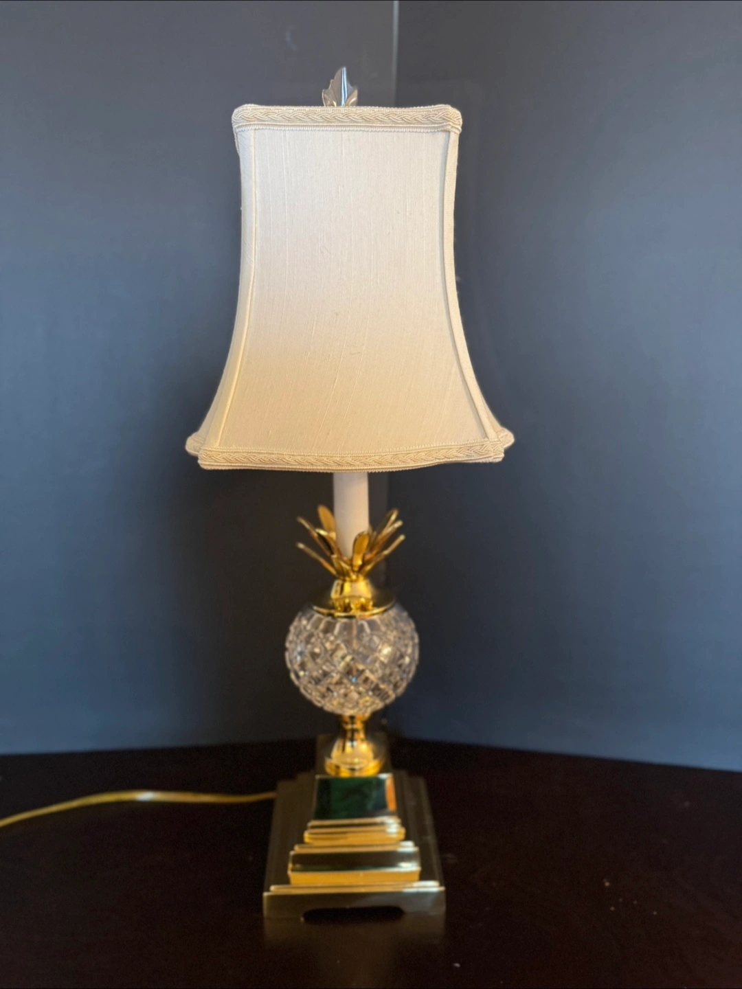 Beautiful vintage table lamp. Features a crystal pineapple design, brass base and accents, and off-white lampshade. Excellent addition to any home decor.
