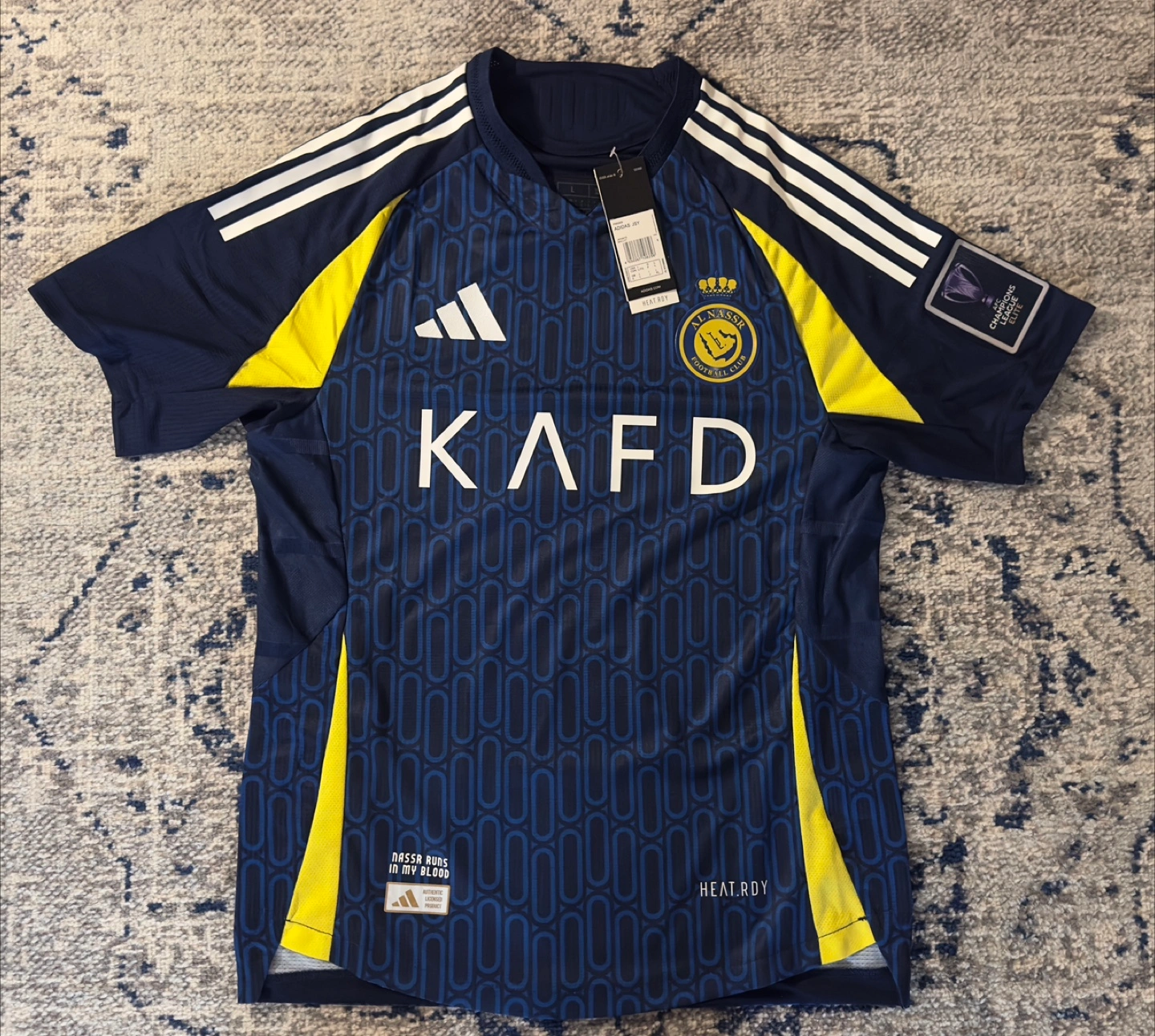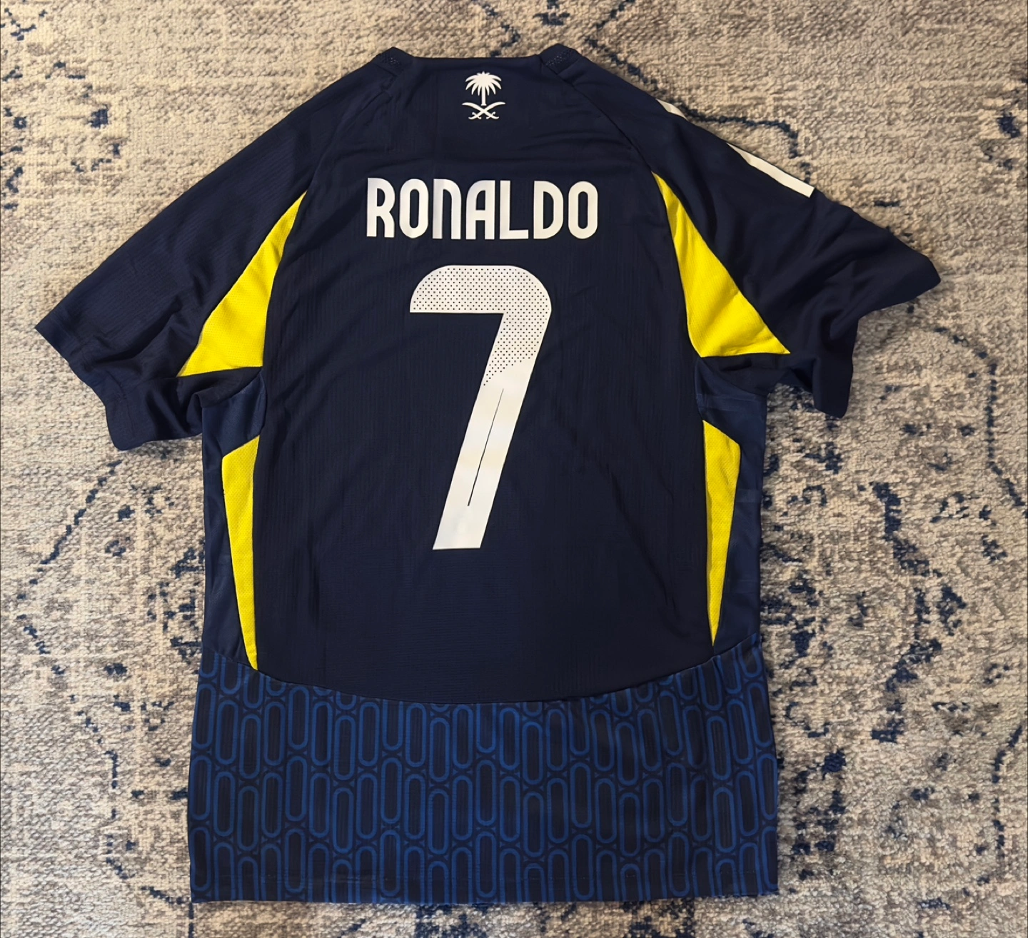 Men's Al Nassr football jersey. Features Ronaldo's name and number. Adidas branding. Navy blue with yellow accents. Unique pattern design. Heat.RDY technology.