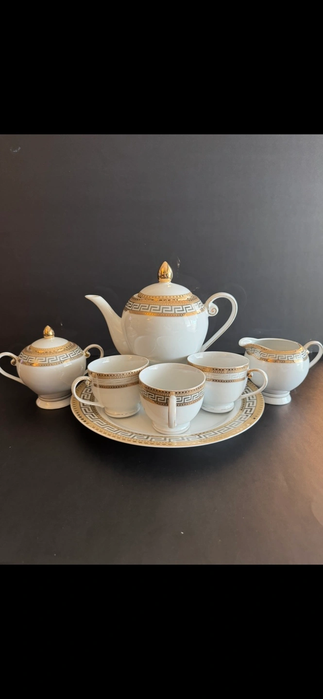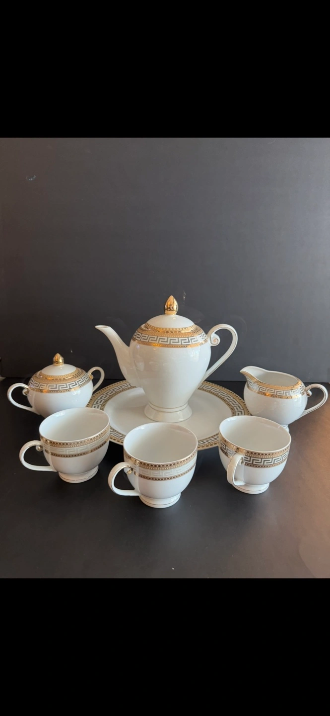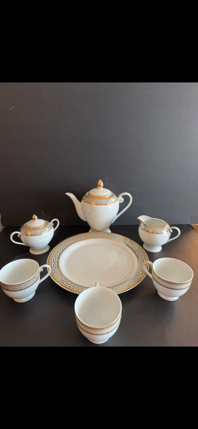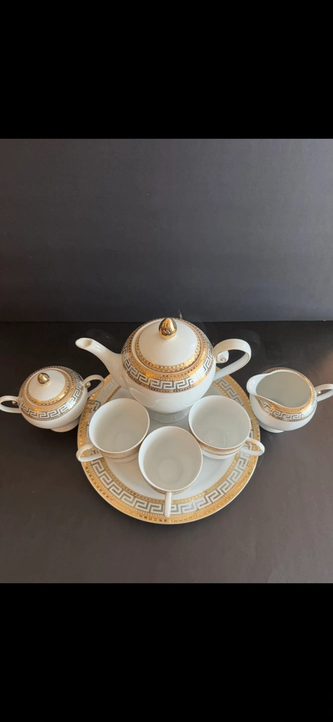 60This elegant tea set is perfect for adding a touch of luxury to your tea time. This used set includes a teapot, sugar bowl, creamer, three cups, and a serving plate , all adorned with the iconic Greek key design. * Includes teapot, sugar bowl, creamer, three cups, and serving plate * Material: Porcelain with gold accents