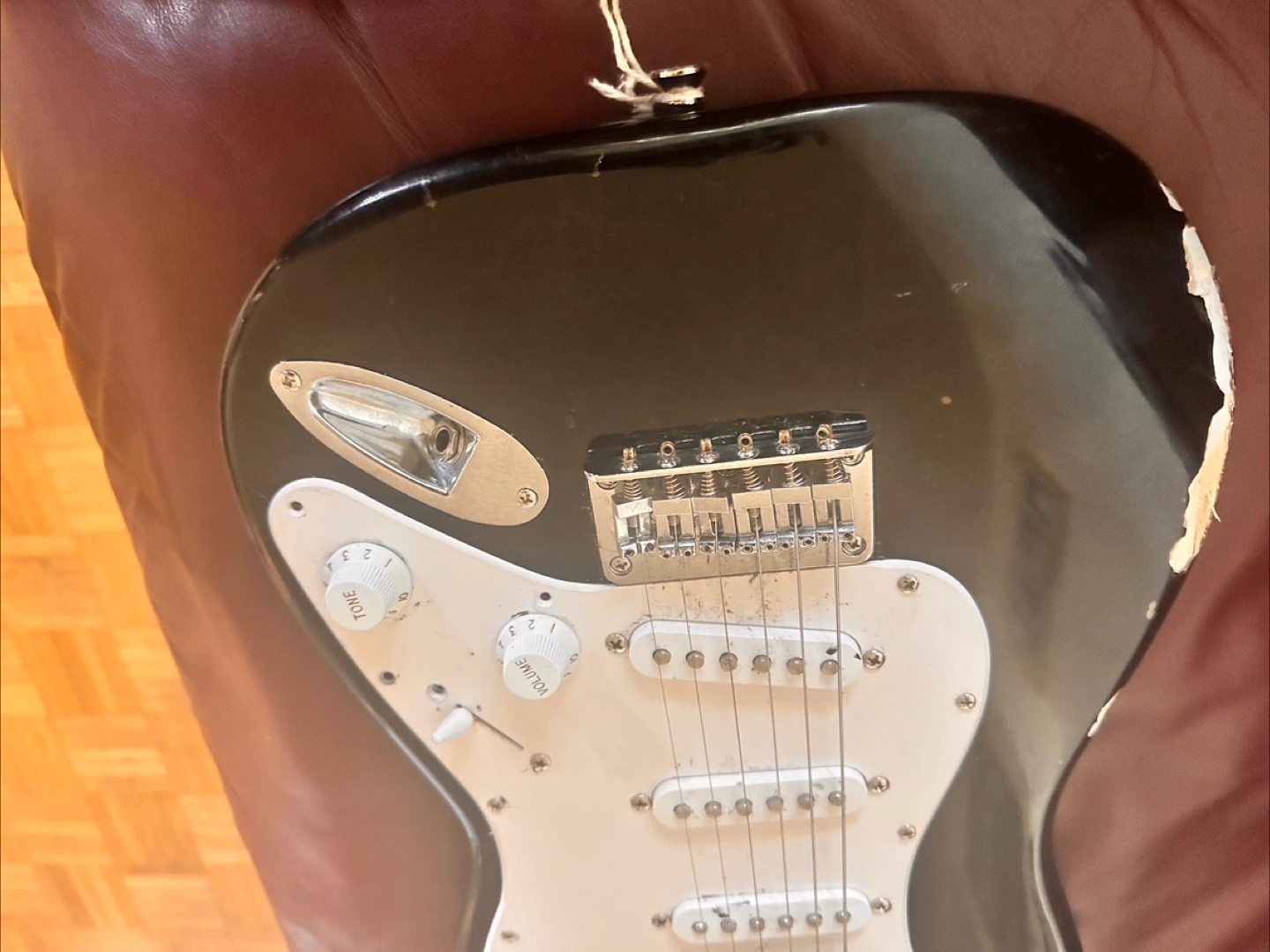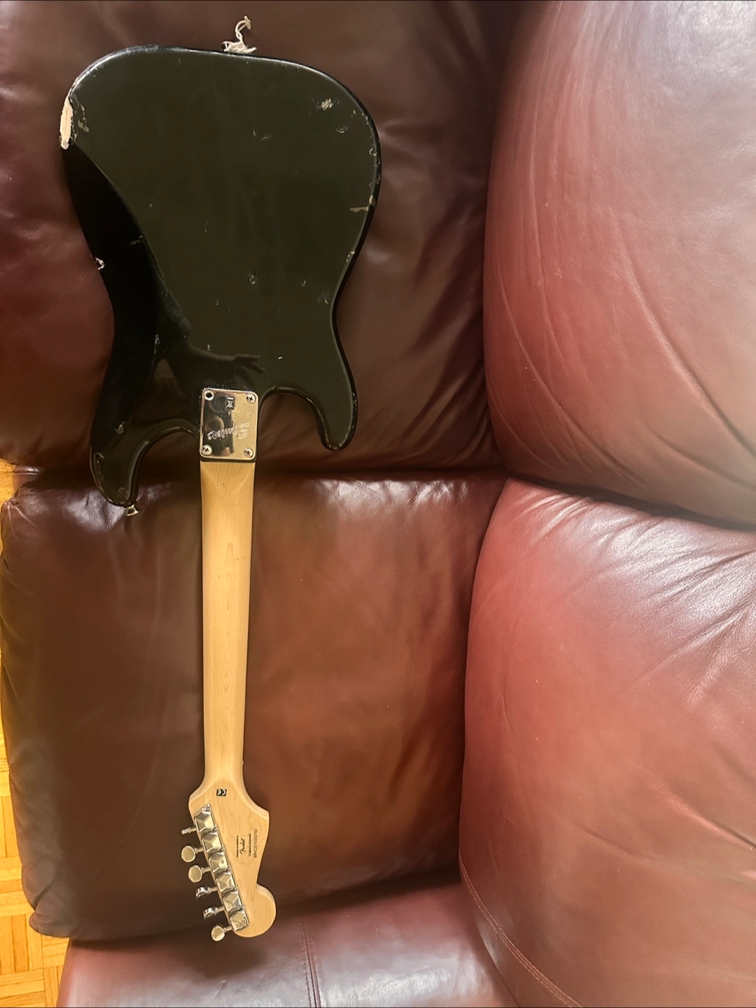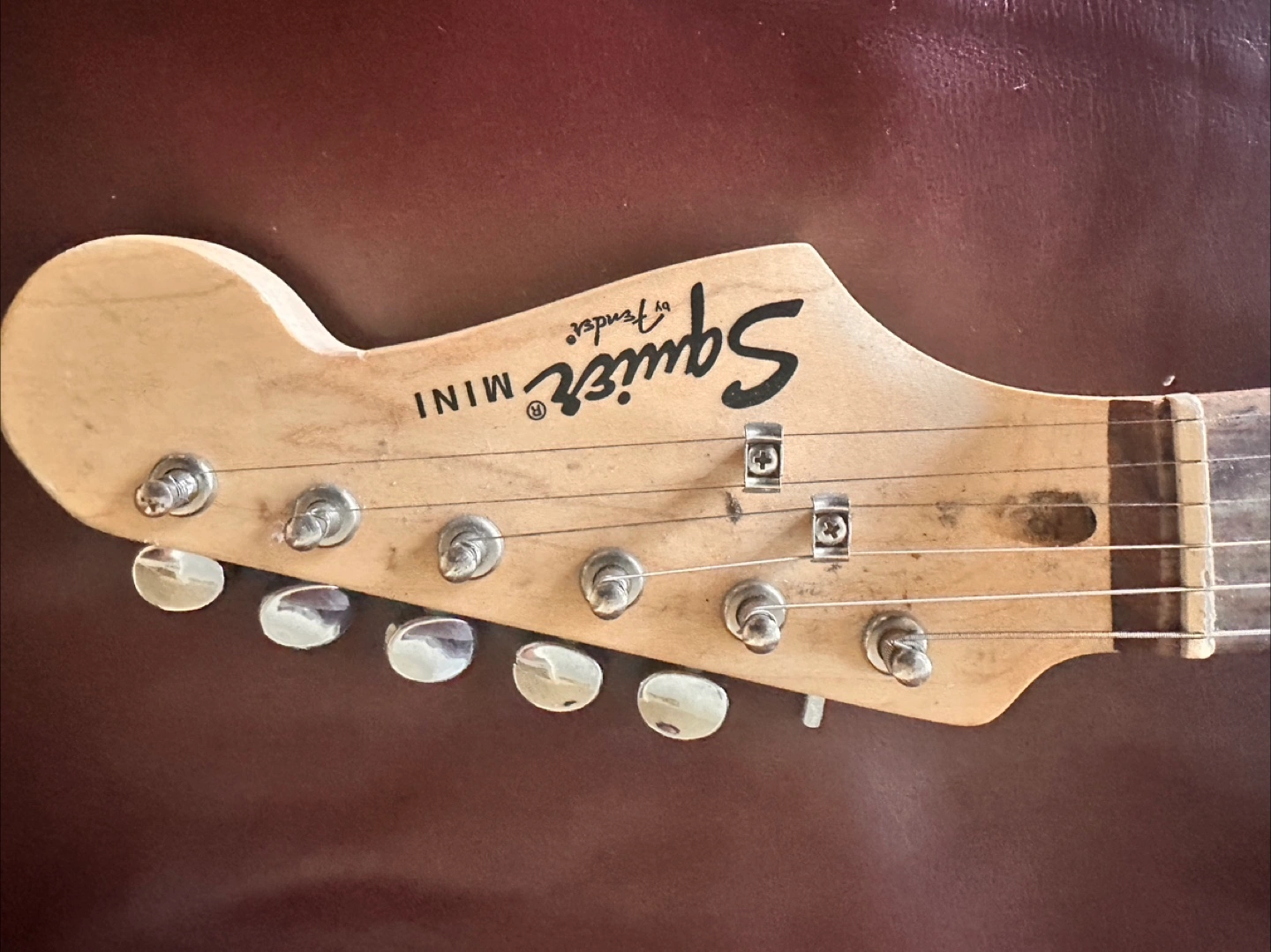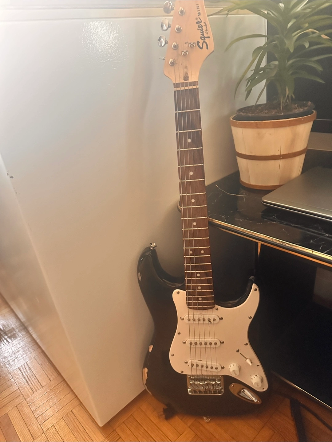 Black Squier Mini Stratocaster. Shows wear. Six strings. Good for beginners. Includes guitar only.