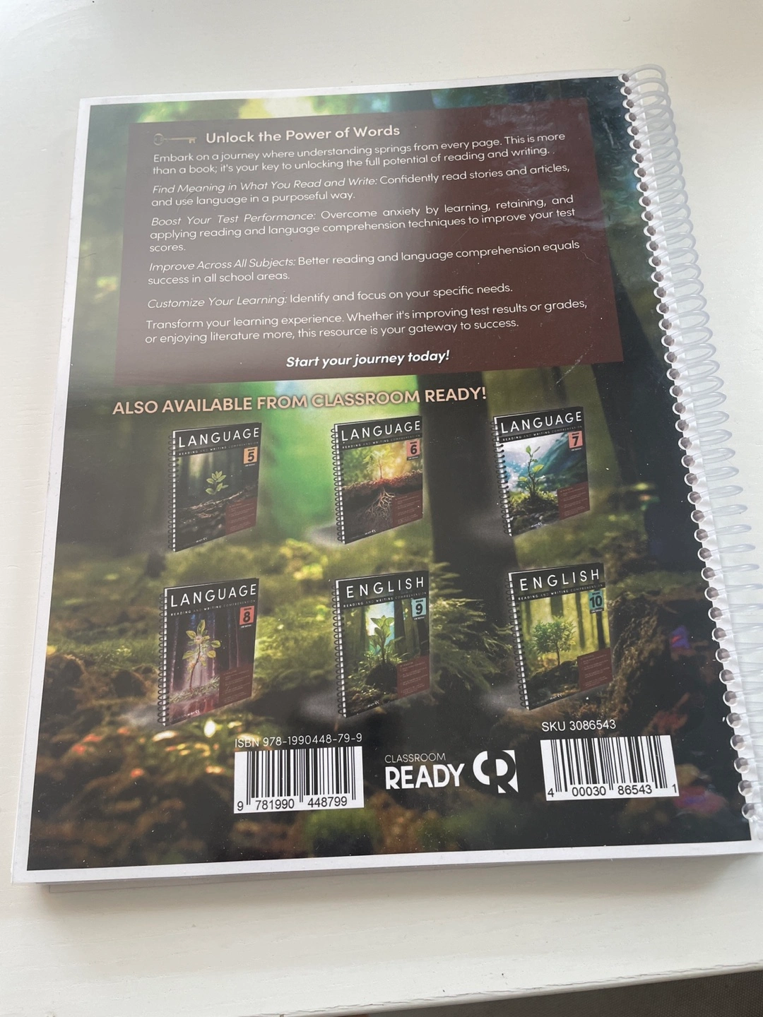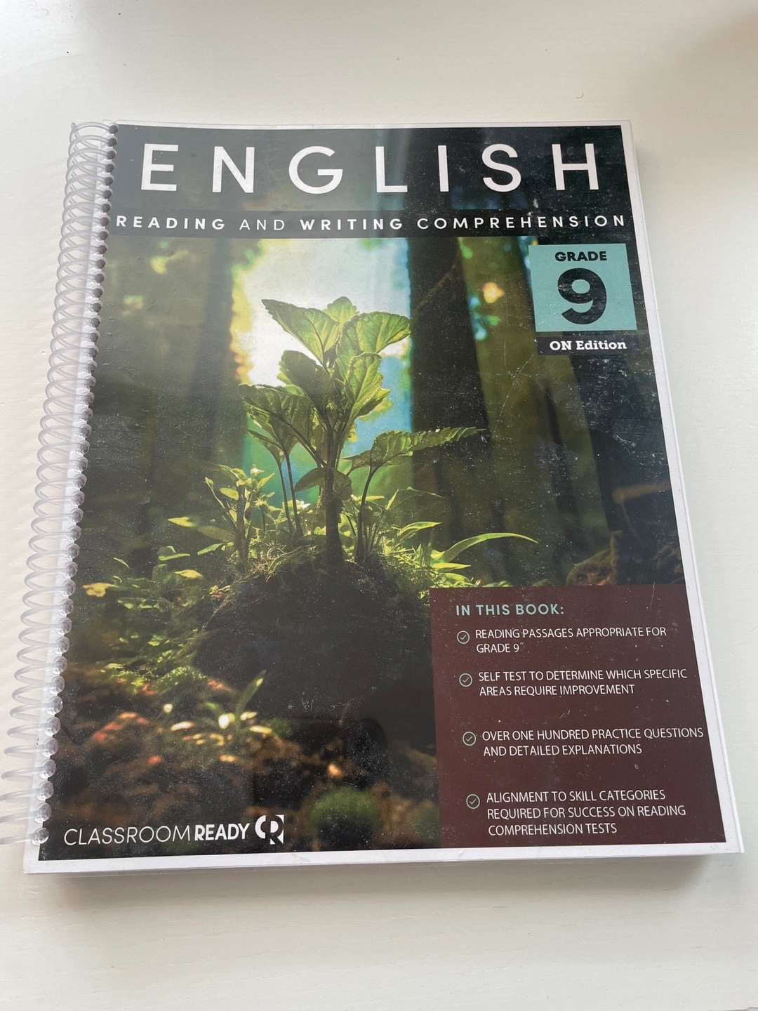 Grade 9 English workbook. Reading and writing comprehension exercises. Over one hundred practice questions. Self-test to determine areas needing improvement. Detailed explanations. Spiral bound.