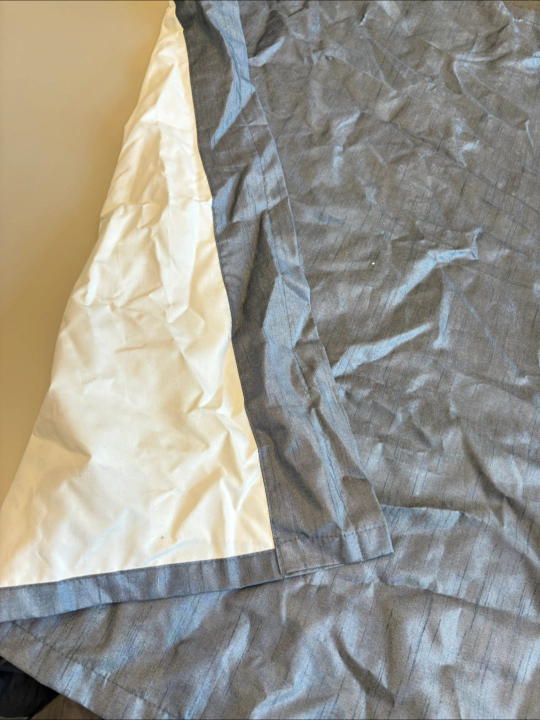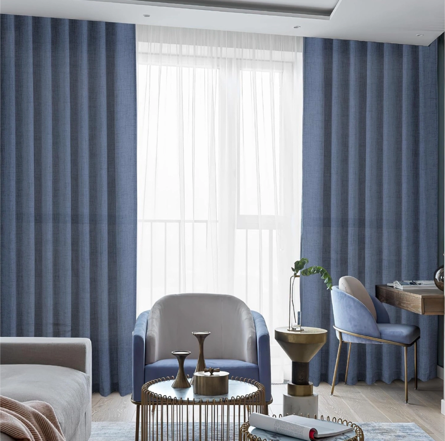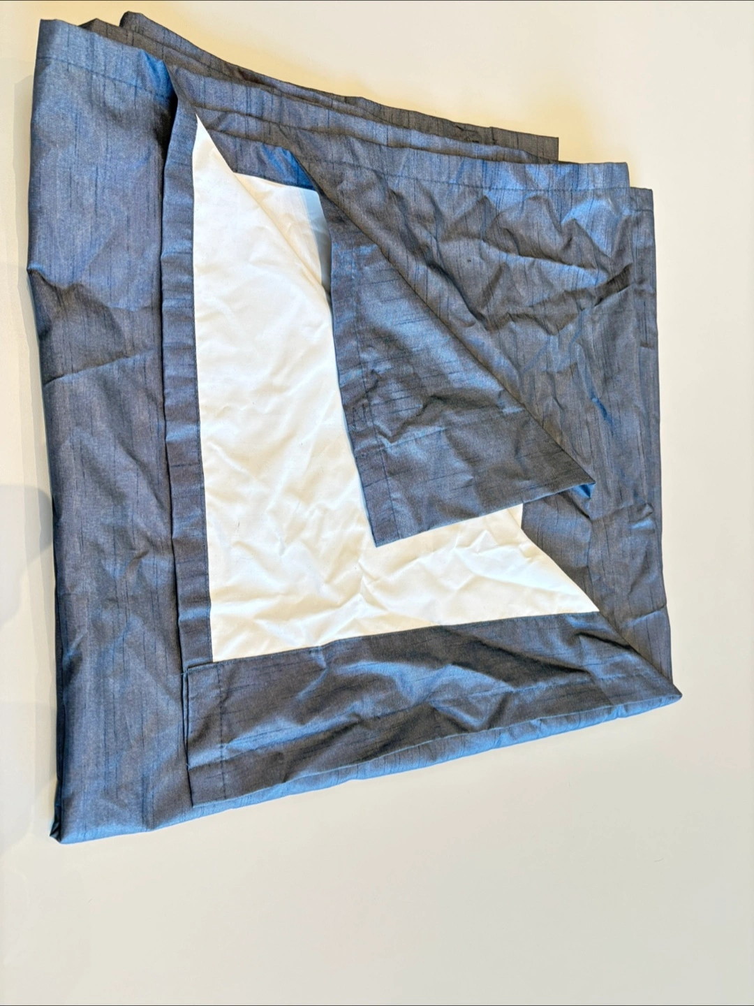 581Beautiful blue curtains, linen look fabric. Set of two panels. White lining. Adds a touch of elegance to any room. 8$ each
