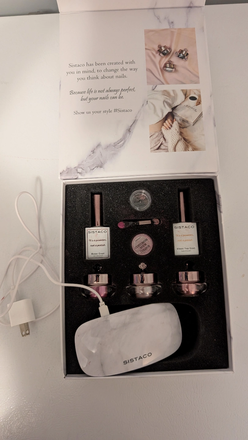 SISTACO nail powder kit. Includes three pink color powders and small UV lamp.