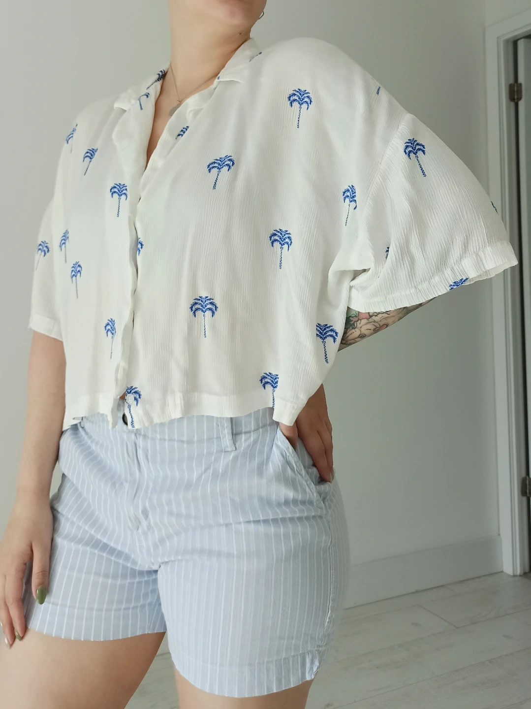 Adorable cropped button-up shirt. Features a palm tree print. Short sleeves. Size XL.