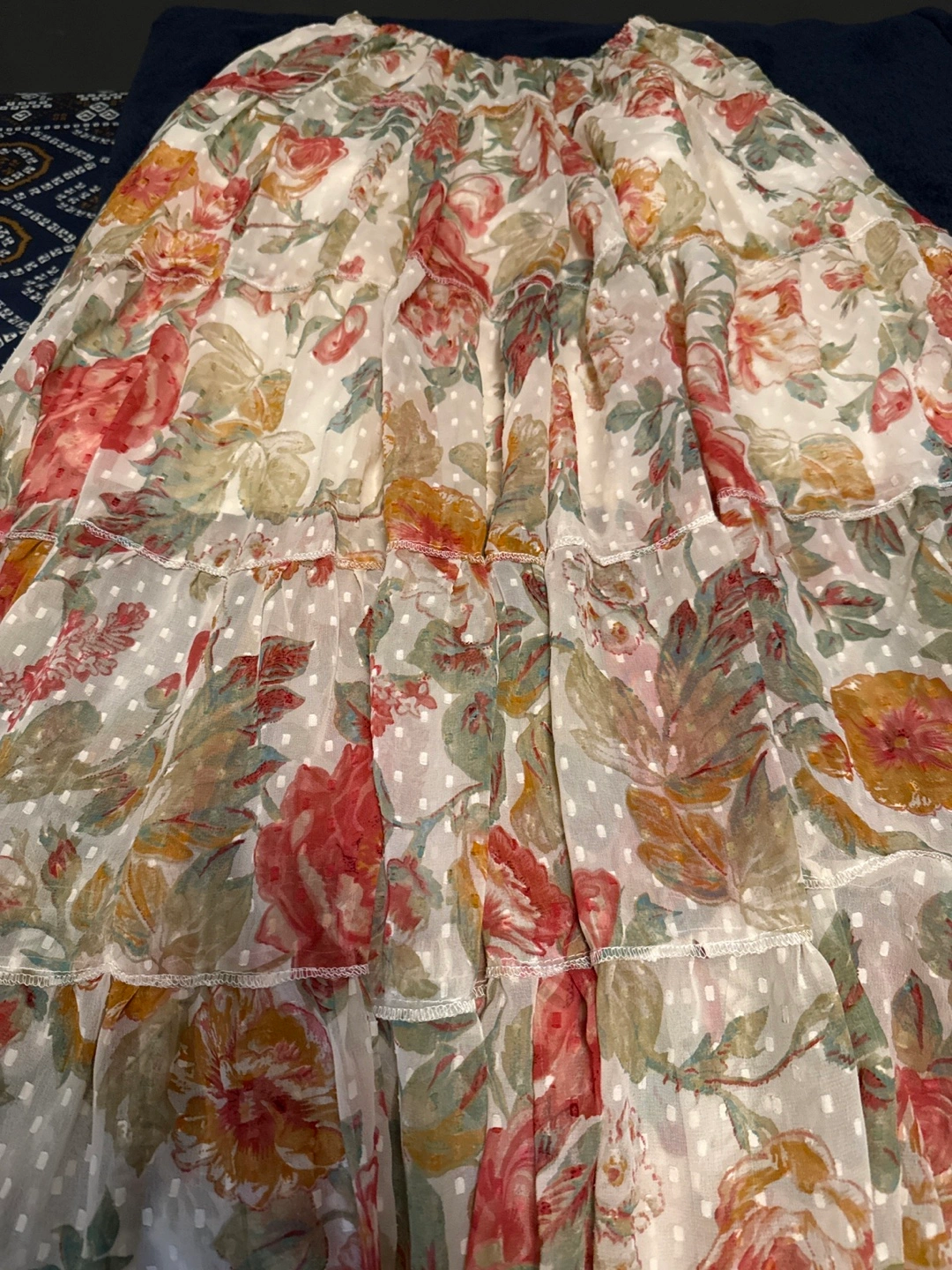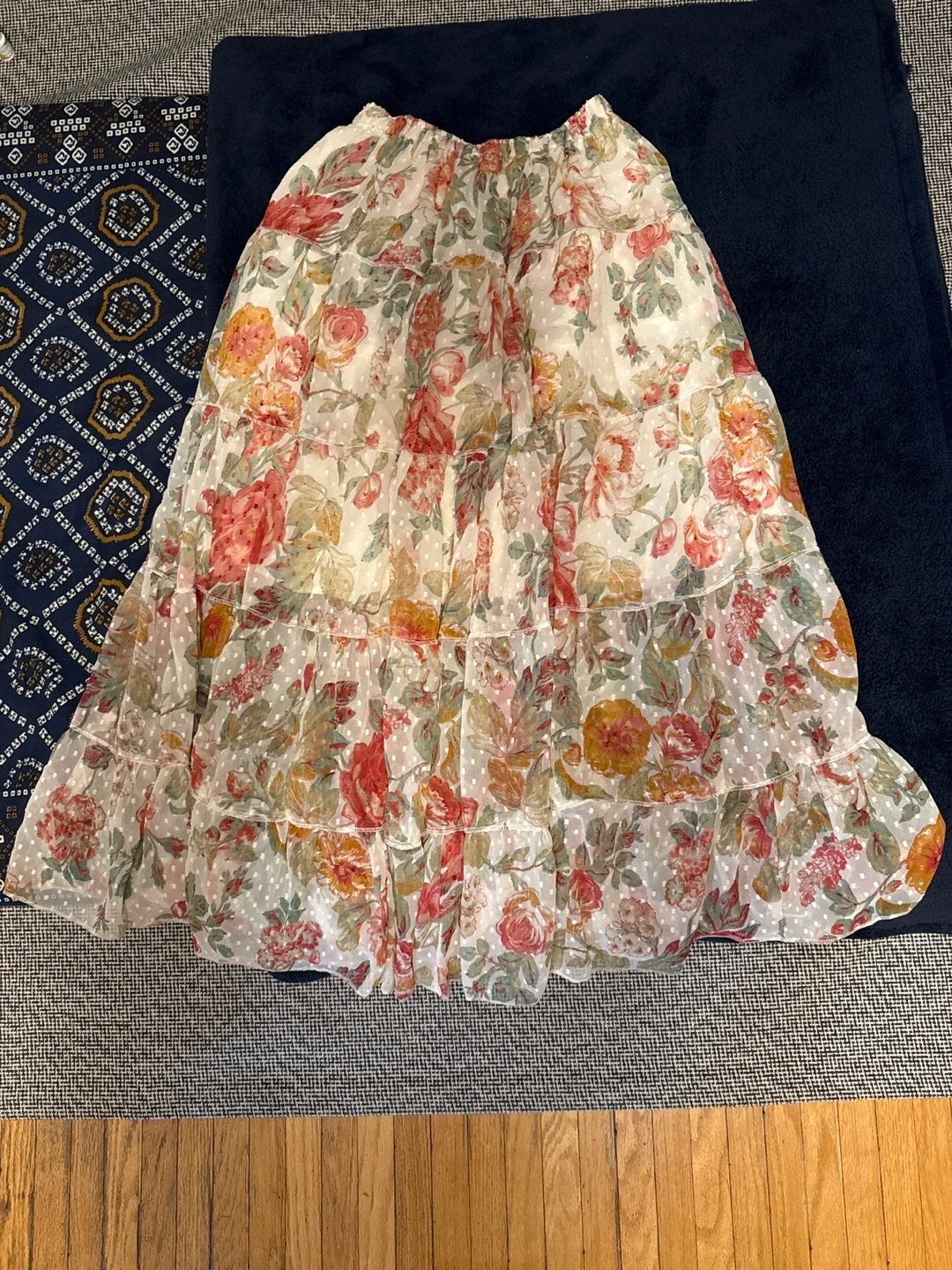 Beautiful vintage maxi skirt. Features a tiered design and floral print on a sheer fabric. Lovely colours and unique style. Worn once