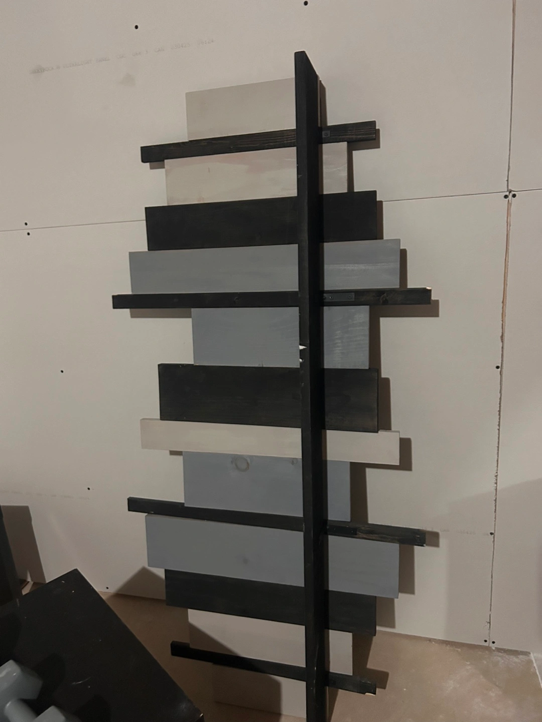 60Unique wall hanging. Grey and black wood. Modern design with shelve. Adds character to any room.