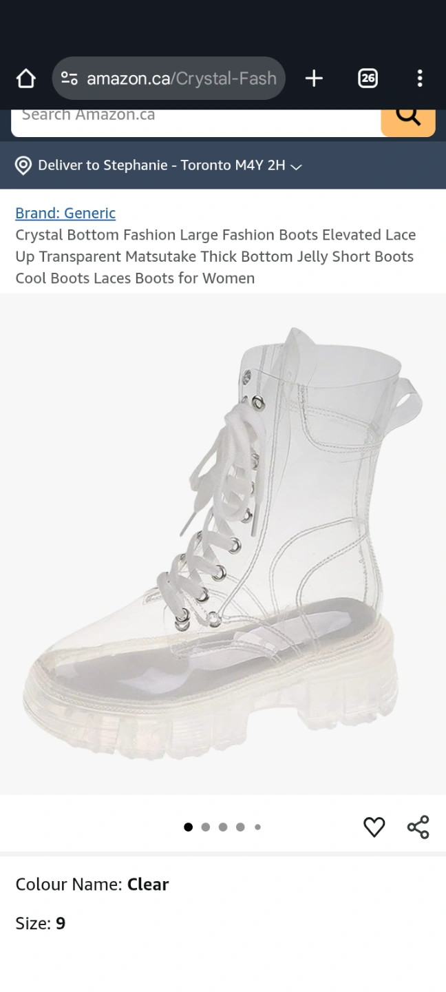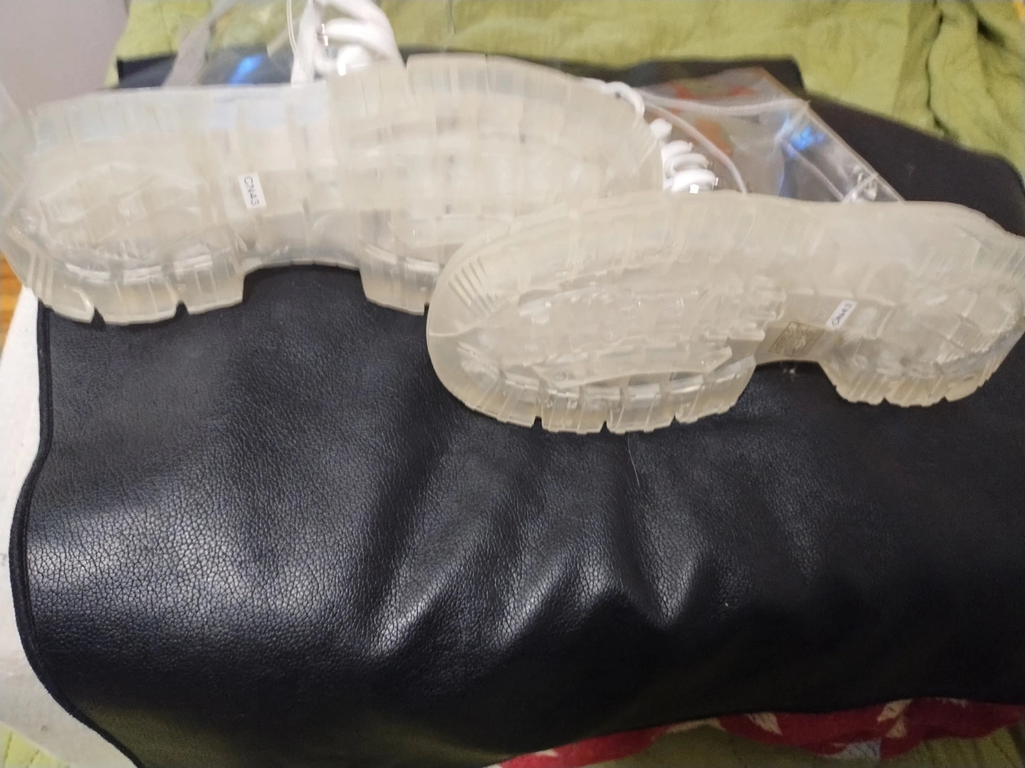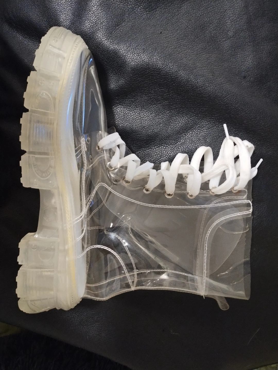 Unique women's transparent see-through platform boots. Lace-up combat boot style. Thick, chunky sole. Size 43CN, fits US 10. Clear/translucent material. Never worn, sticker still on bottom.