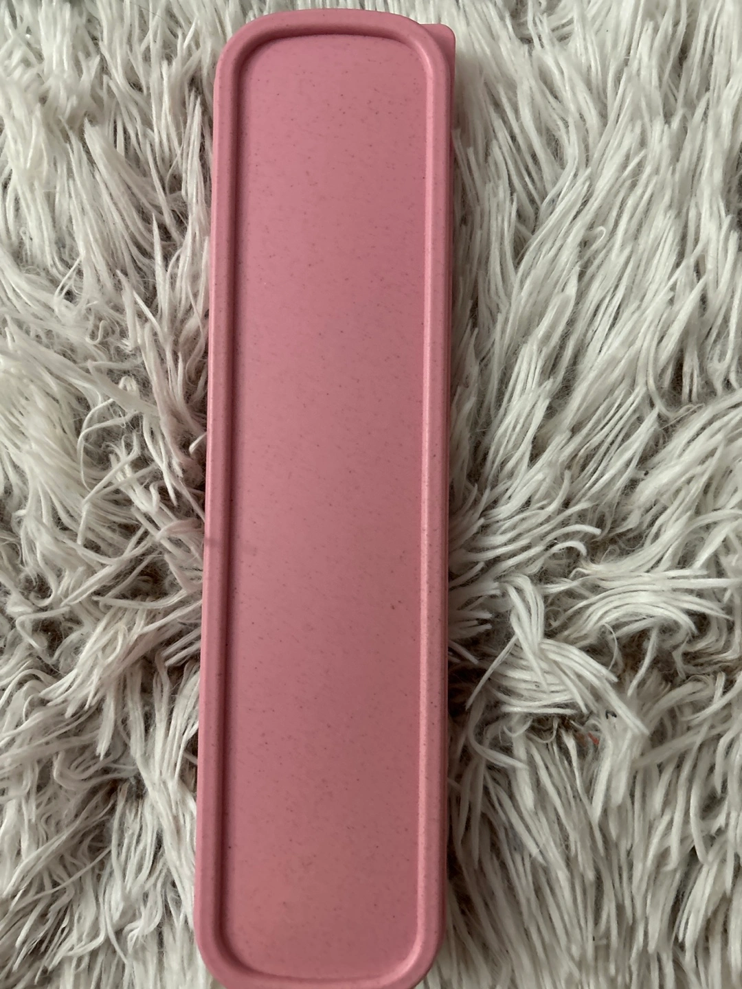Reusable cutlery set. Includes chopsticks, spoon, and fork. Pink carrying case. Convenient for travel or lunch.