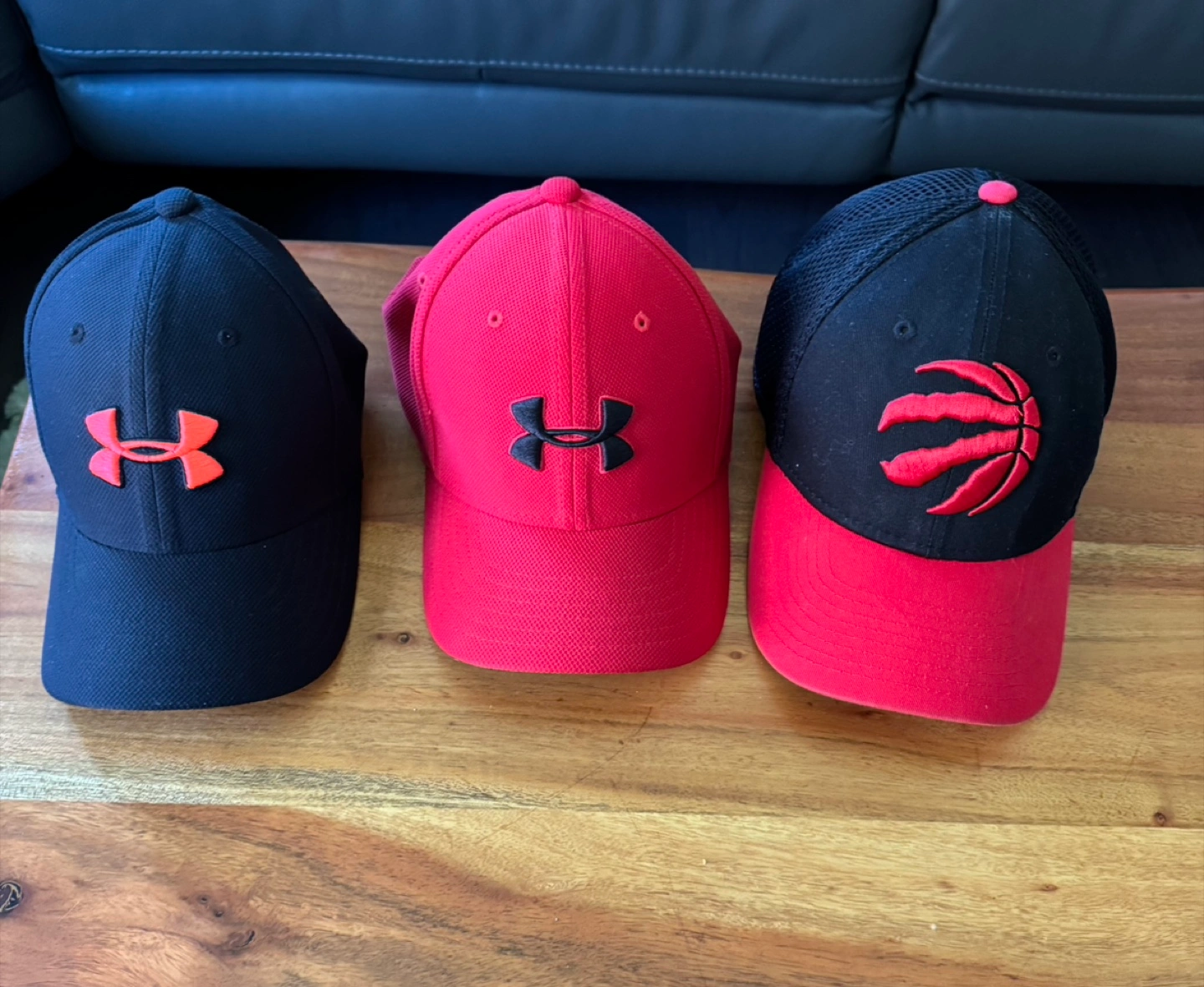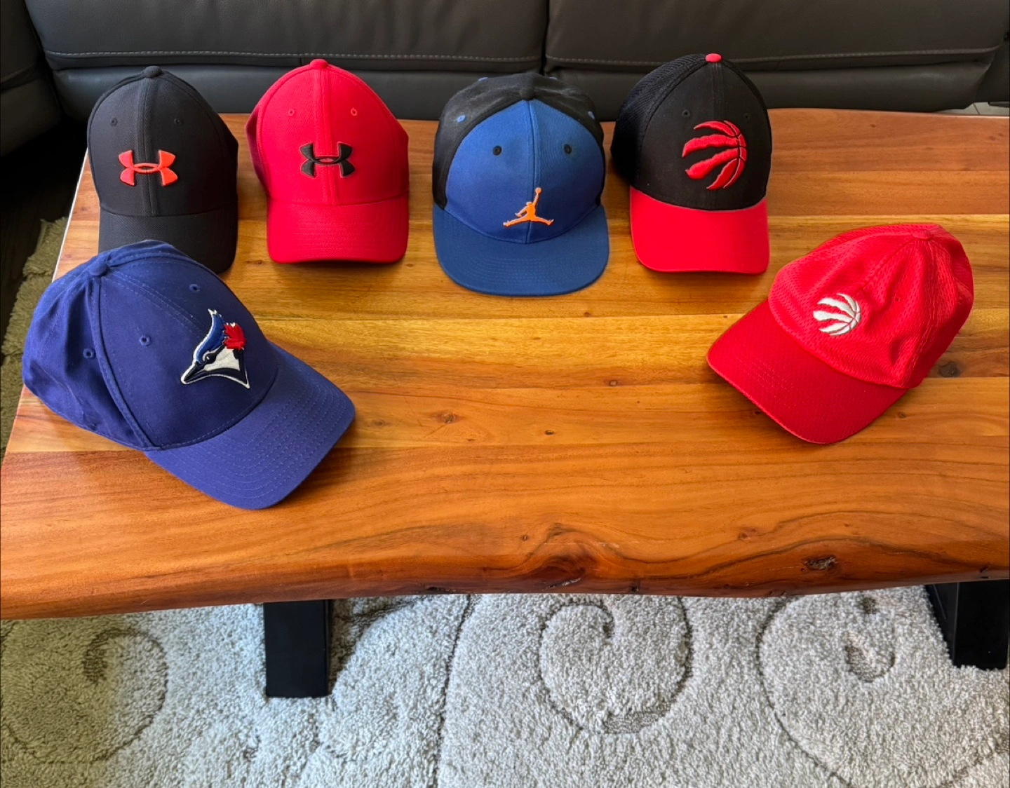 Bundle of six baseball caps. Includes Toronto Raptors, Toronto Blue Jays, and Jordan Brand. Two Under Armour caps included. Good condition. Great for sports fans!