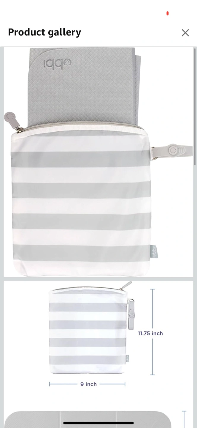 Grey and white striped waterproof changing mat with matching zippered carrying case. Portable and convenient for travel. Includes a small carrying handle.