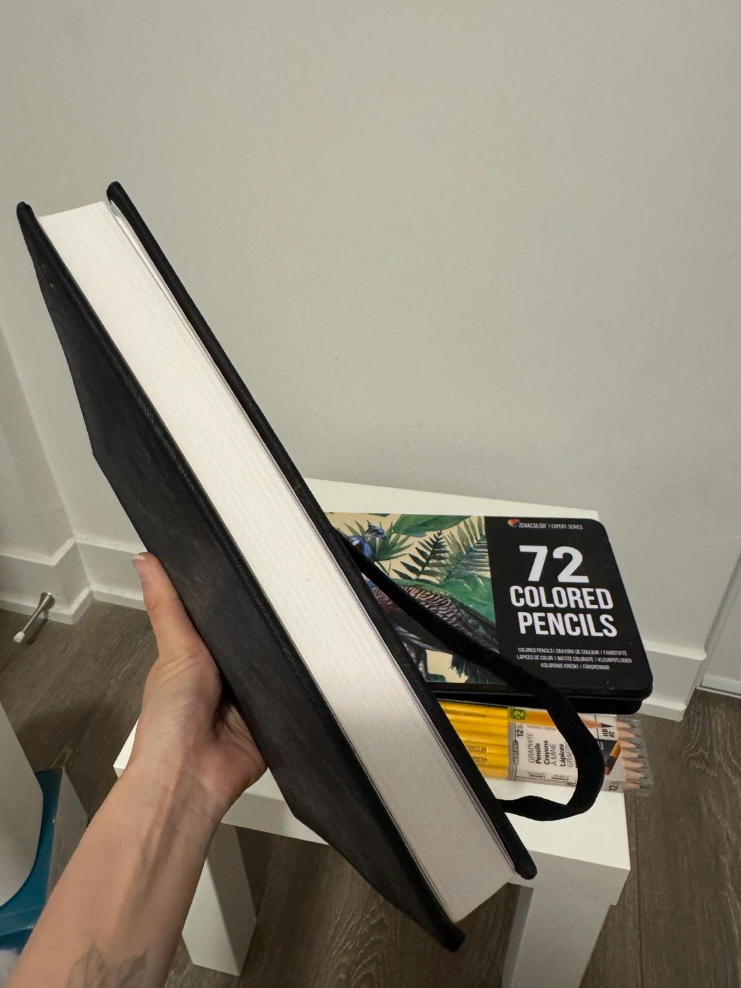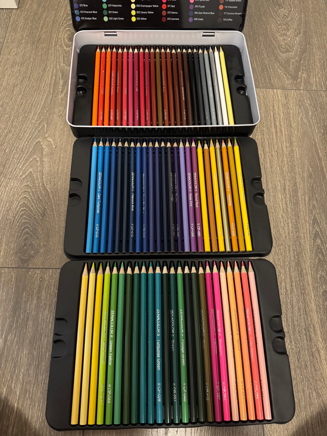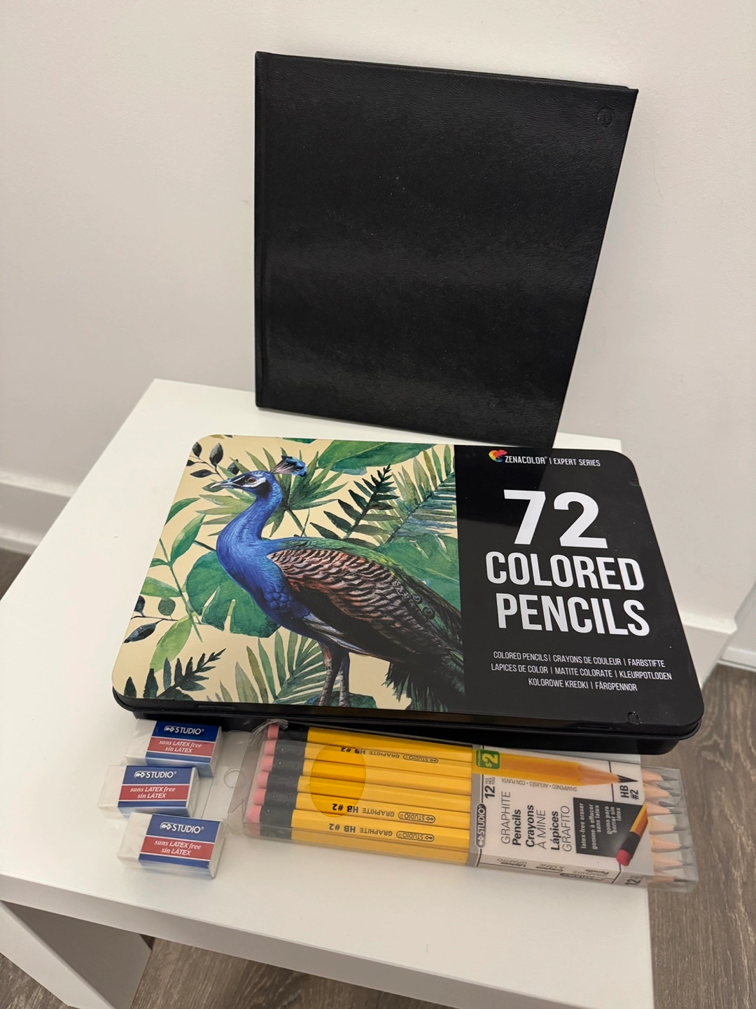Zencolor 72 coloured pencils in a metal tin. Includes a large black sketchbook (thick papers for drawings and paintings). Also includes extra erasers and graphite pencils.