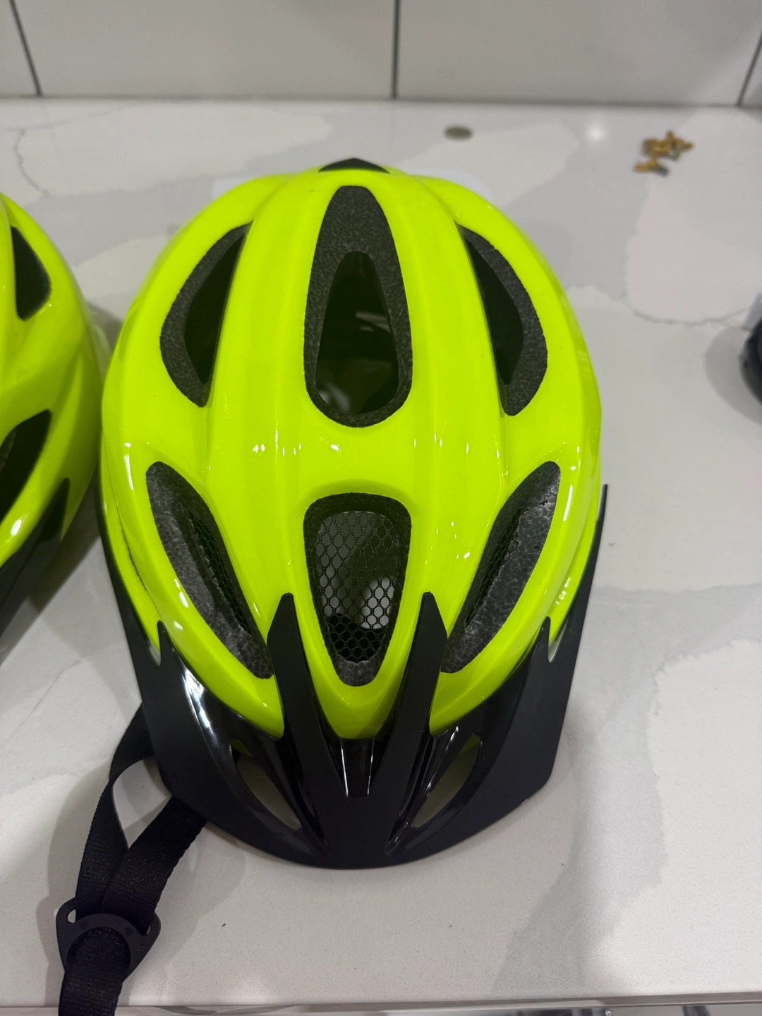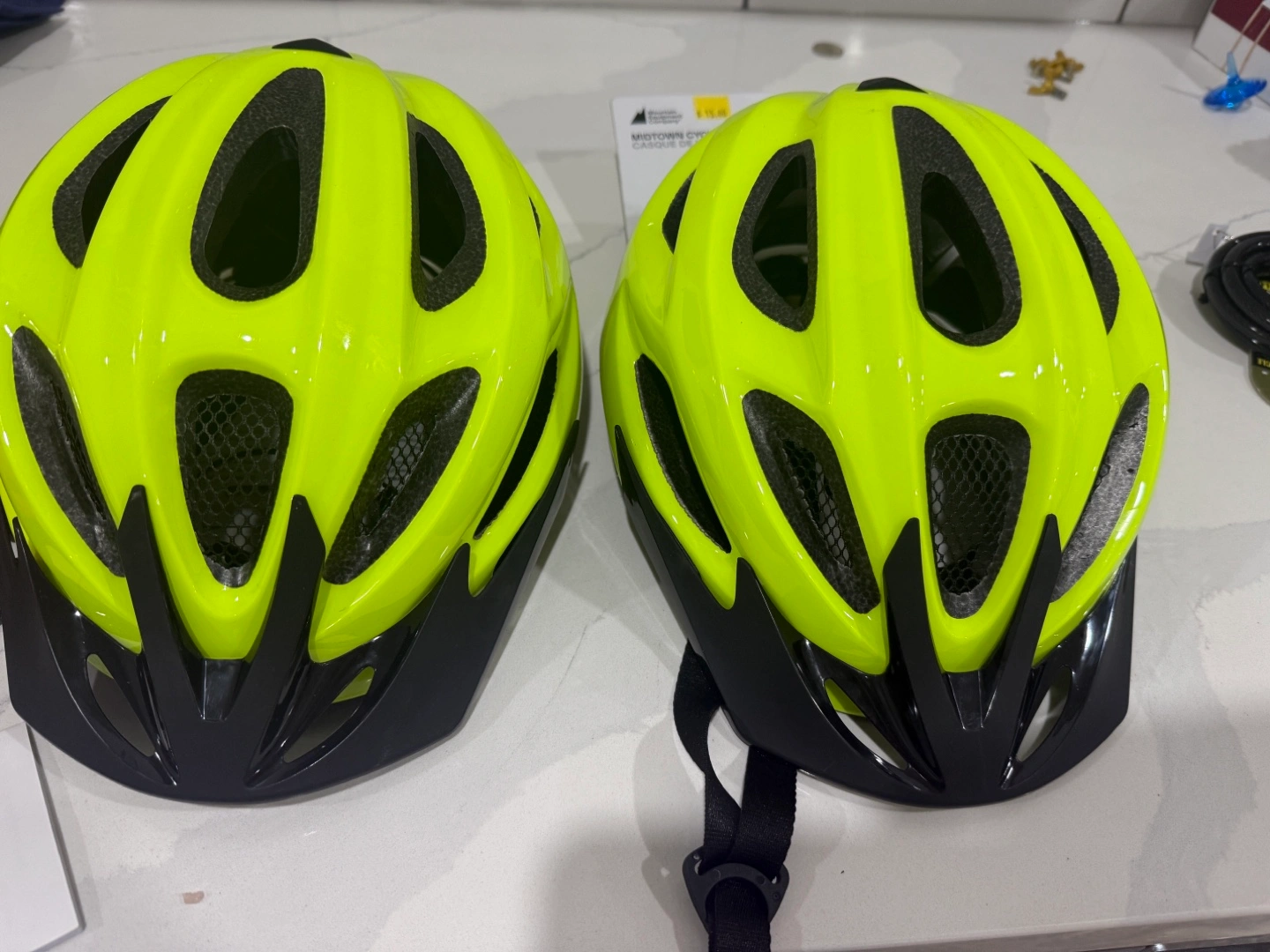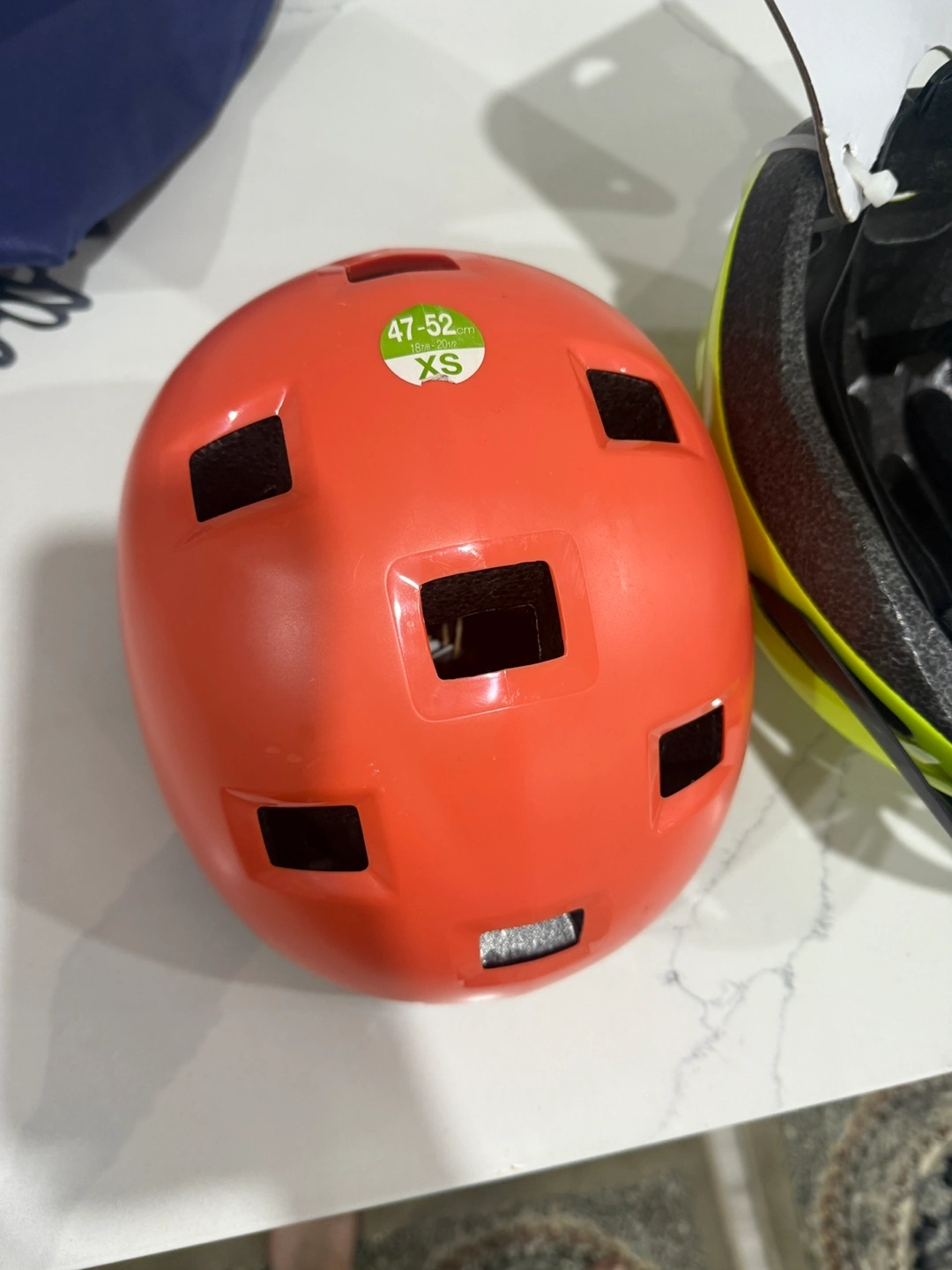 Two MEC kids' bike helmets. One orange, size XS (47-52 cm). One lime green, size S. Both in excellent condition. Includes instruction manuals. Green hats are for older kids Only orange is small They are new with the teg 20 is green And orange is 15