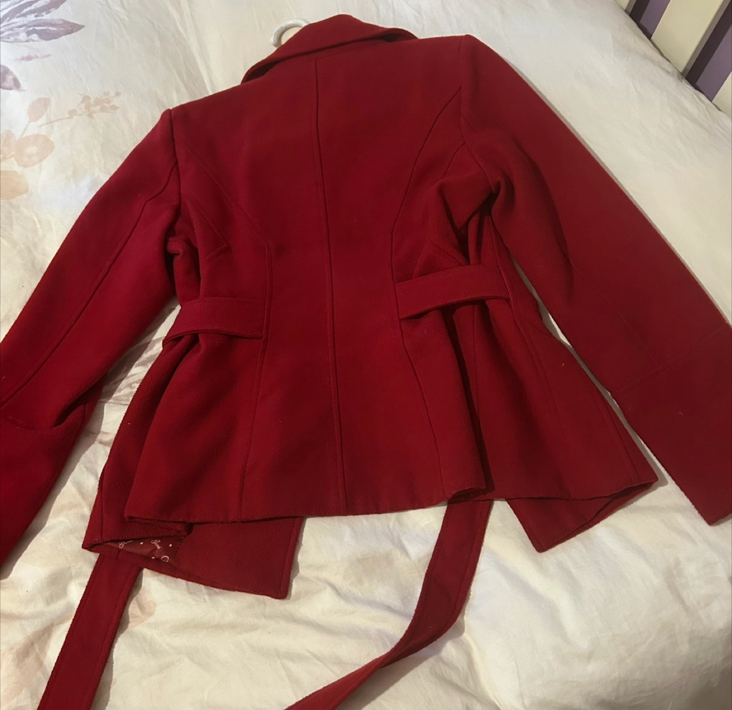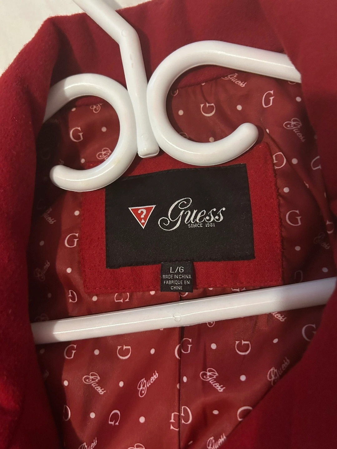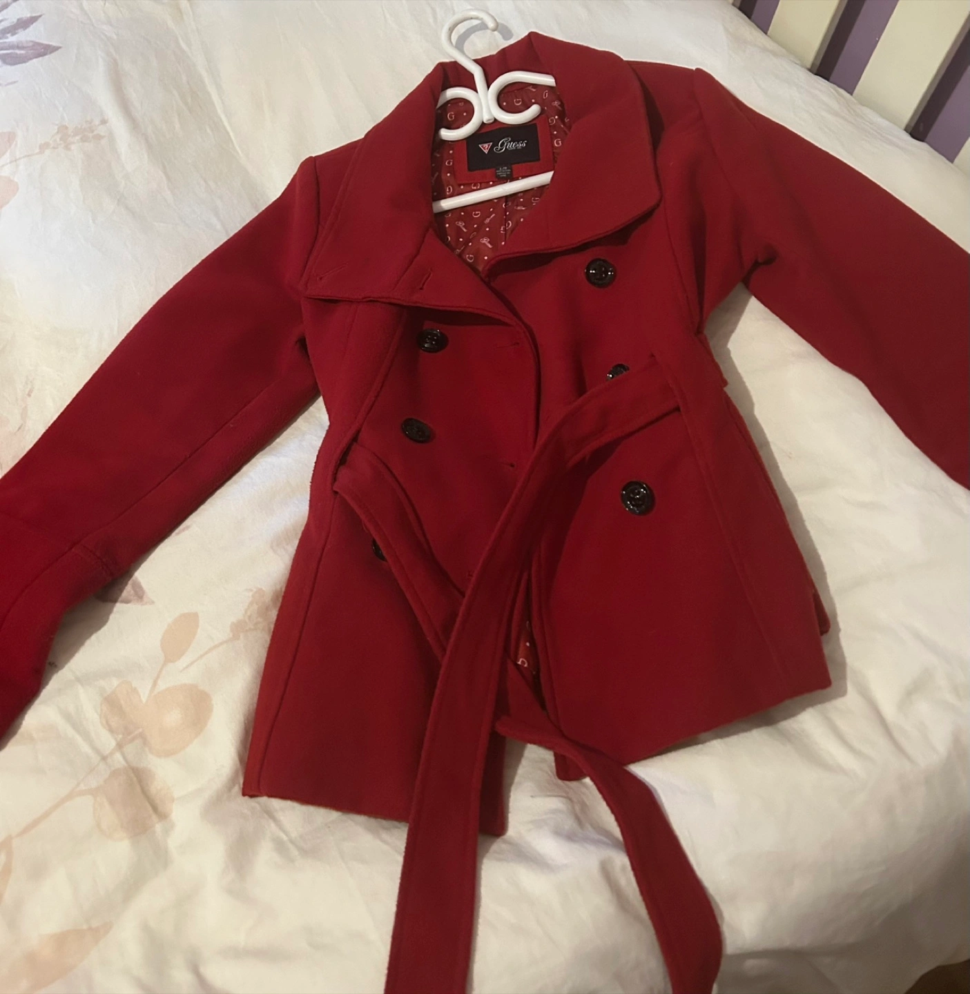 Gorgeous red peacoat. Double-breasted with a self-tie belt. Features a collared neckline. Fully lined with a Guess logo print. Size L/G.