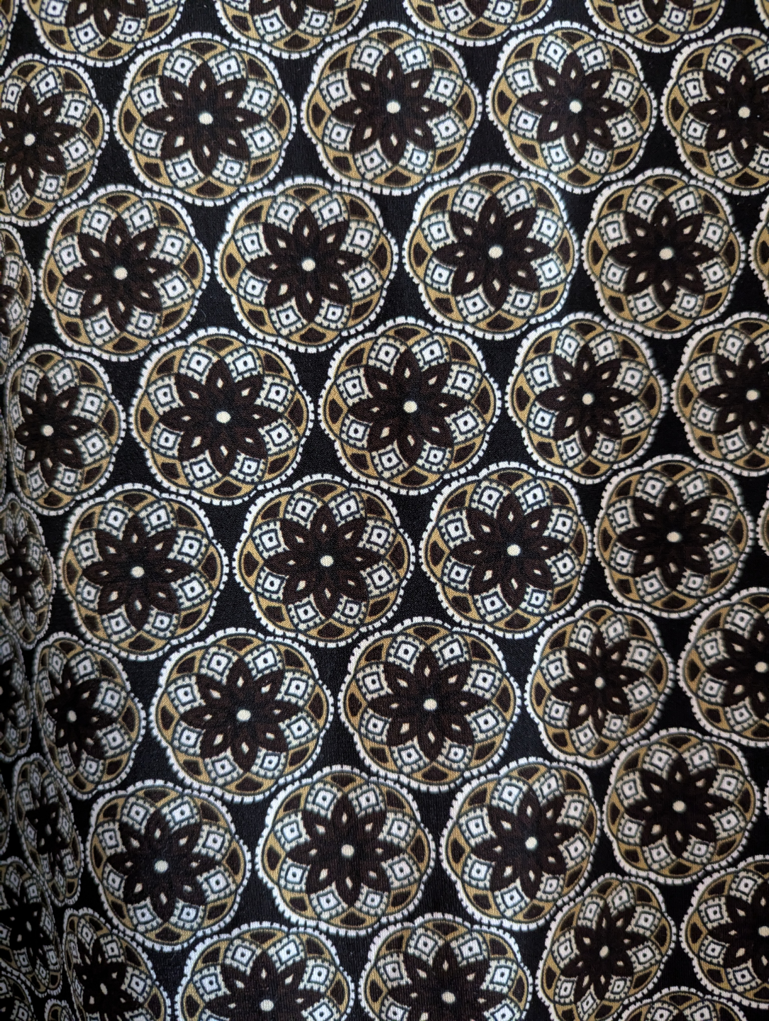 A-line skirt. Black background. Gold and white geometric pattern. Mid-length. Elastic waistband. Excellent condition.