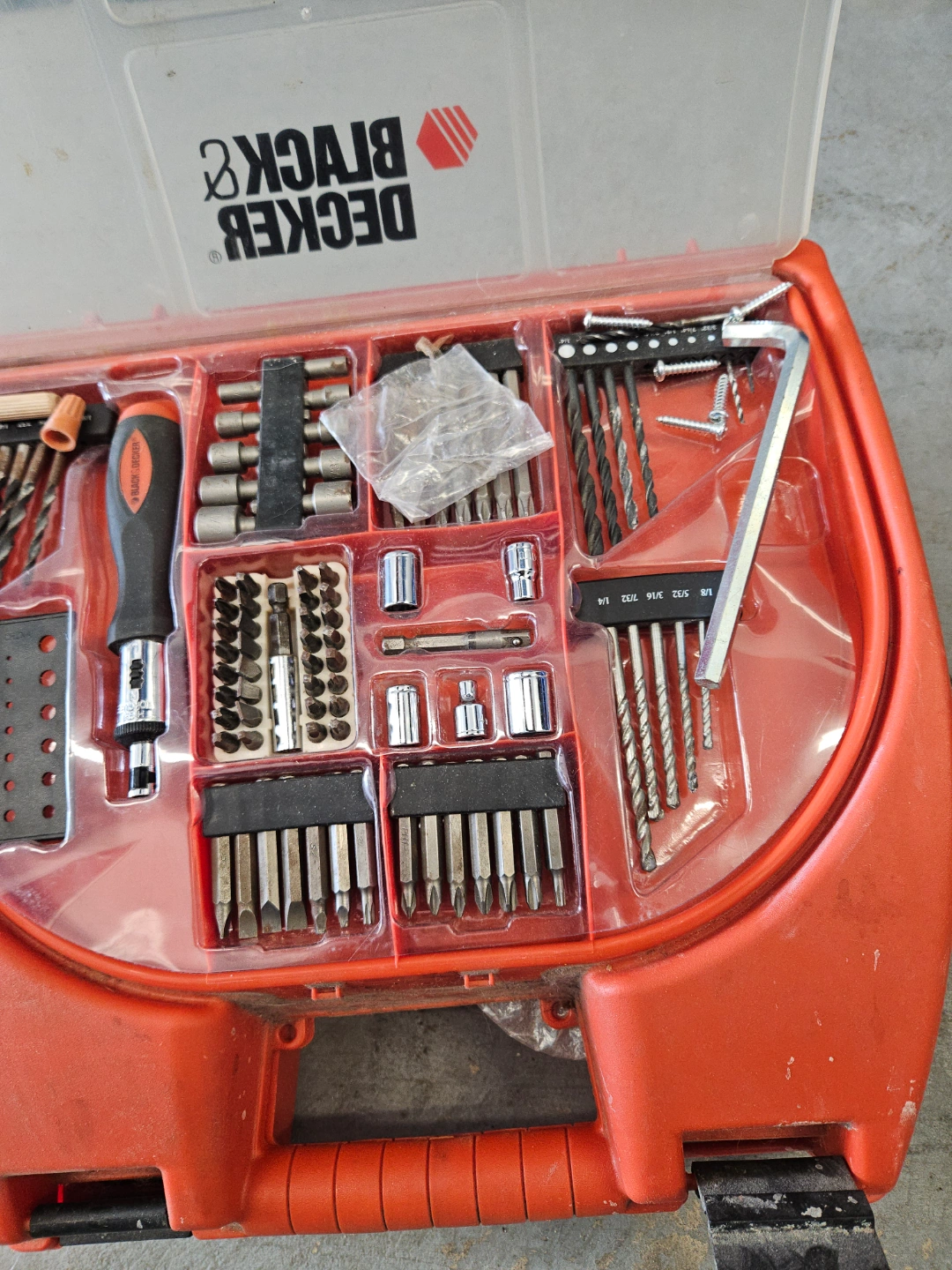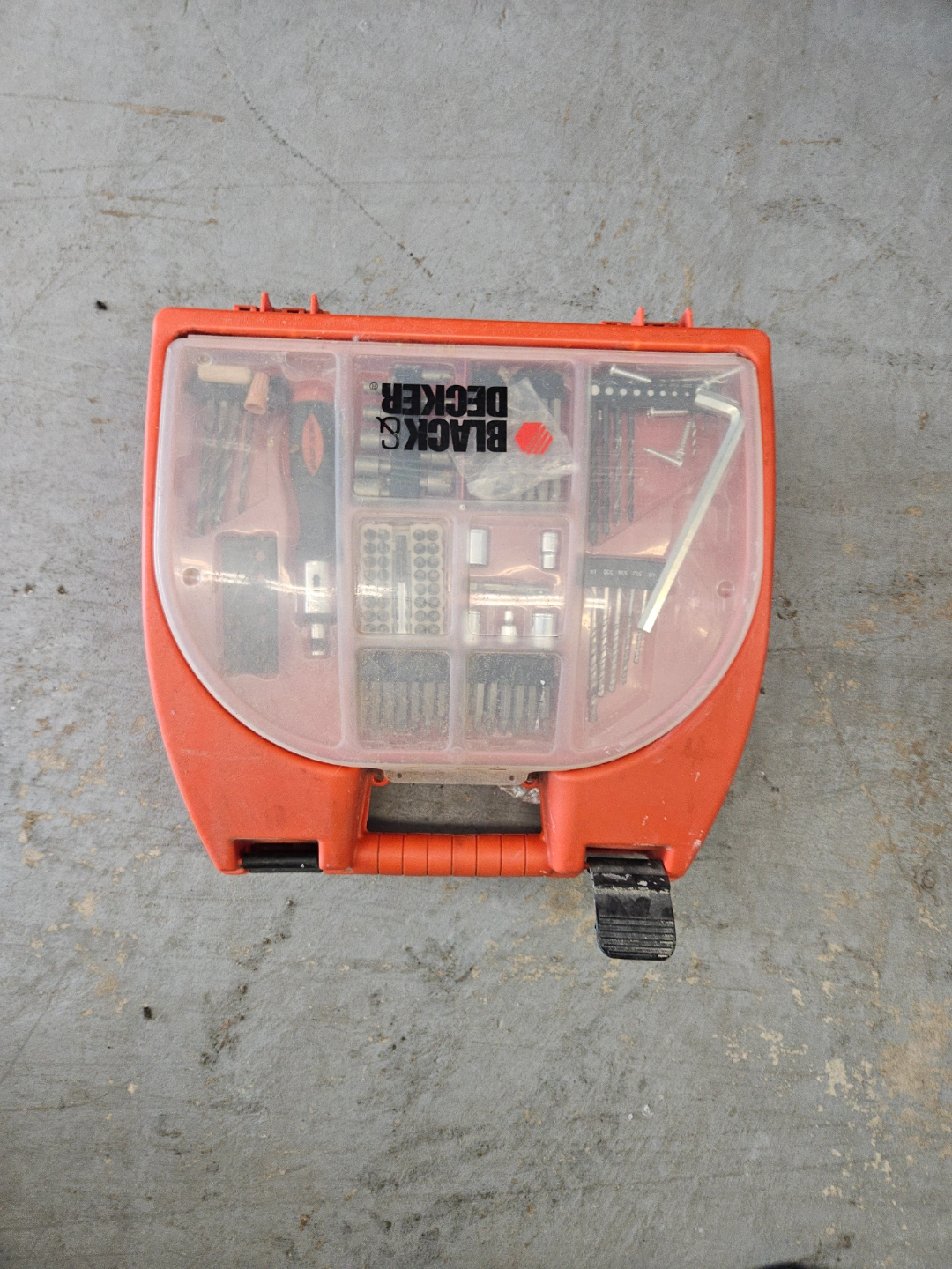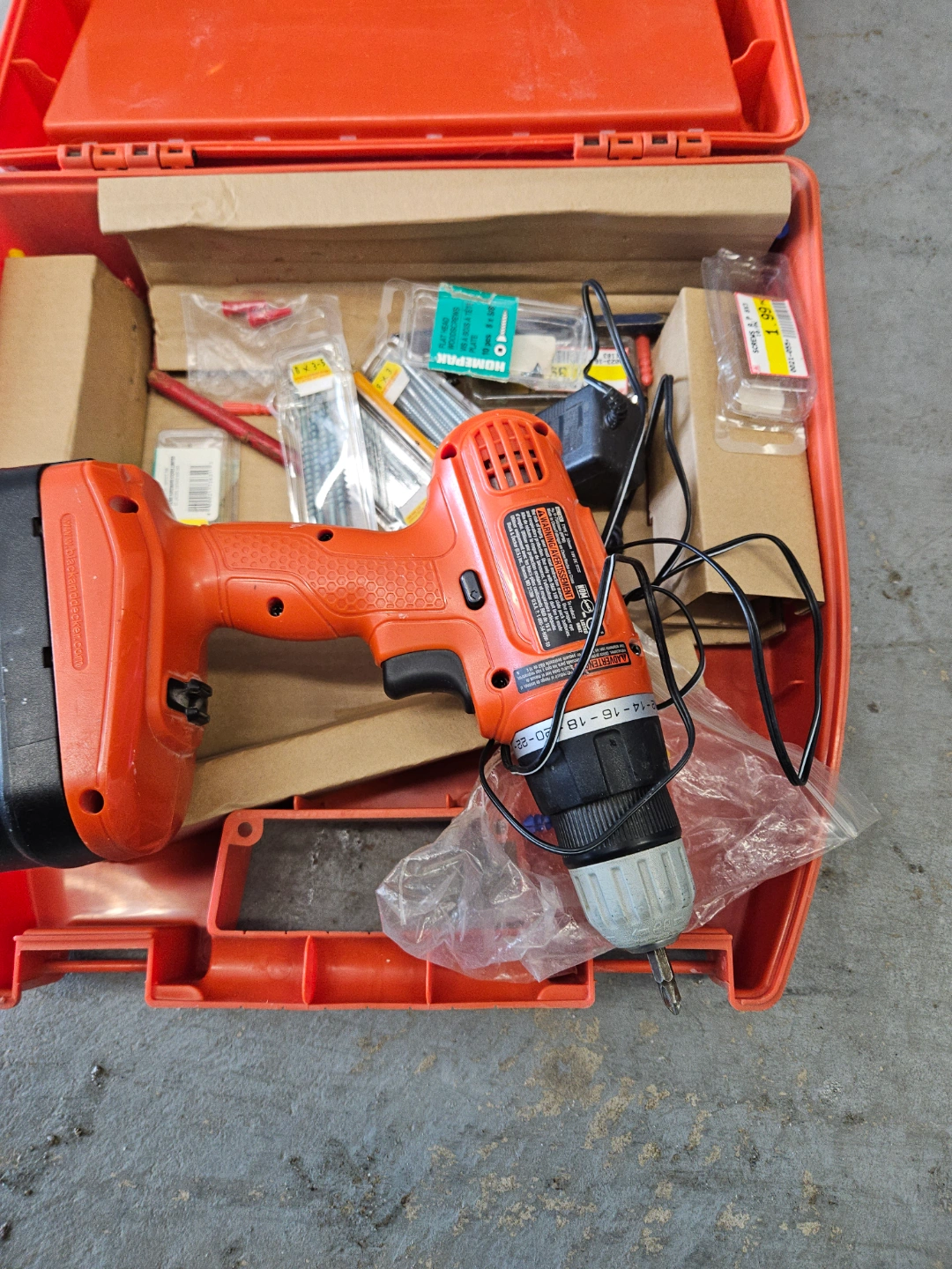 Pre-owned Black & Decker cordless drill. Includes various drill bits, screwdriver bits, and other accessories. All housed in a convenient carrying case. Great for DIY projects.