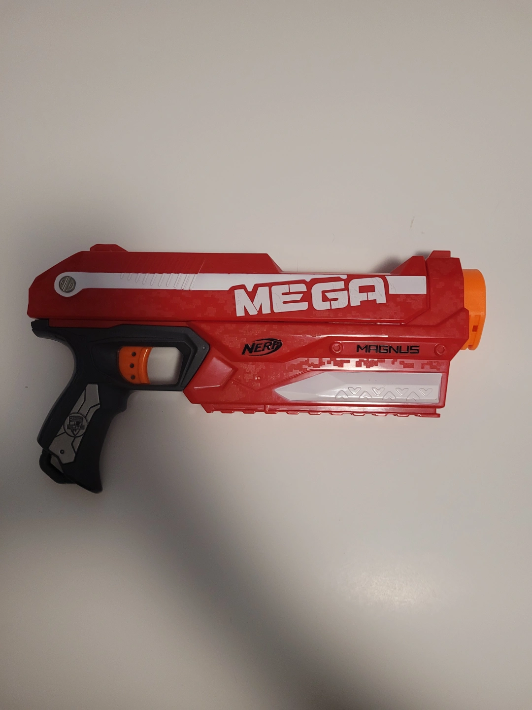 Red and white Mega Magnus blaster. Great for Nerf battles. Includes blaster only.