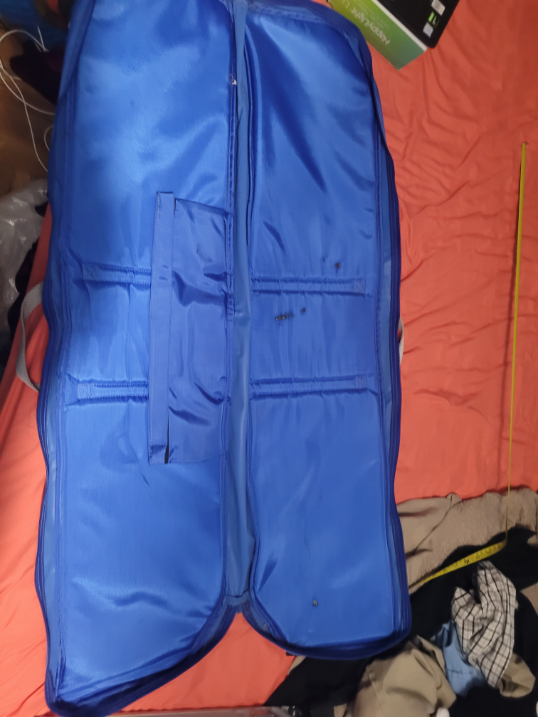 Long blue carrying case. Zipper closure. Multiple interior pockets. Carry handle. Great for storage and transport. 42 x 12