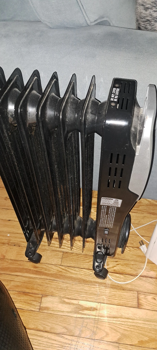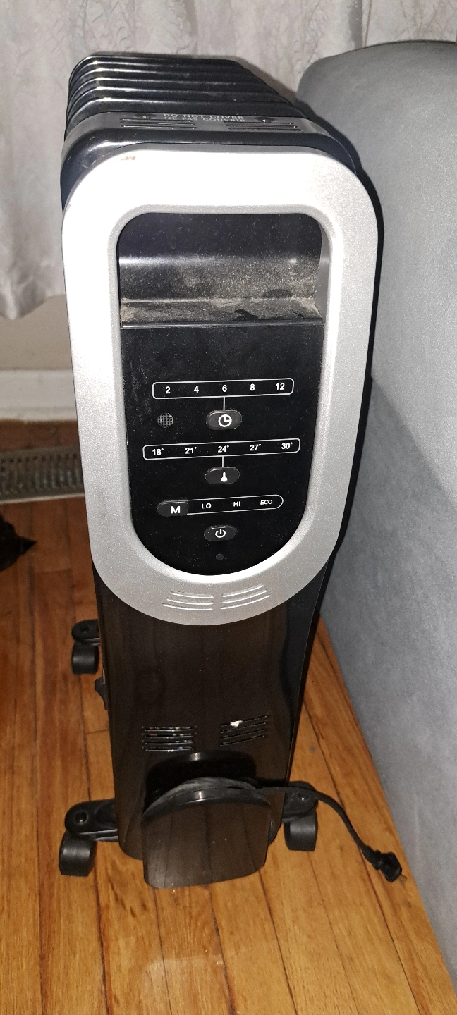Electric oil-filled radiator heater. Features adjustable thermostat, multiple heat settings, and overheat protection. Wheels for easy mobility. Good for smaller spaces.